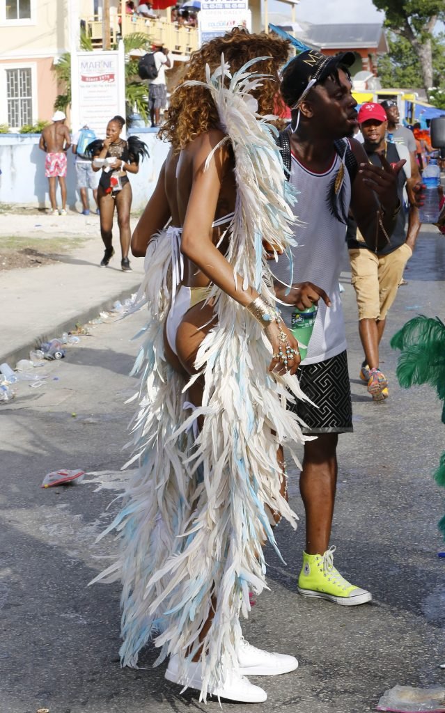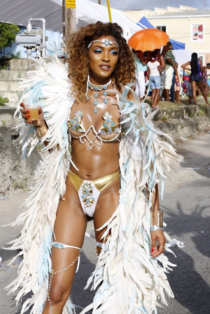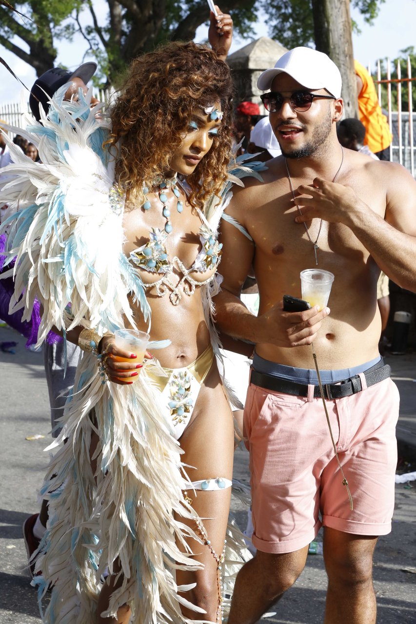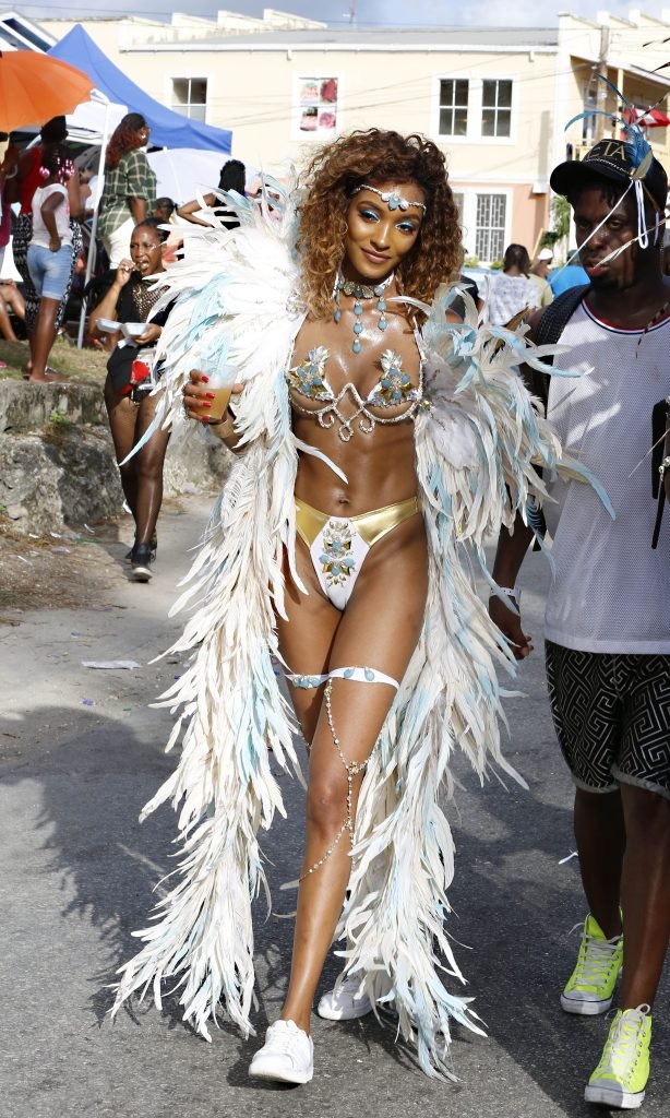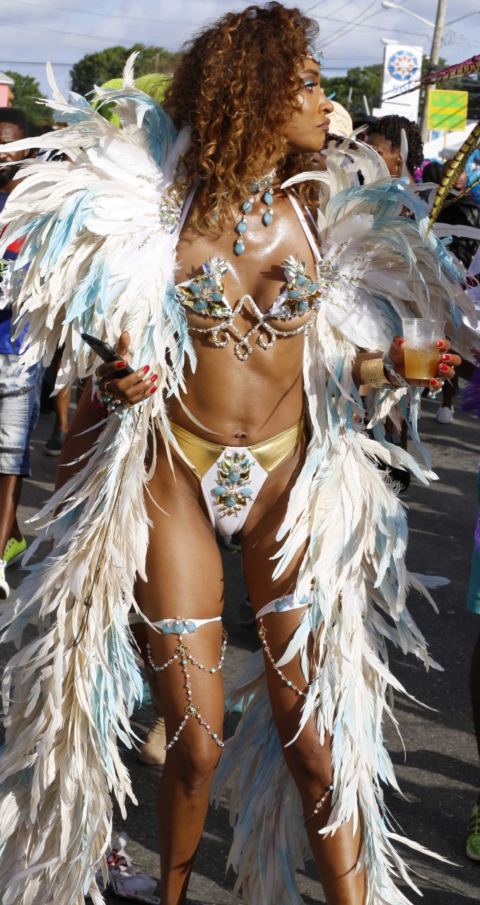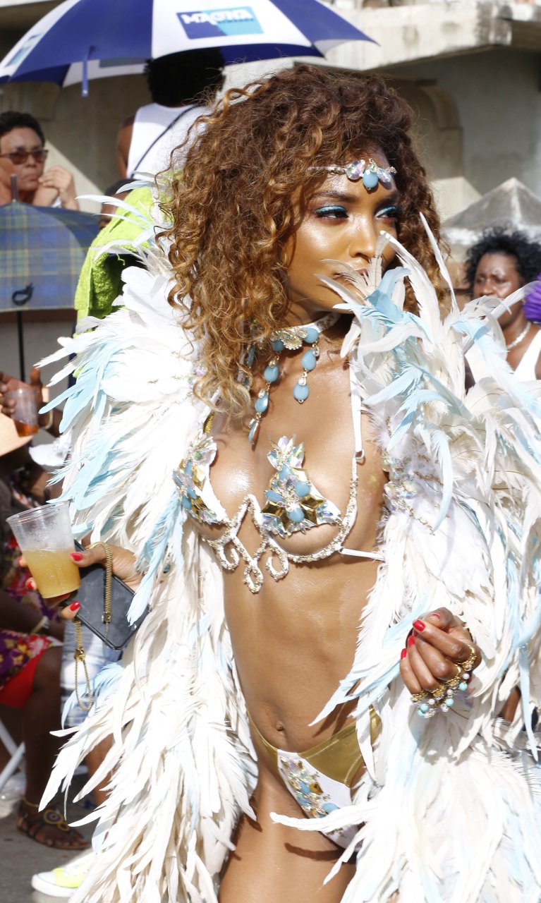 Model Jourdan Dunn es vista desfilando por las calles de Barbados con un disfraz blanco de plumas, 08/07/2017.