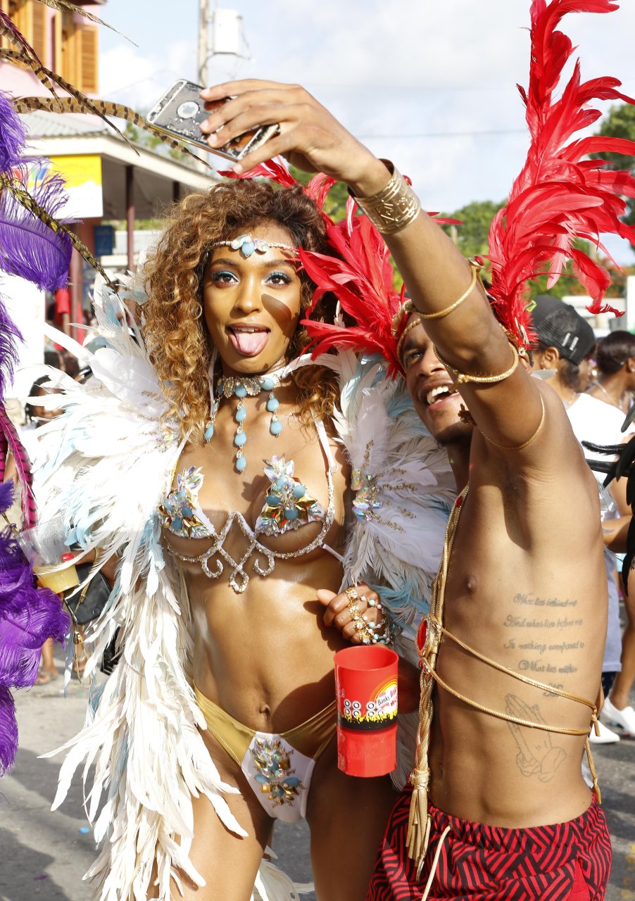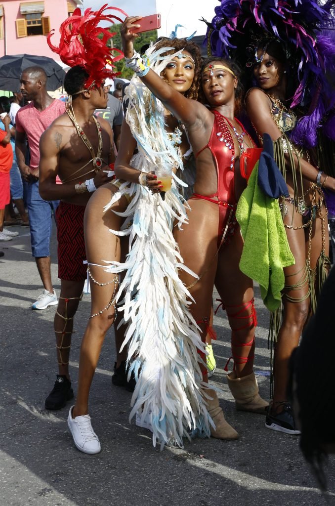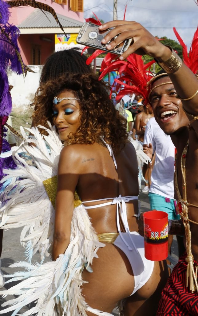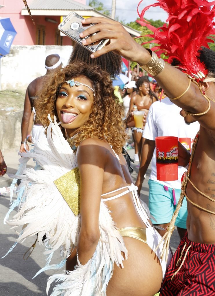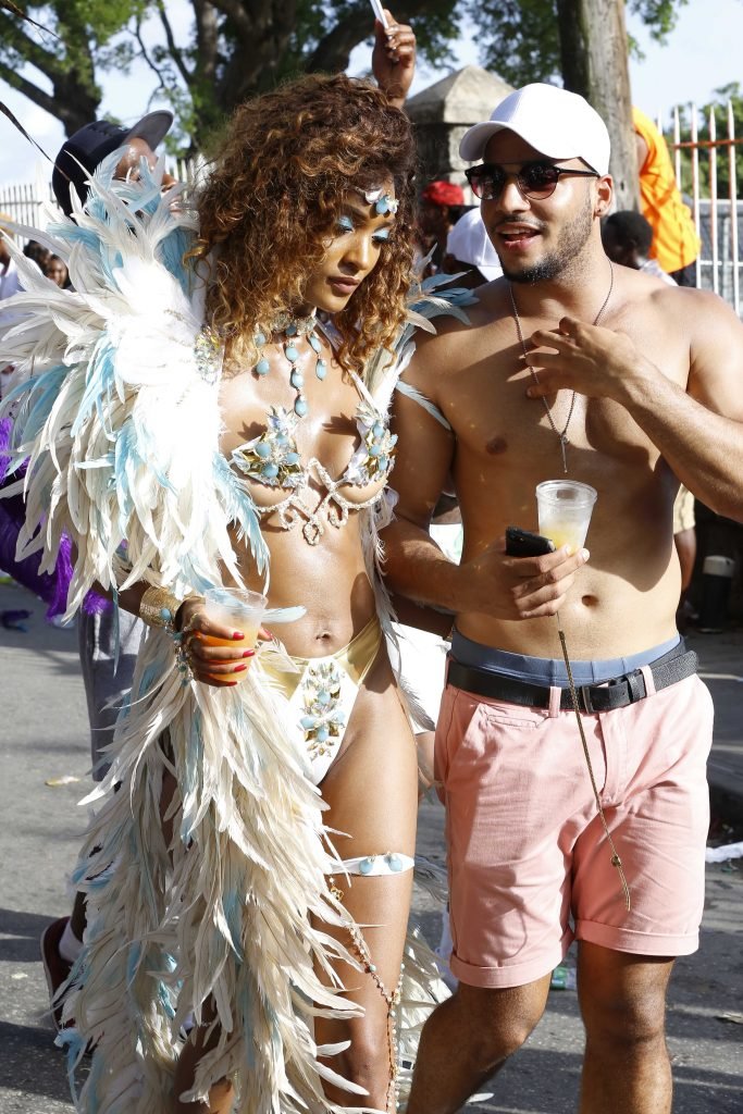 Model Jourdan Dunn es vista desfilando por las calles de Barbados con un disfraz blanco de plumas, 08/07/2017.