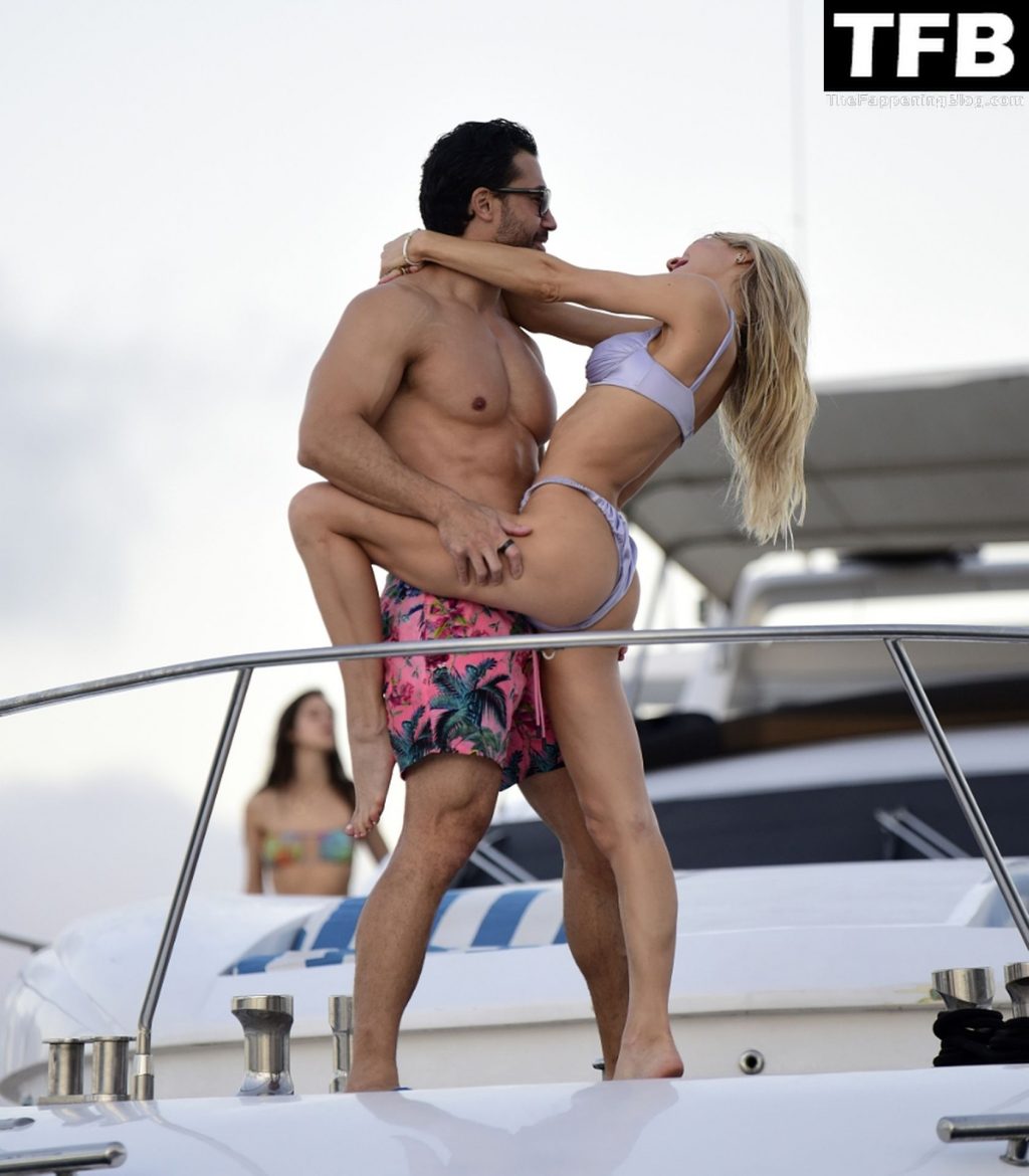 La modelo de Victoria’s Secret Joy Corrigan lleva un traje de baño escaso mientras es fotografiada de fiesta en un yate con su novio Mehran y amigos, 02/05/2022.