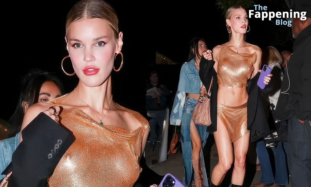 La modelo llevaba un pequeño top dorado que era tan ajustado y delgado que se podían ver sus pezones. Definitivamente se sentía segura de sí misma y sus pezones duros eran prueba de ello. Su figura esbelta y su rostro impresionante estaban completamente a la vista con este atrevido atuendo. Pero eso no es todo, completó su look con botas negras de tacón alto y enormes pulseras plateadas.