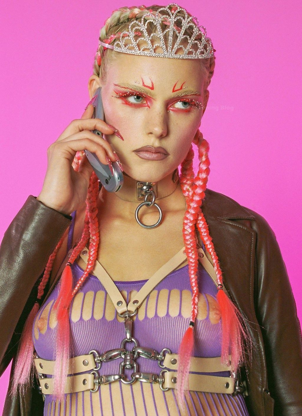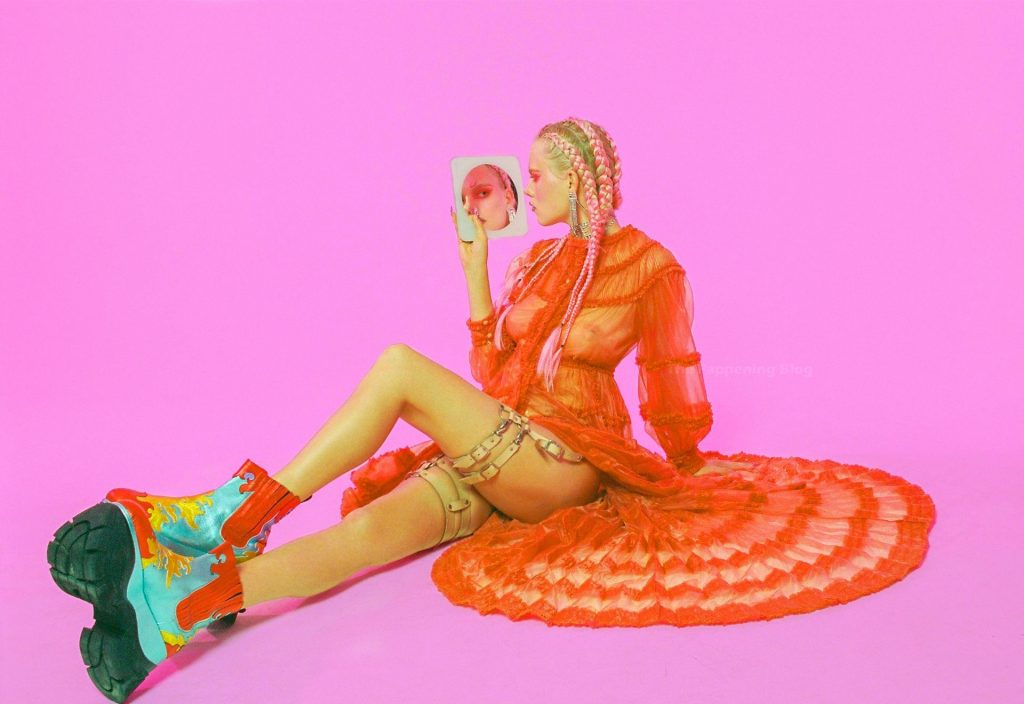 La modelo Julia Almendra muestra sus tetas naturales desnudas con pezones grandes mientras posa con un body y vestido translúcidos para la revista Nikkou en una sesión de fotos de Lilith D’Lust (2020).