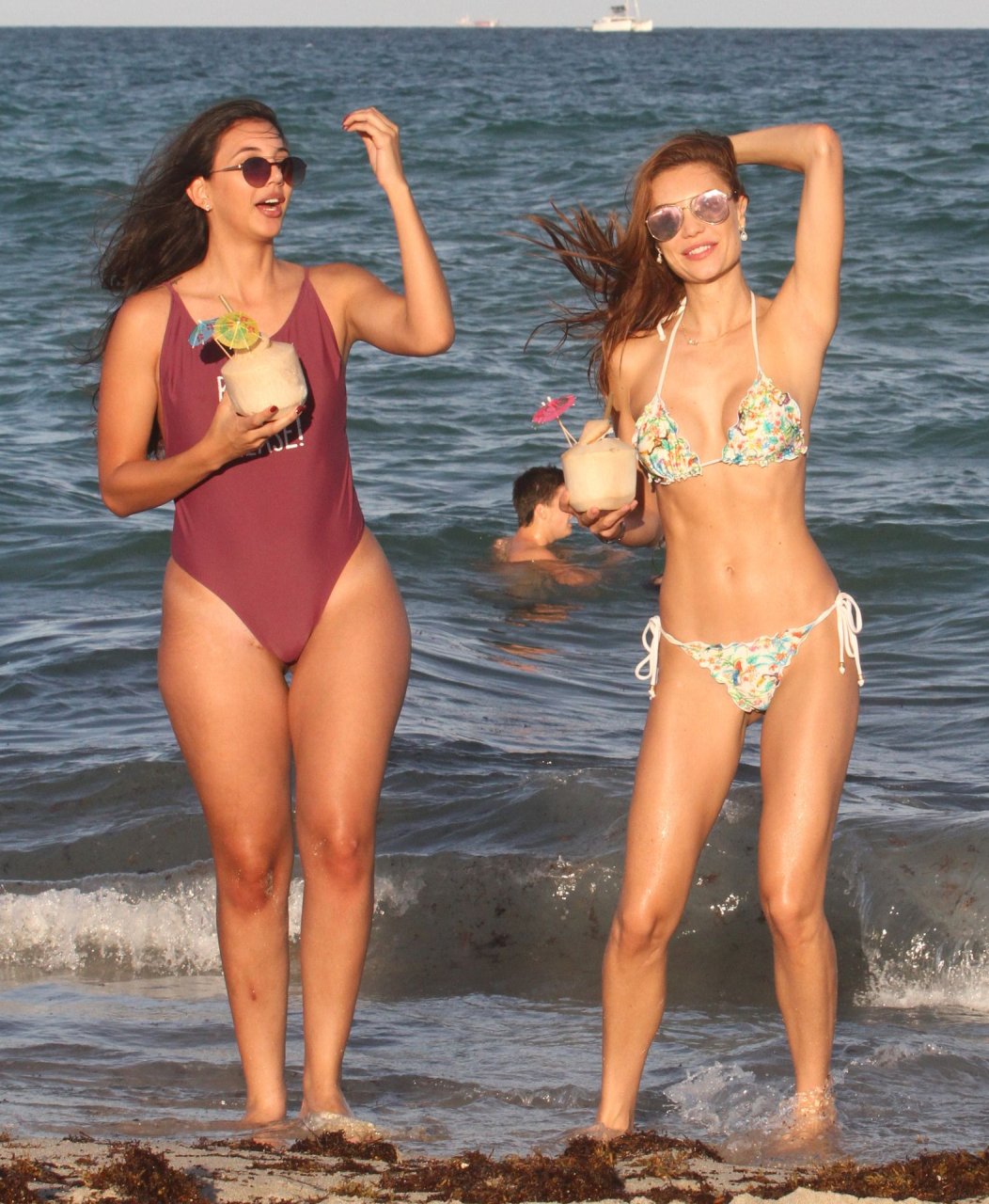 Supermodelo Julia Pereira lleva un bikini de cinta morada y no solo de su colección en la playa de Miami Beach, 03/04/2019, Beachwear de Julia. Julia ahora diseña su línea de bikinis hechos en Brasil y los vende en todo el mundo.