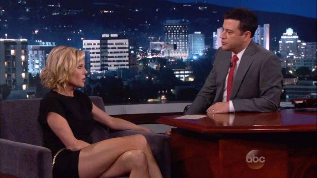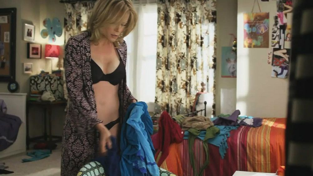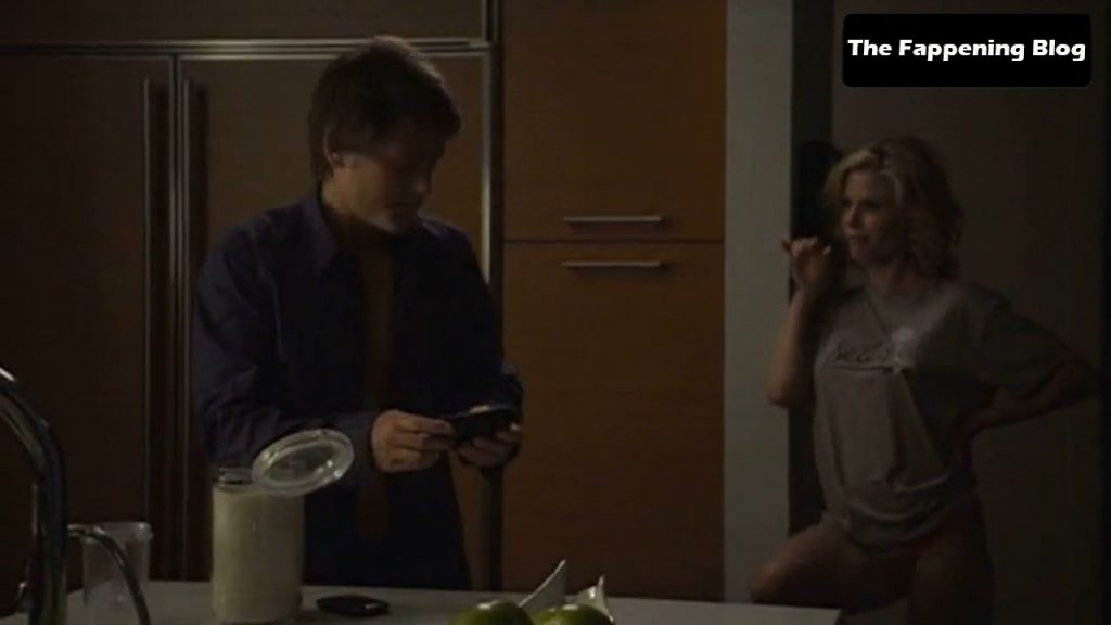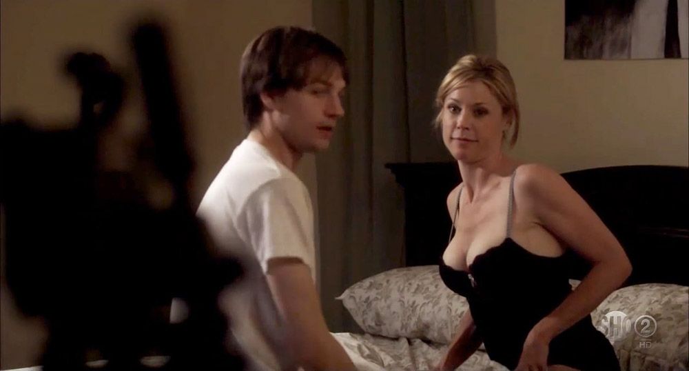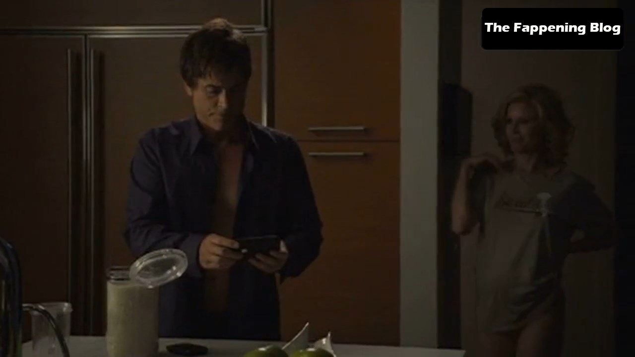 Then we have a hot scene of Julie Bowen from Modern Family, where she is seen entering the room in a black bra and underwear. She has a loose robe hanging down as she shows some cleavage and talks to a guy in a video chat. Then, realizing he can see her, she falls to the floor, and you see Julie Bowen’s ass in her black panties when she starts crawling.