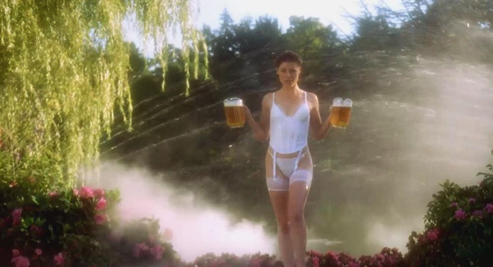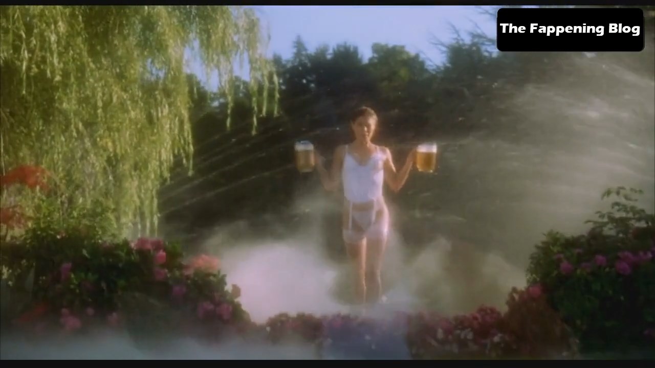 In the hot scene from Happy Gilmore, Julie wears a black bustier, stockings and a belt with garters. She holds pitchers of beer and then throws them when a guy comes over and kisses her. He touches Julie Bowen’s ass and she puts her leg over him. Then you see Julie in the same underwear, this time white, when she goes to the camera with a lot of beer.