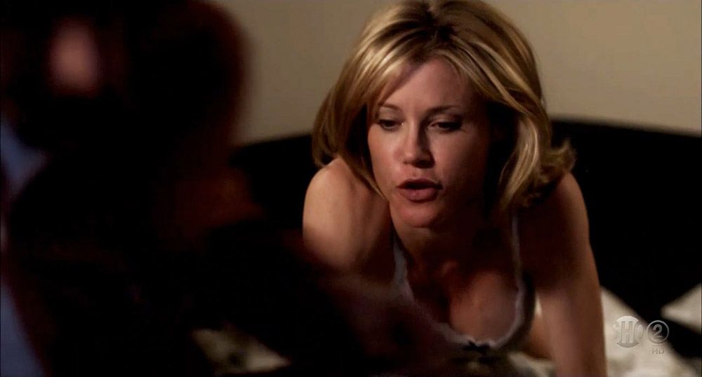 Then we have one of Julie Bowen’s hottest sex scenes, and it’s from Weeds. She didn’t show anything, but her sex and moaning got fappers excited! She wears a green top as the guy licks her pussy while she’s on top of the kitchen table!