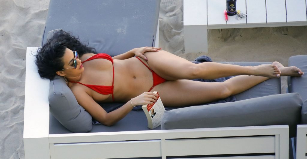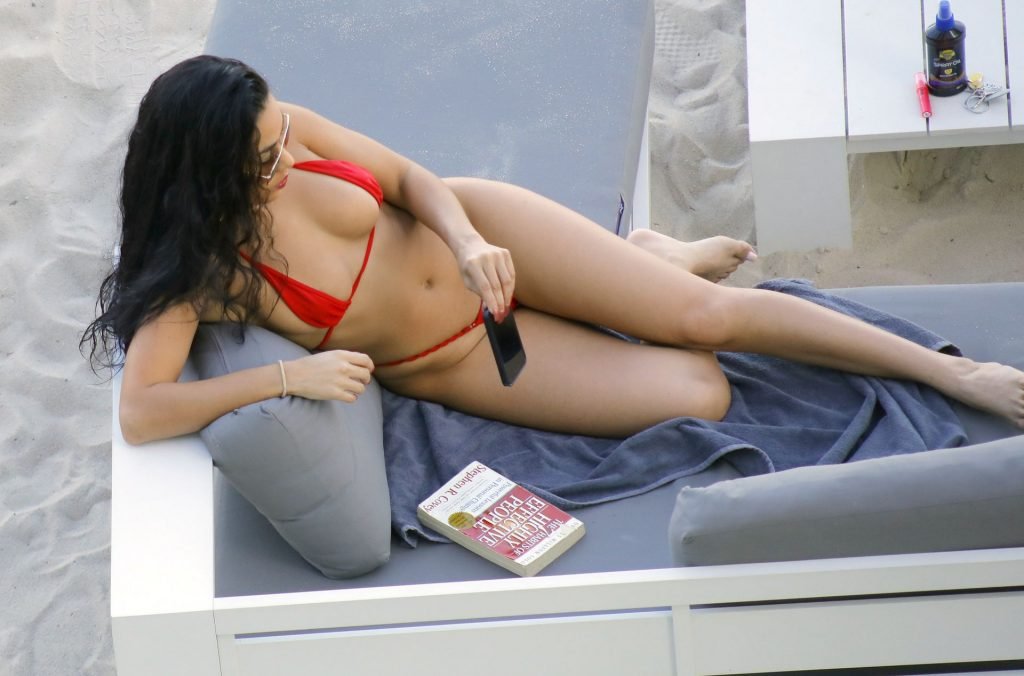 La modelo de Yeezy Julissa Neal deslumbra con un bikini tanga rojo mientras toma el sol bajo el intenso calor en su hotel de lujo en Miami Beach, 01/09/2019. Julissa fue vista relajándose junto al agua mientras leía un libro y mostraba sus curvas en la suave silla de cabana para descansar.
