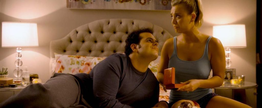 The first scene is from a movie called ‘The Wedding Ringer’. Kaley Cuoco walks into the room braless as she comes out of a bathroom arguing with a man and then sits down on the bed with him while he gives her ice cream and then some earrings while attempting to charm her into having sex with him, all while looking at her hard nipples.