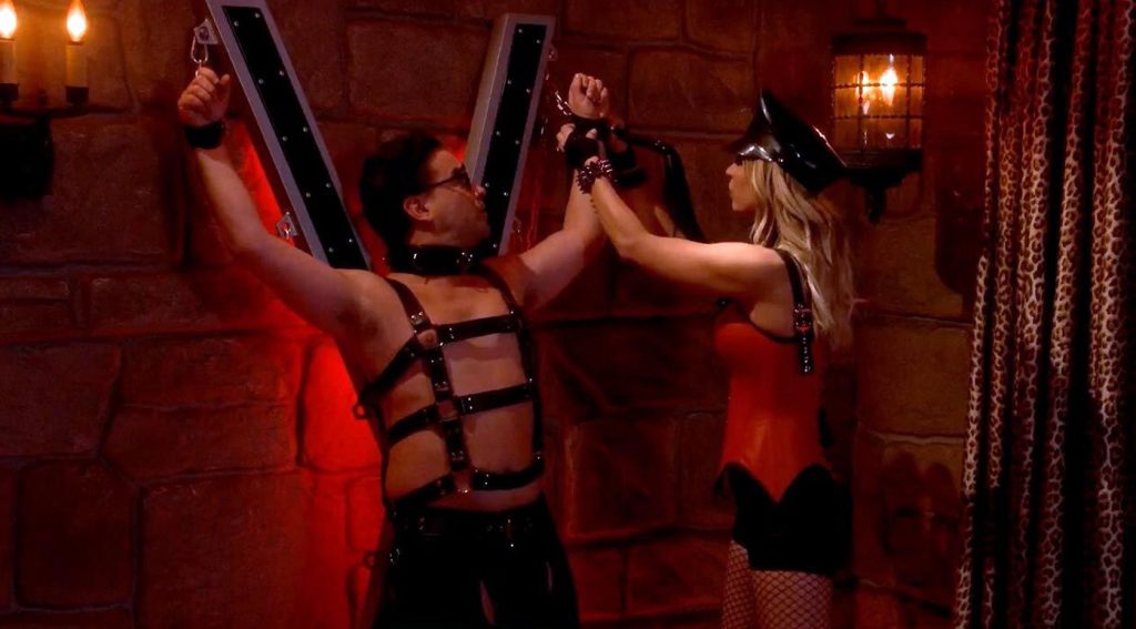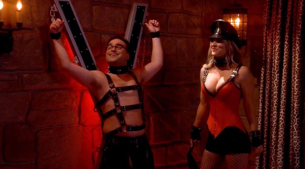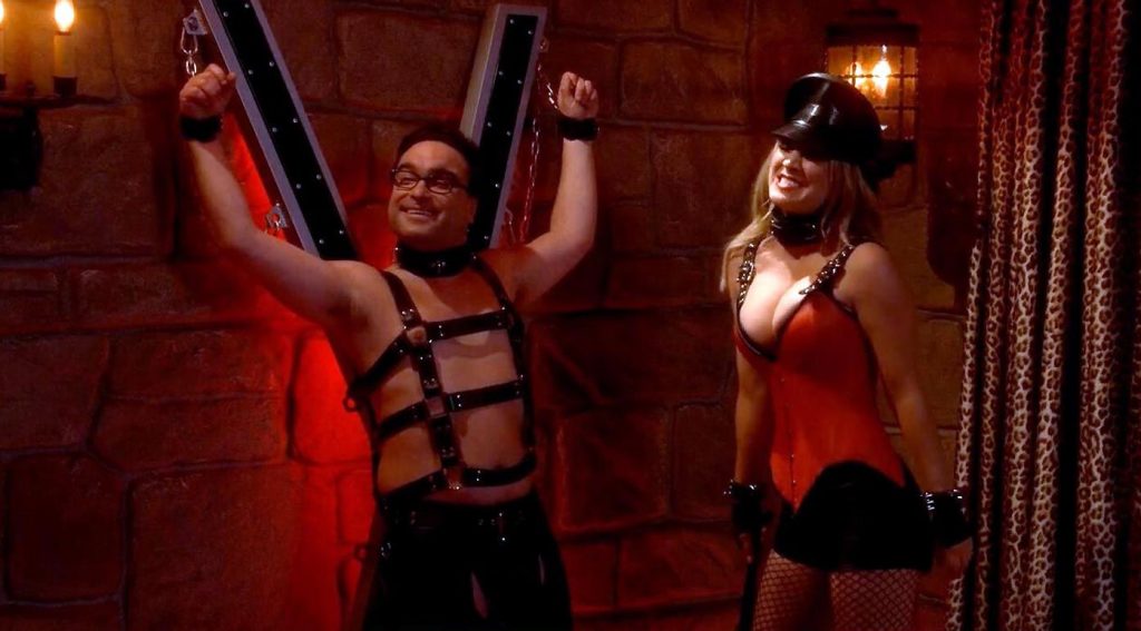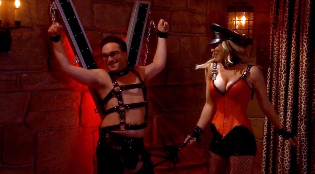 The next scene is from the famous TV show called ‘The Big Bang Theory’. During a dream sequence, Kaley Cuoco wears a provocative red corset showing lots of cleavages while she stands by a man tied up and lightly whips him as another guy peers in from the doorway.