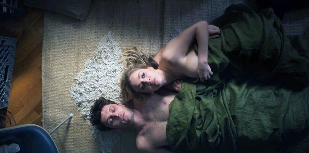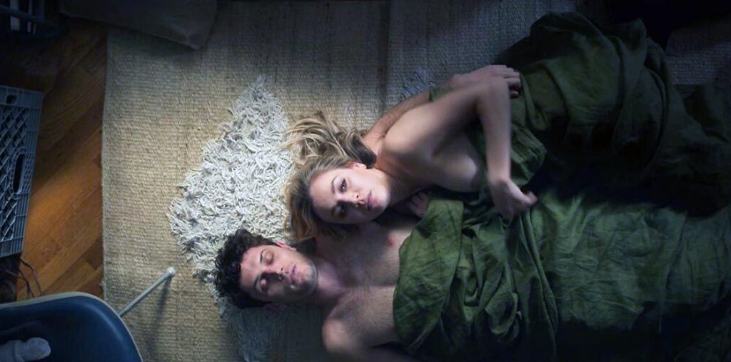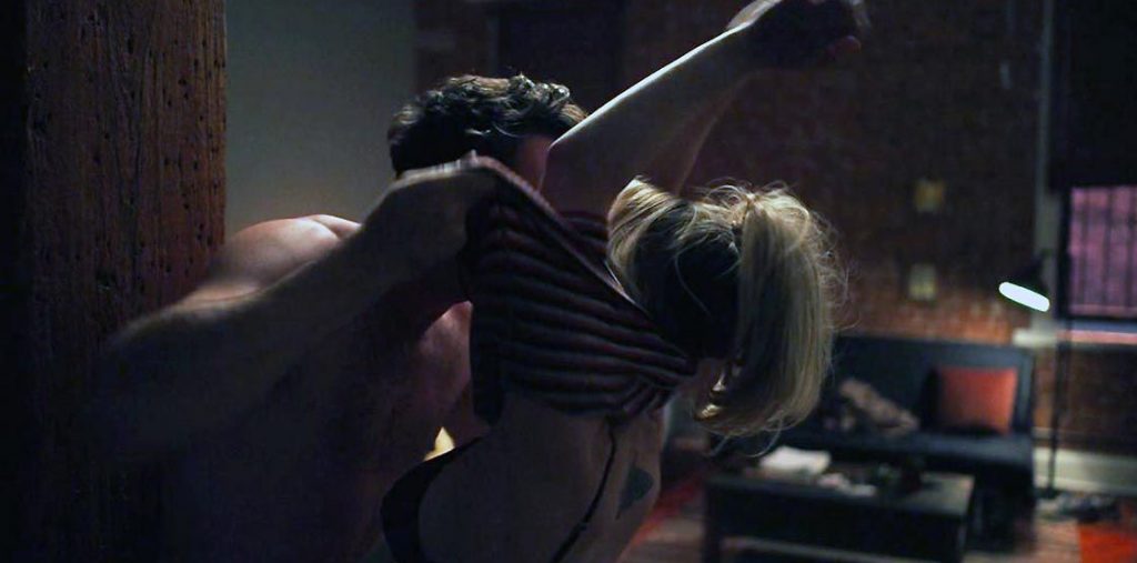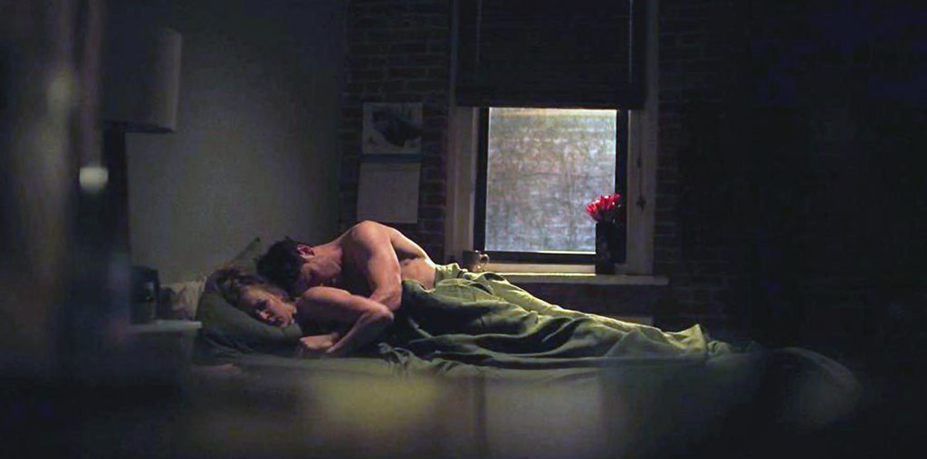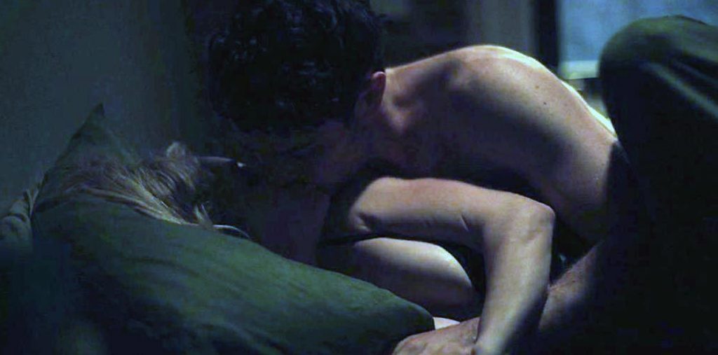 Now, here are my favorite scenes! First, I have to show you the last two ones from the ‘The Flight Attendant’ series above! In the first one, Kaley Cuoco is kissing a man as he takes her top off to expose her bra. She and the man then move to a tent, where he has sex with her from behind, with Kaley exposing her cleavage in her bra as she lays on her side.