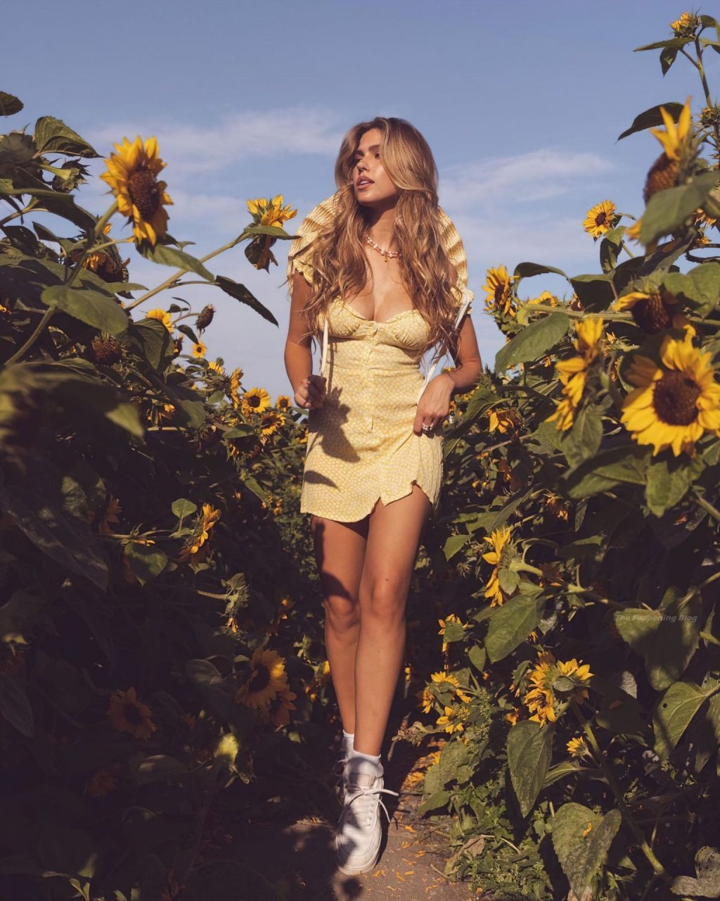 La modelo Kara Del Toro muestra su escote con un vestido de verano, posando entre girasoles en una nueva sesión de fotos para redes sociales por Megan Batson (2021).