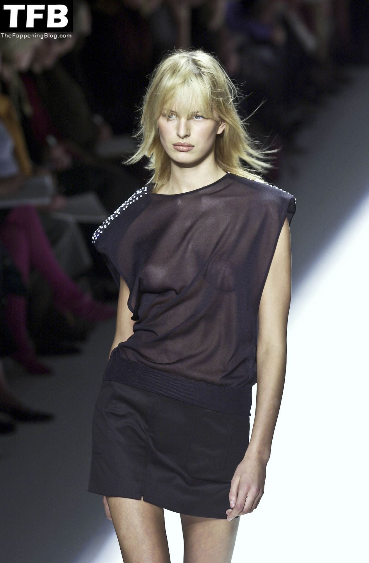 Model Karolina Kurkova muestra sus pechos desnudos mientras camina por la pasarela durante el desfile de moda Lanvin Primavera 2001.