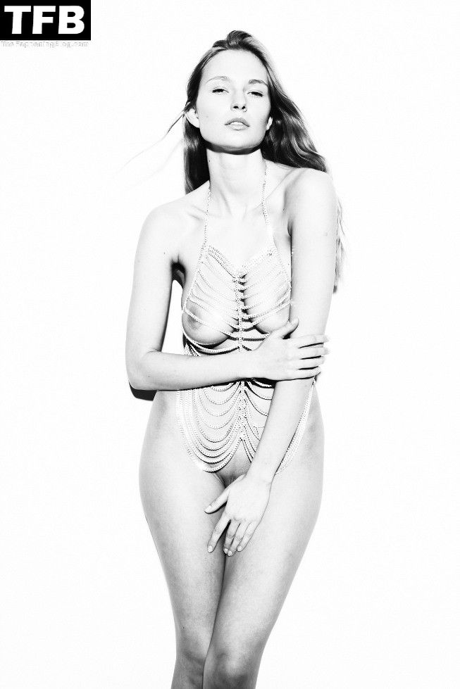 Mira las fotos en blanco y negro de Karolina Szymczak completamente desnuda de frente por Antoine Verglas, mostrando los hermosos pechos y la vulva desnuda de la modelo polaca.
