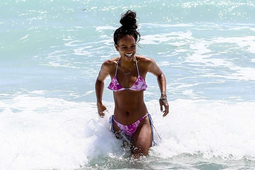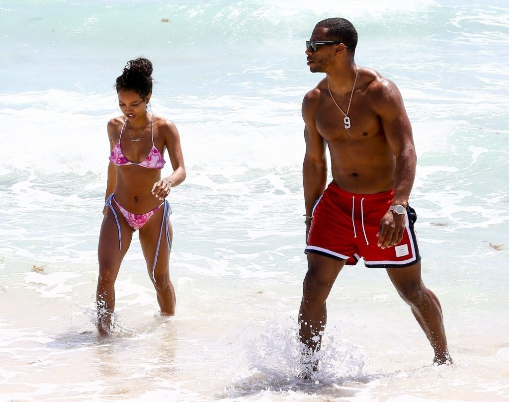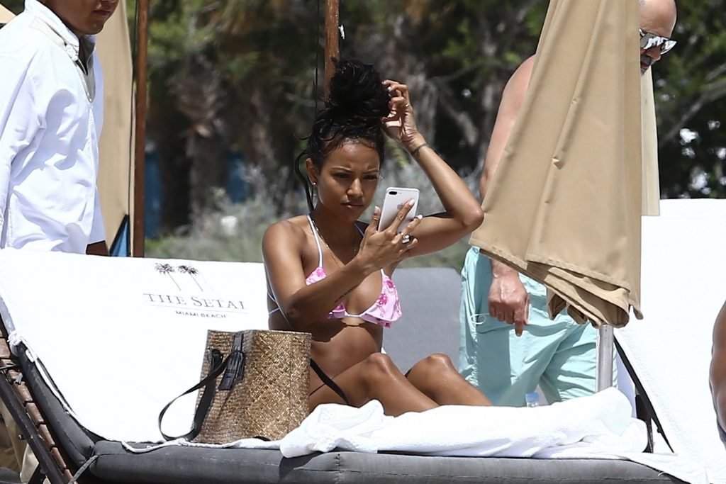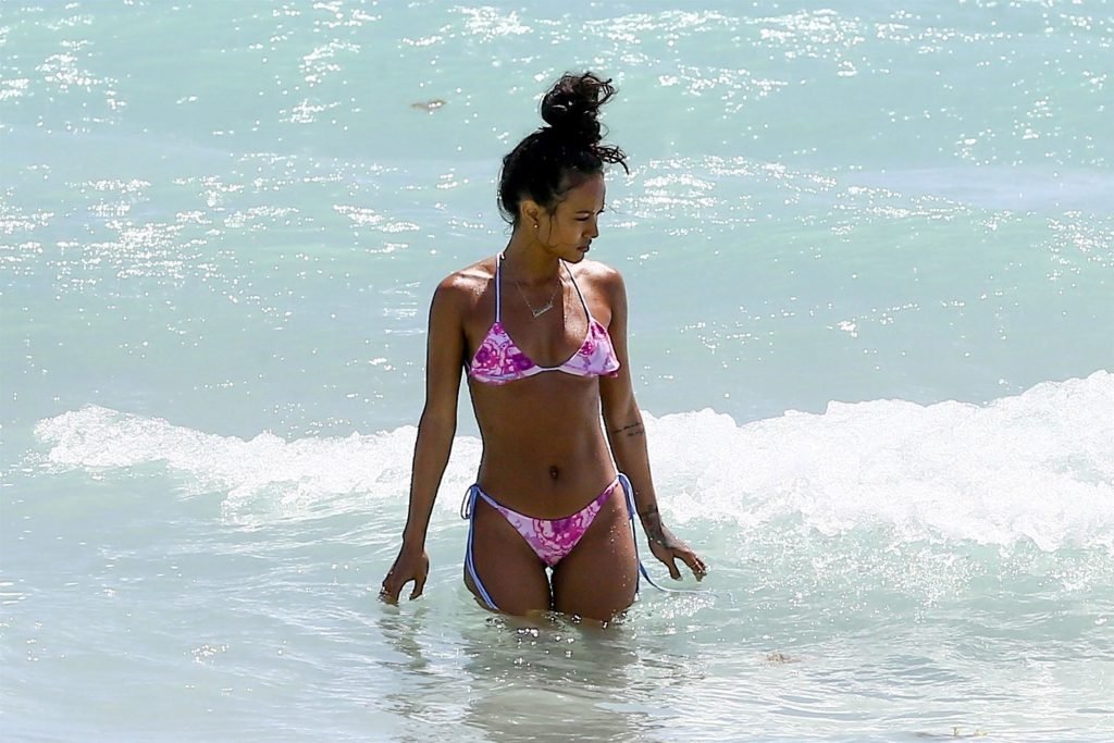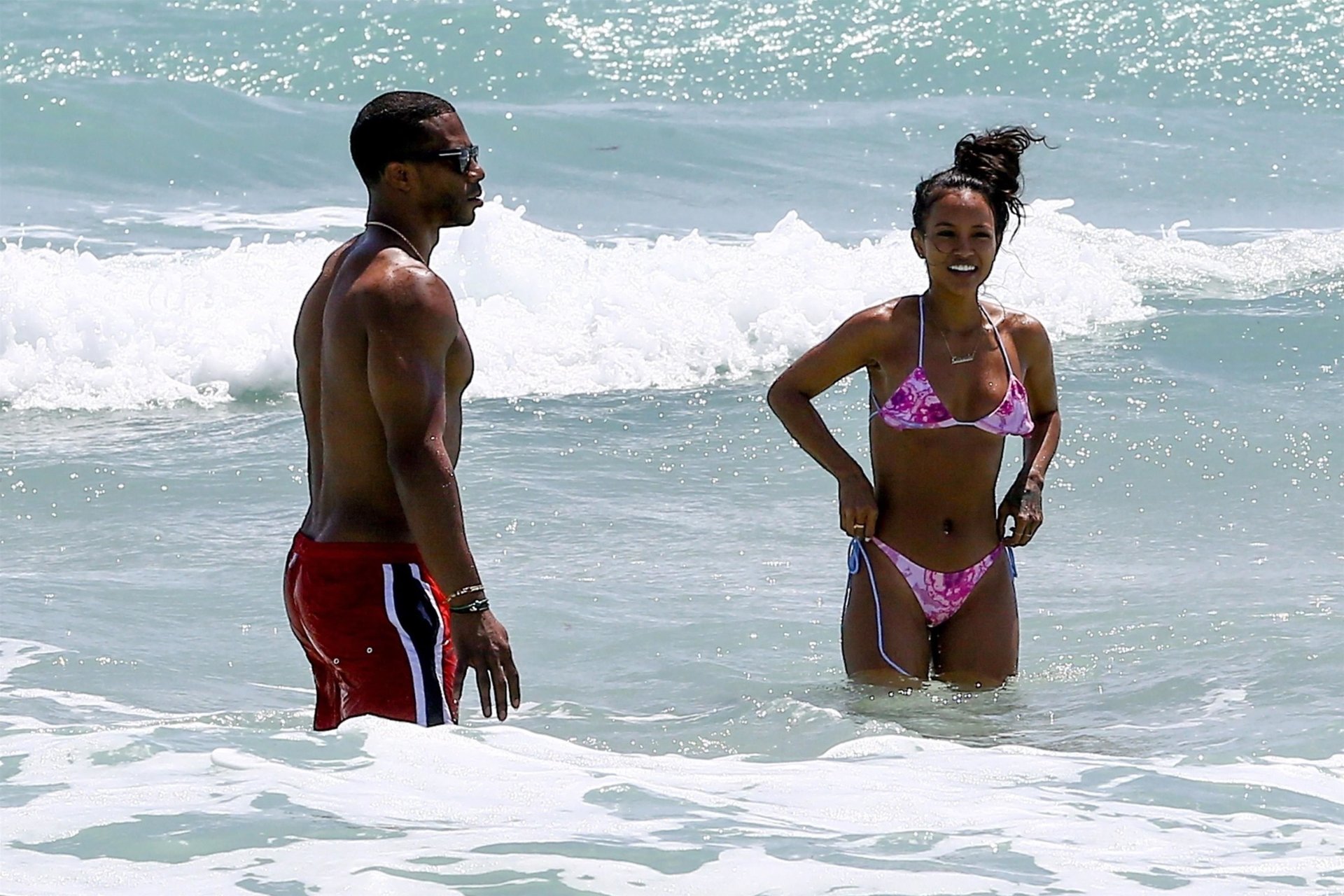 Model y actriz Karrueche Tran, 29, muestra su cuerpo en forma con un diminuto bikini rosa mientras disfruta de un día de playa en Miami con su novio estrella de la NFL, Victor Cruz, 12/04/2018.