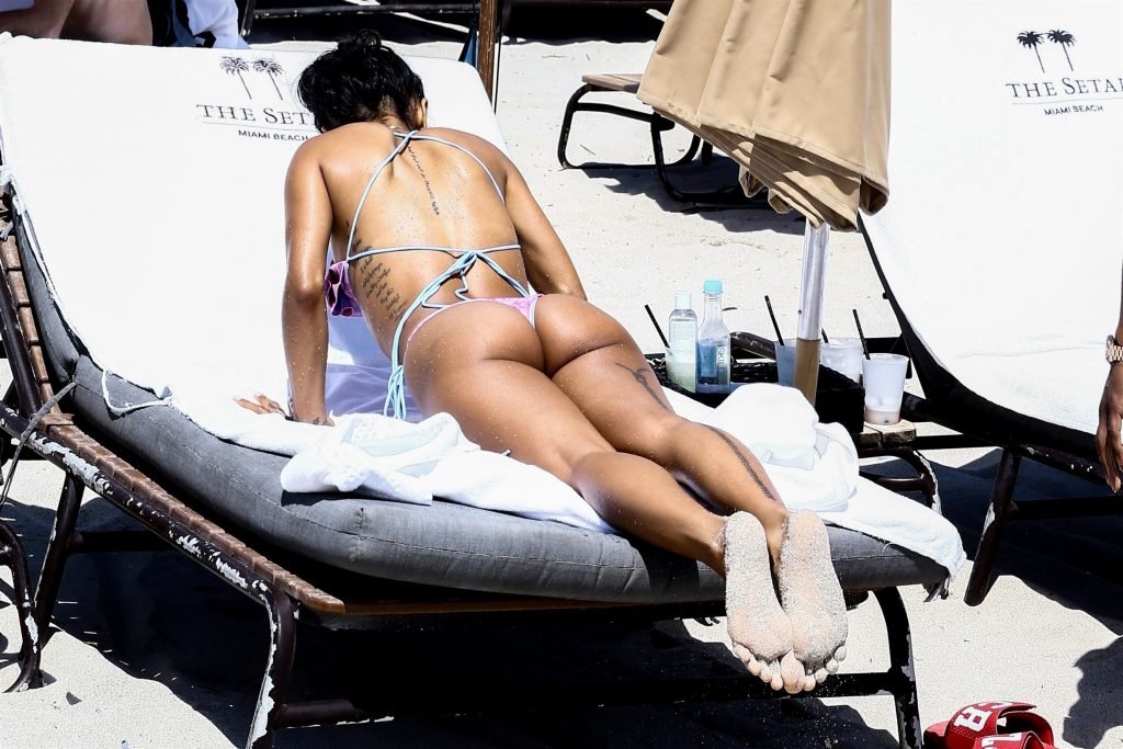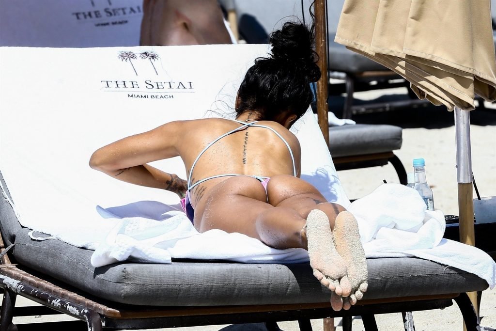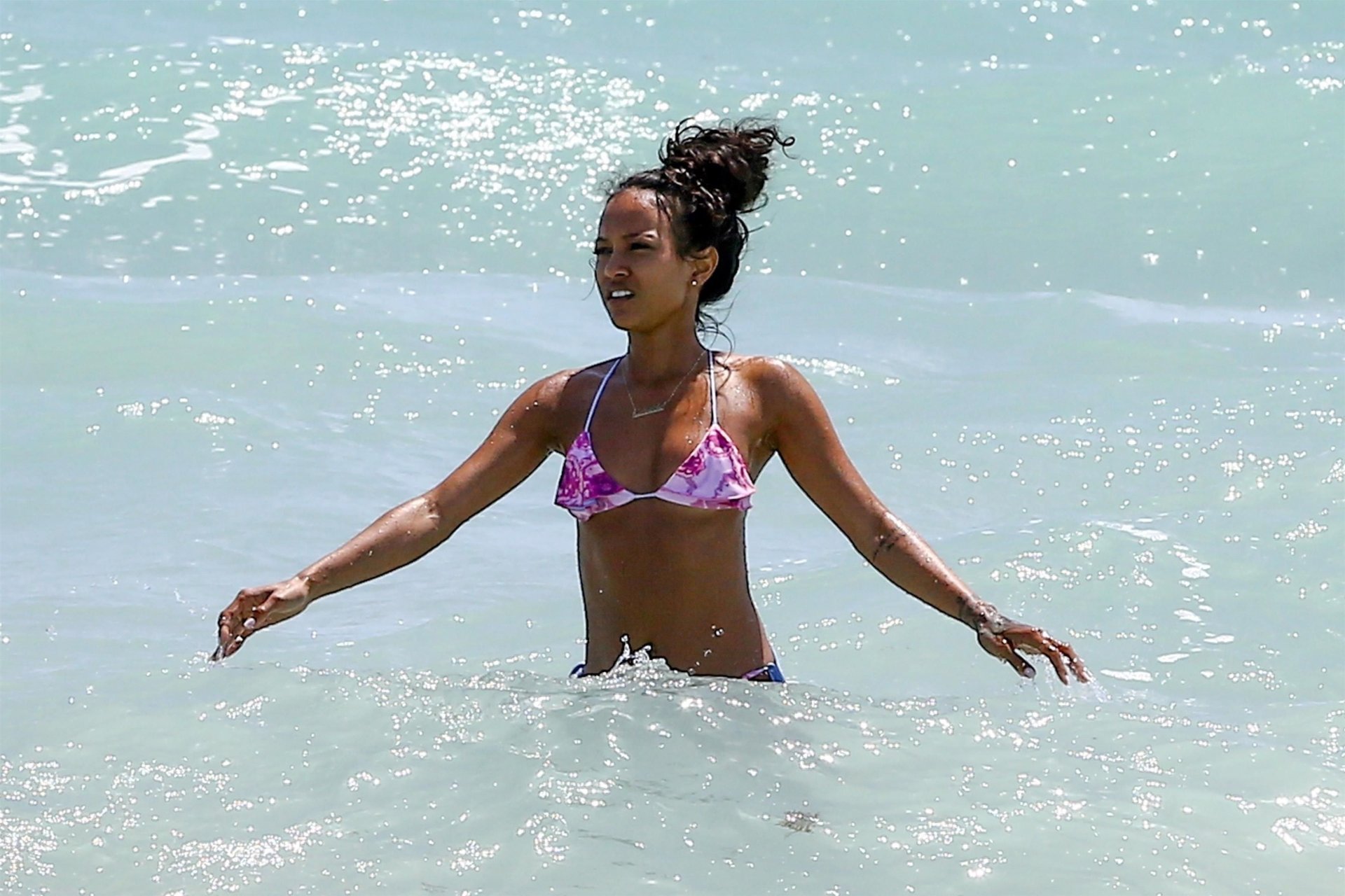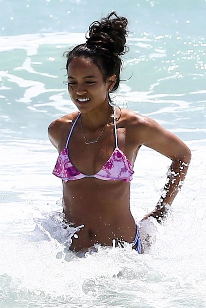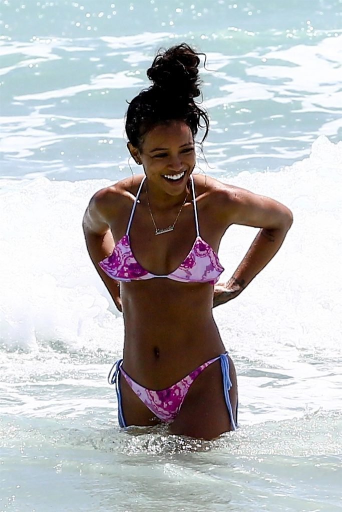 Model y actriz Karrueche Tran, 29, muestra su cuerpo en forma con un diminuto bikini rosa mientras disfruta de un día de playa en Miami con su novio estrella de la NFL, Victor Cruz, 12/04/2018.