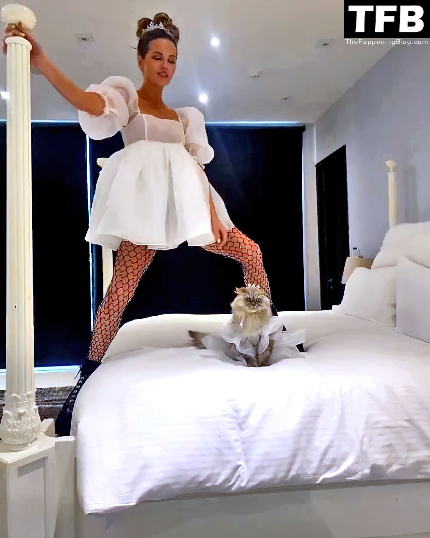 La estrella de The Fappening Kate Beckinsale muestra sus tetas desnudas con un vestido blanco transparente mientras juega con un gato (2022).