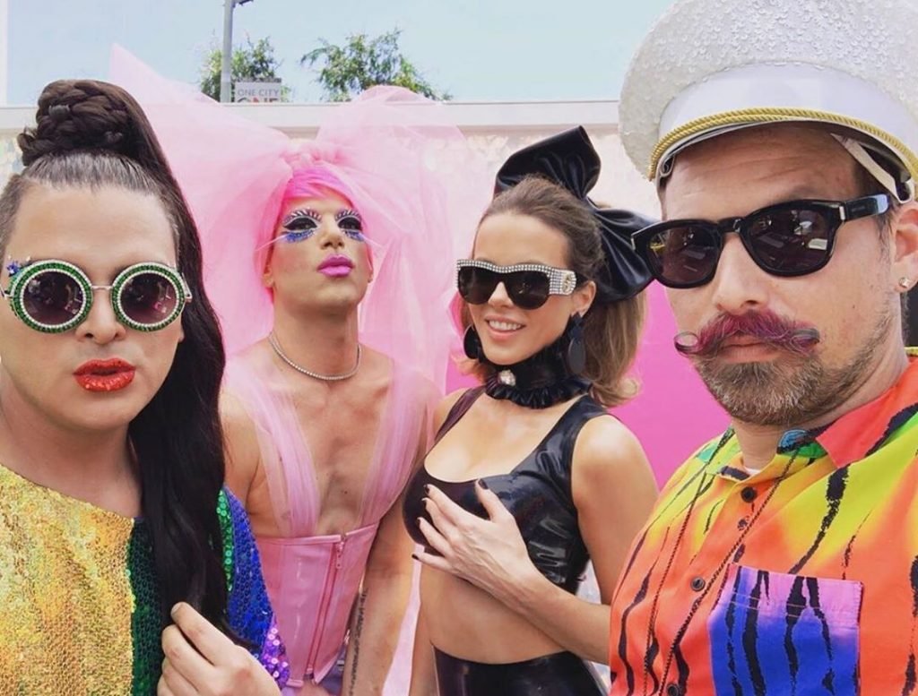 Kate Beckinsale fue fotografiada con un conjunto de látex negro en el Orgullo LGBT en Los Ángeles, 10/06/2019. Kate, junto con Heidi Klum, se convirtió en activista del evento de la comunidad LGBT. Ella vestía como una ama en un bonito traje de látex negro. La actriz eligió un crop top, y la falda ajustada enfatizaba su figura sexy. La mujer de 45 años añadió un gran lazo a su atuendo.