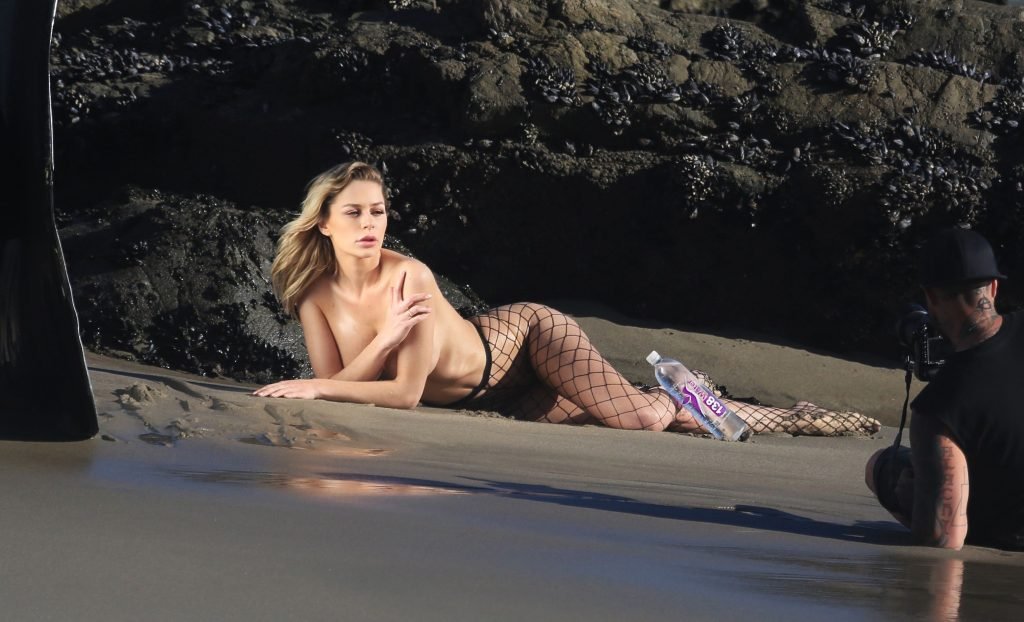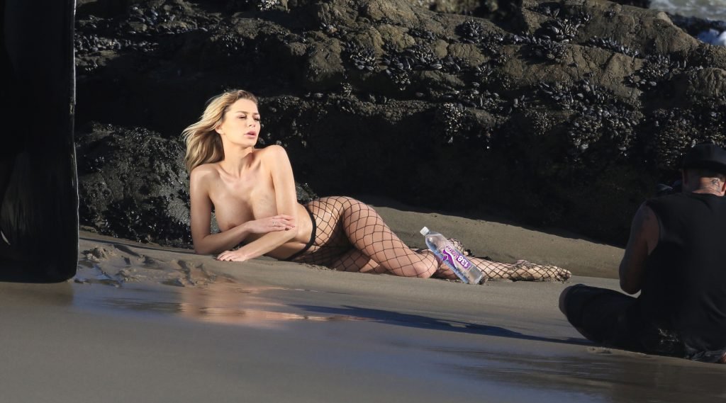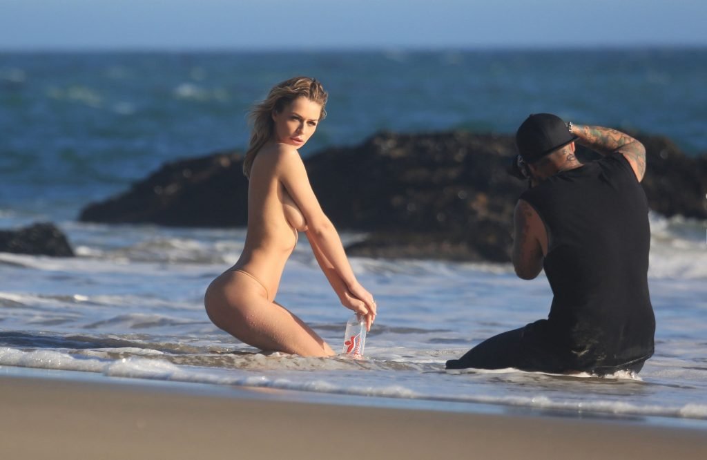 La voluptuosa modelo estadounidense Kate Compton exhibe su sexy cuerpo en bikini antes de posar desnuda durante una sensual sesión de fotos 138 Water en la playa de Malibu con el fotógrafo Malachi Banales, 17/07/2017.