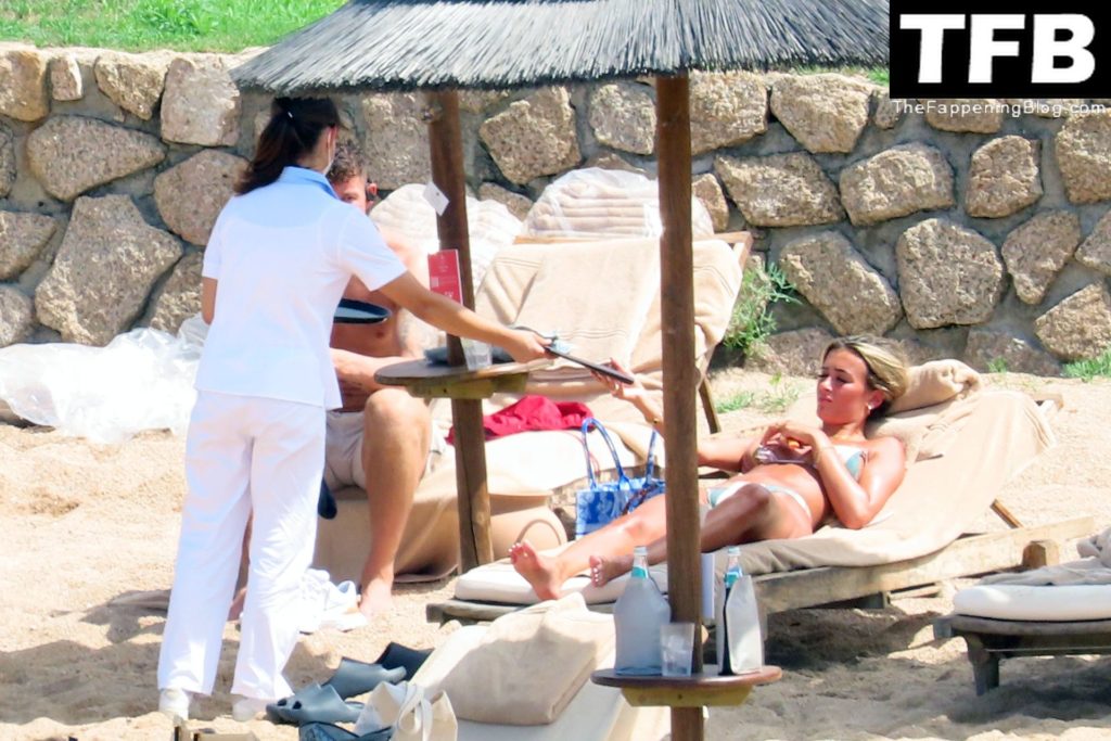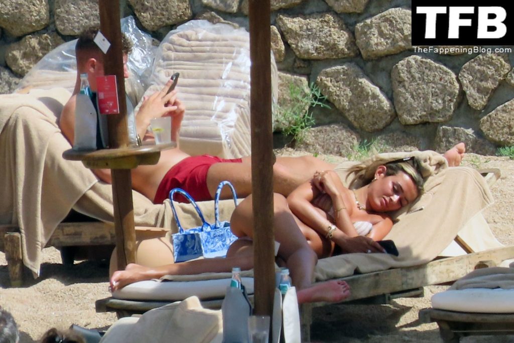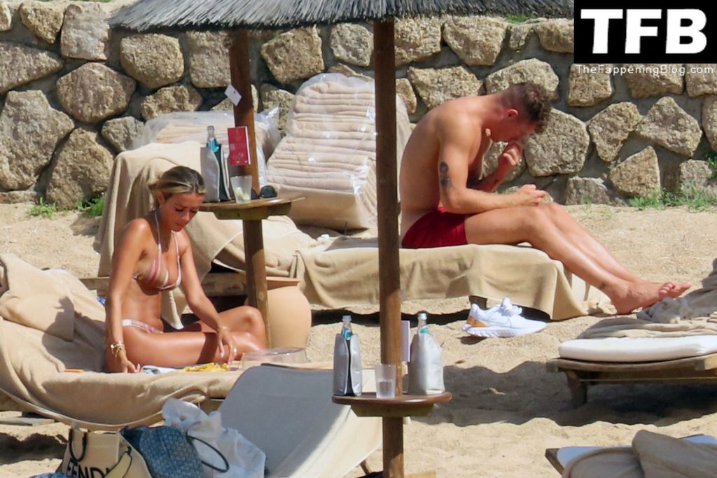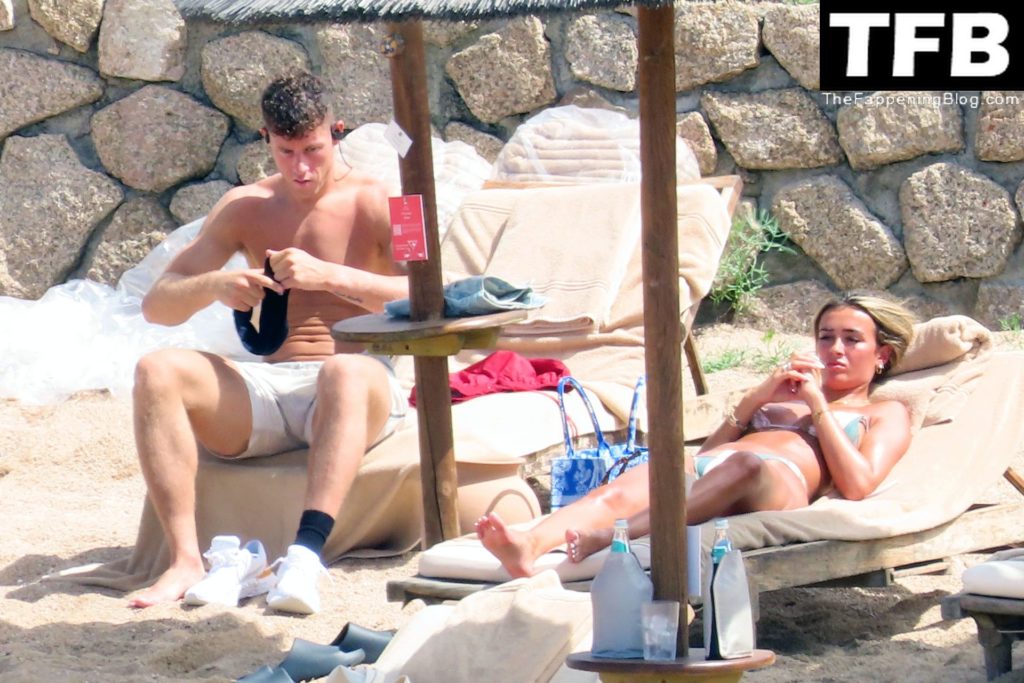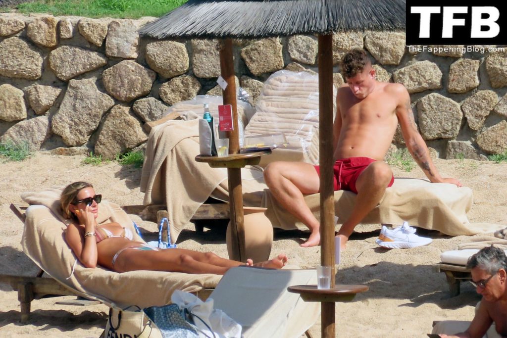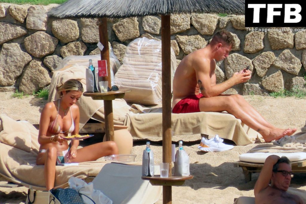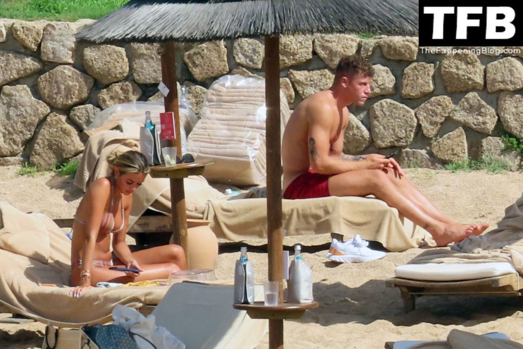 Ross Barkley con rostro solemne y su novia Katherine Pilkington continúan sus vacaciones en Italia, 28/06/2022. La pareja pasó el tiempo mirando sus teléfonos y pidiendo del menú junto a la playa.
