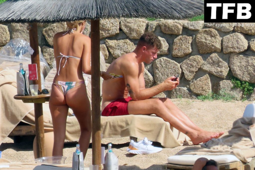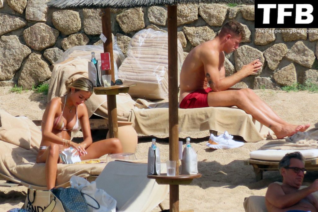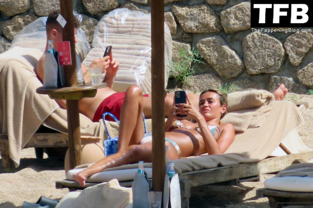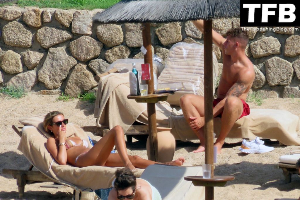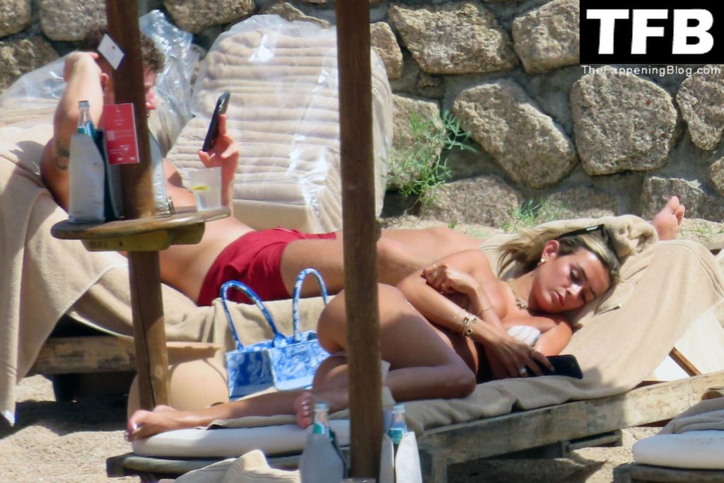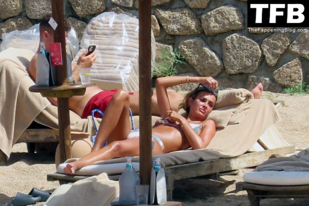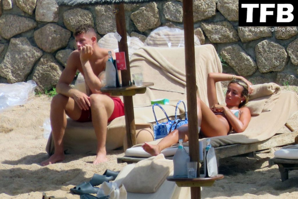 Ross Barkley con rostro solemne y su novia Katherine Pilkington continúan sus vacaciones en Italia, 28/06/2022. La pareja pasó el tiempo mirando sus teléfonos y pidiendo del menú junto a la playa.
