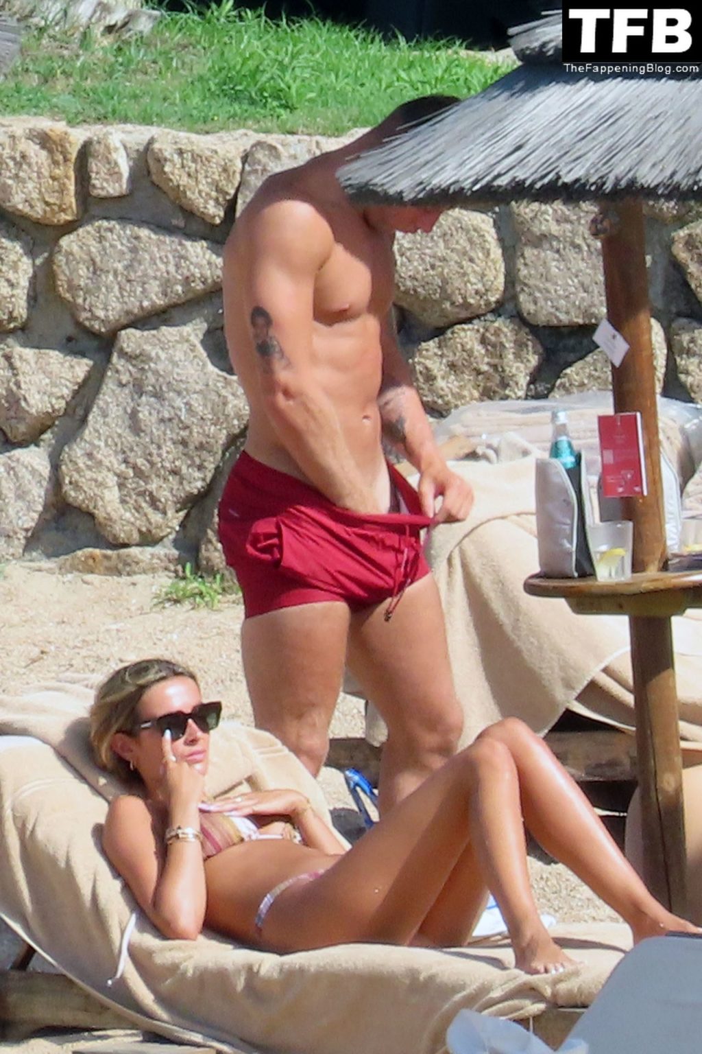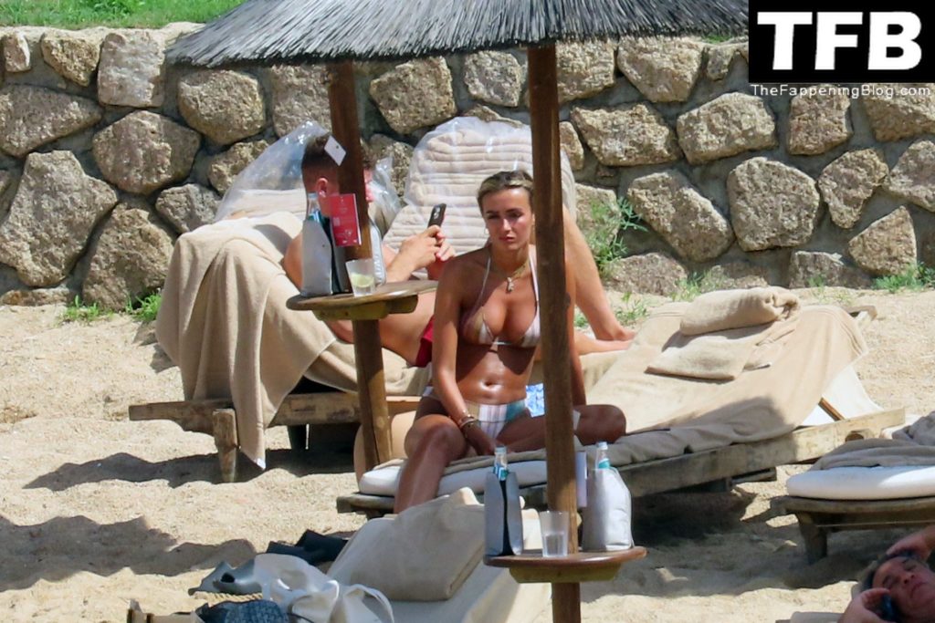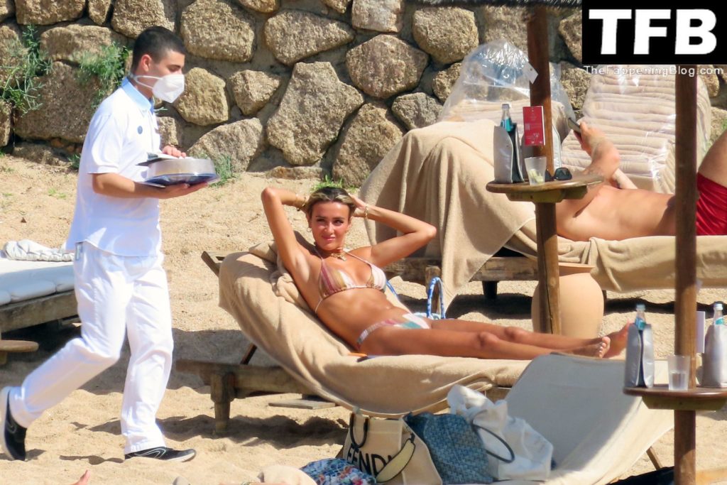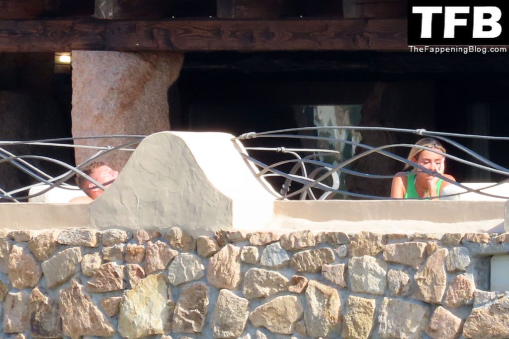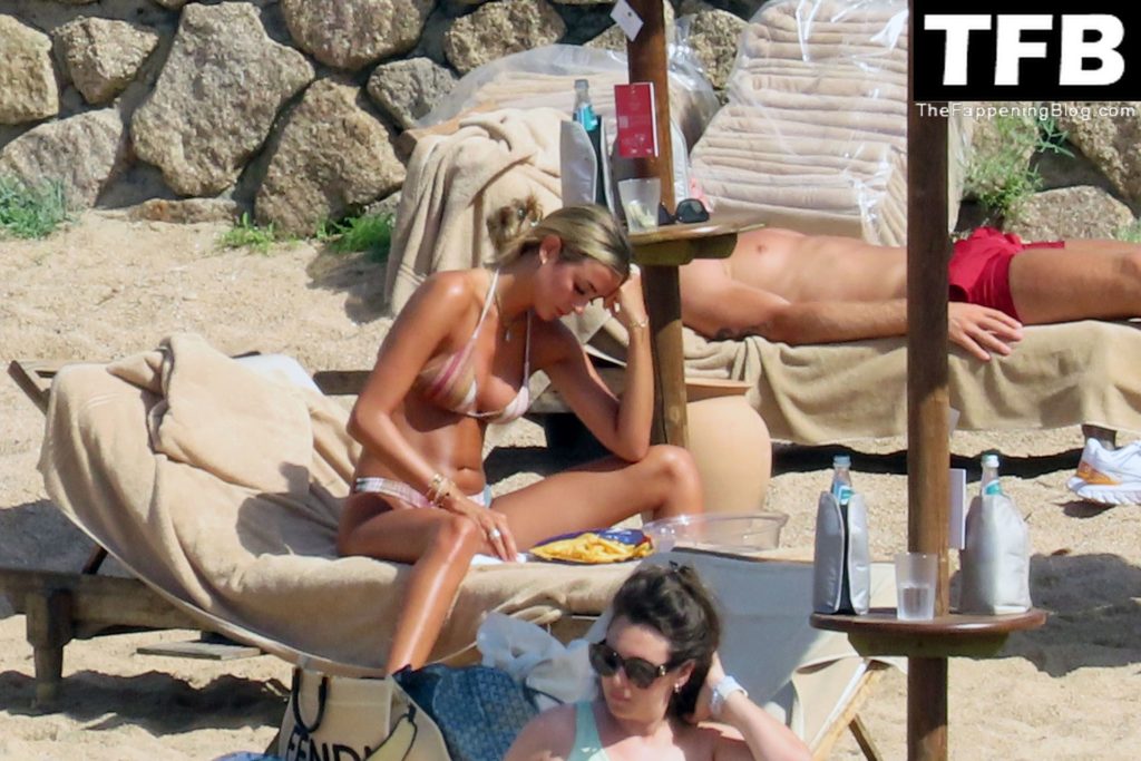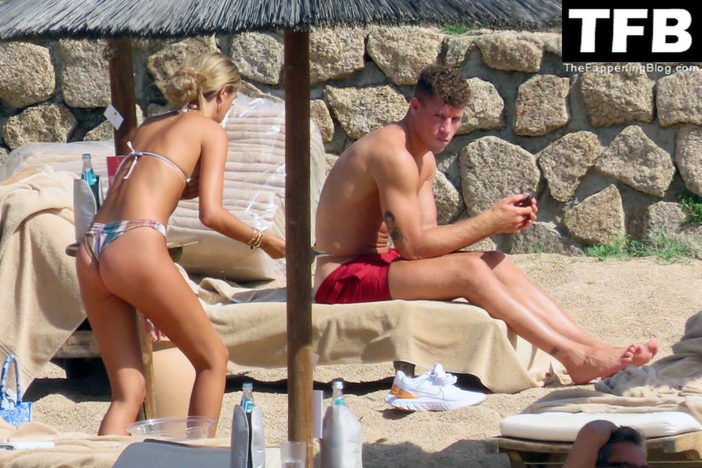 Ross Barkley con rostro solemne y su novia Katherine Pilkington continúan sus vacaciones en Italia, 28/06/2022. La pareja pasó el tiempo mirando sus teléfonos y pidiendo del menú junto a la playa.