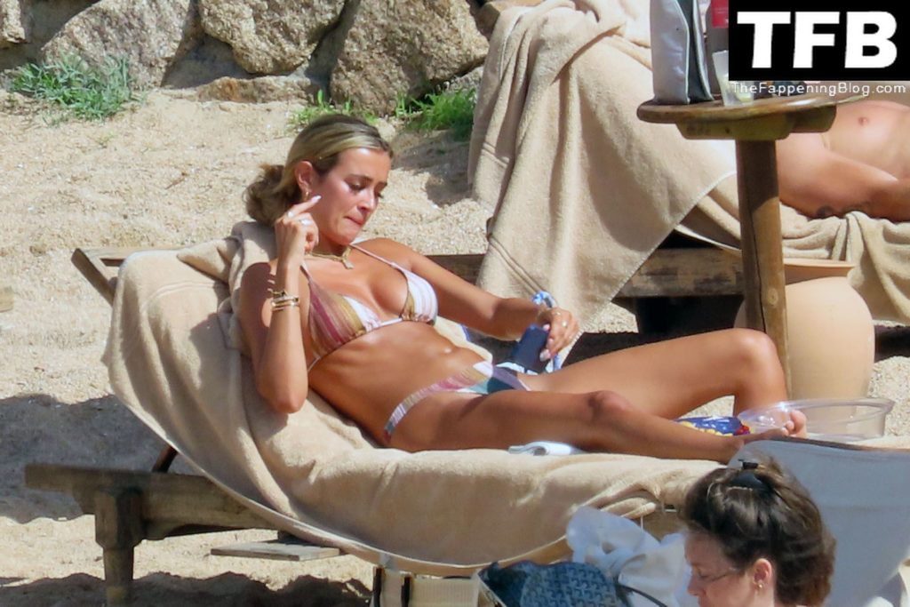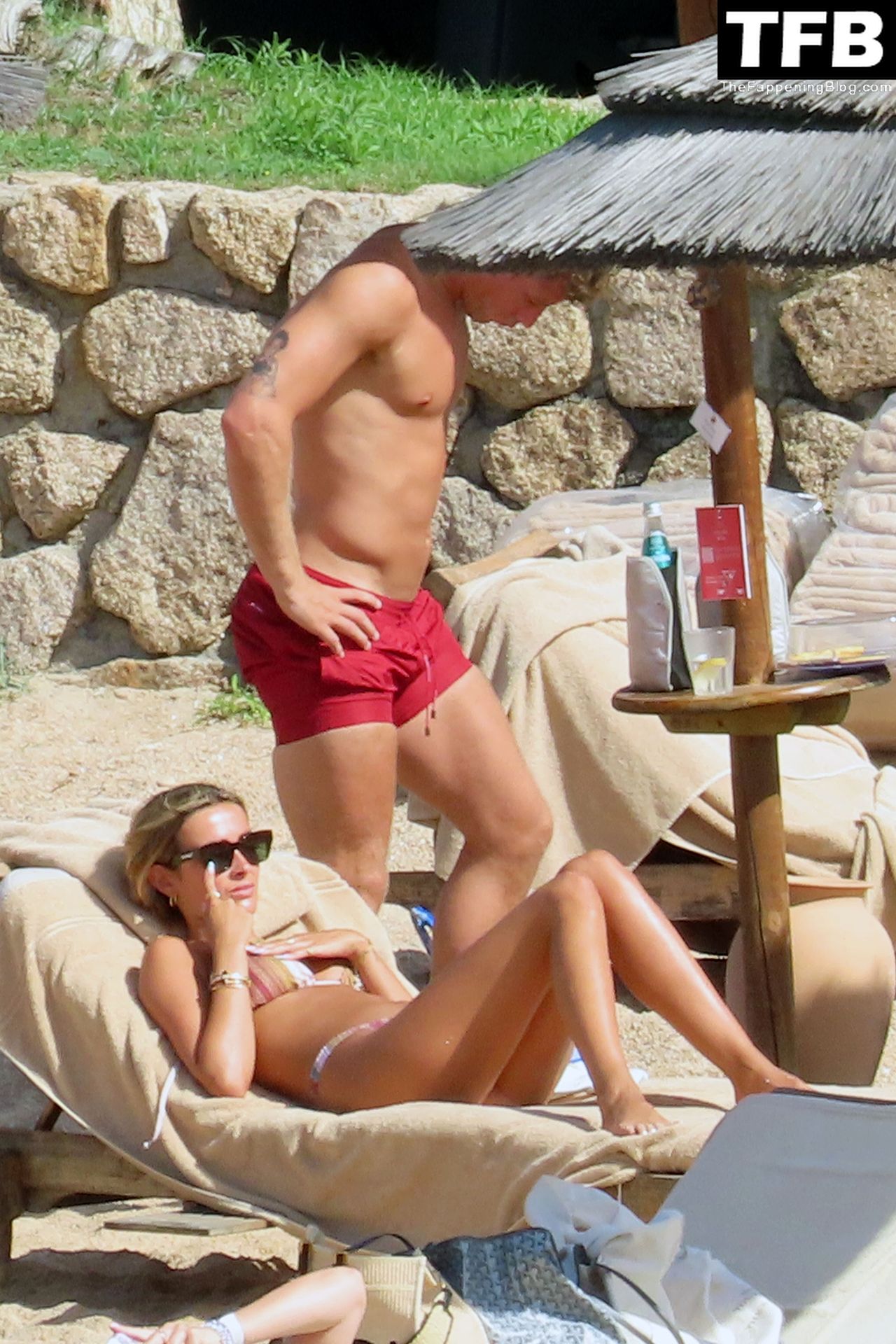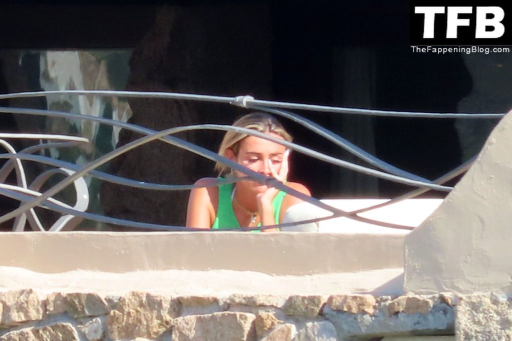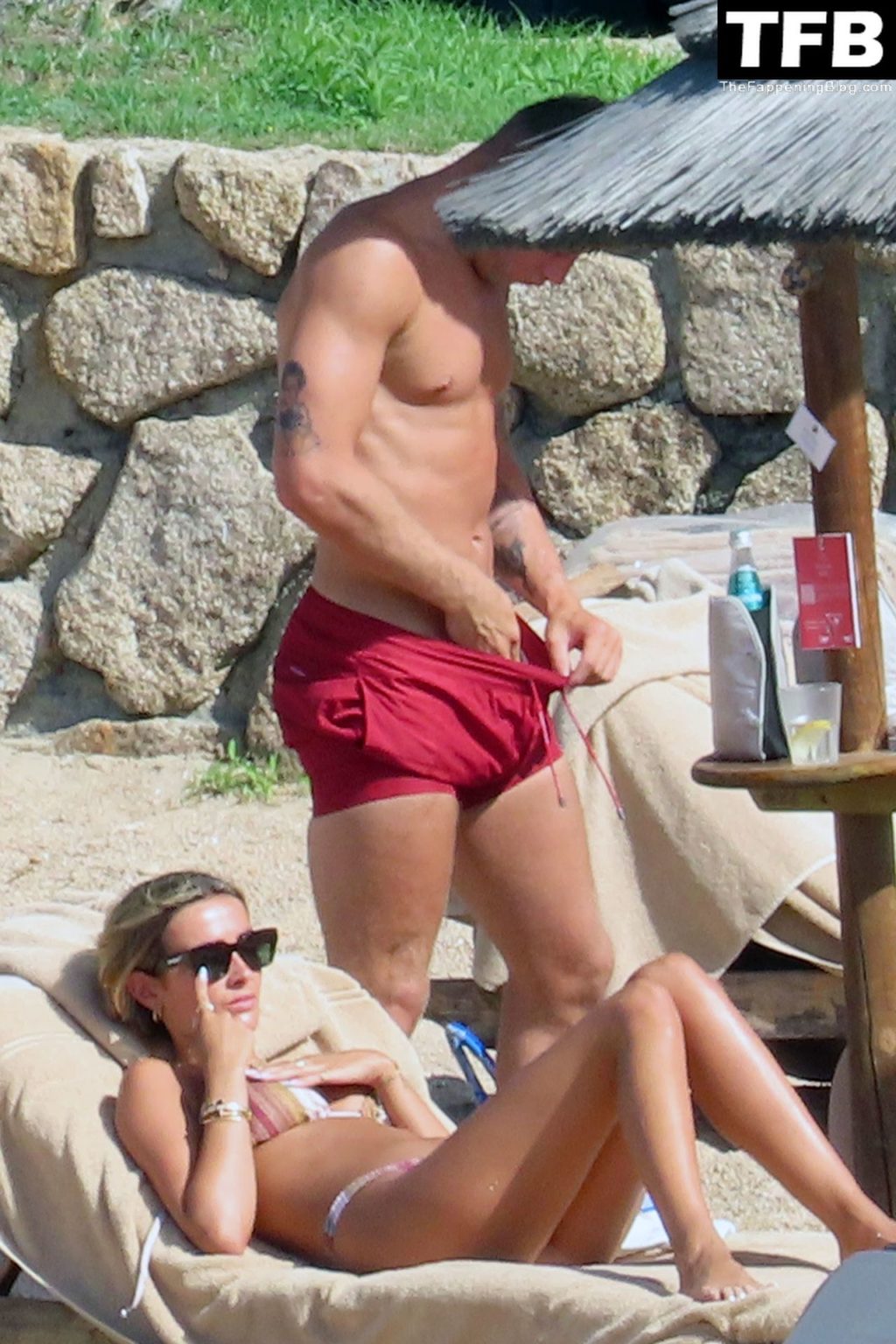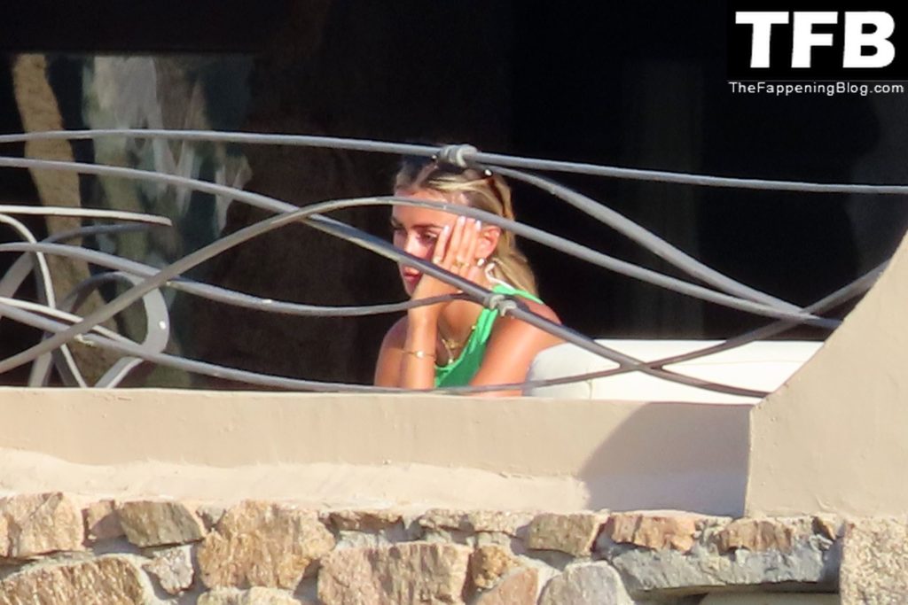Ross Barkley con rostro solemne y su novia Katherine Pilkington continúan sus vacaciones en Italia, 28/06/2022. La pareja pasó el tiempo mirando sus teléfonos y pidiendo del menú junto a la playa.