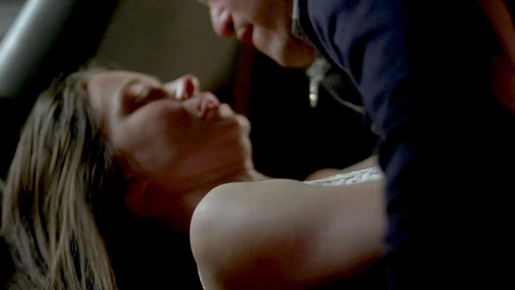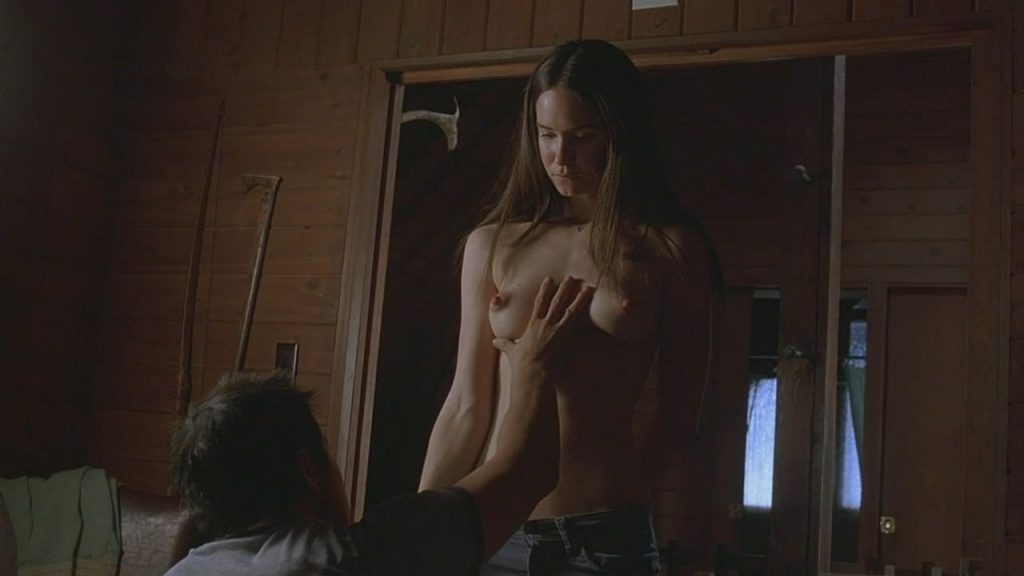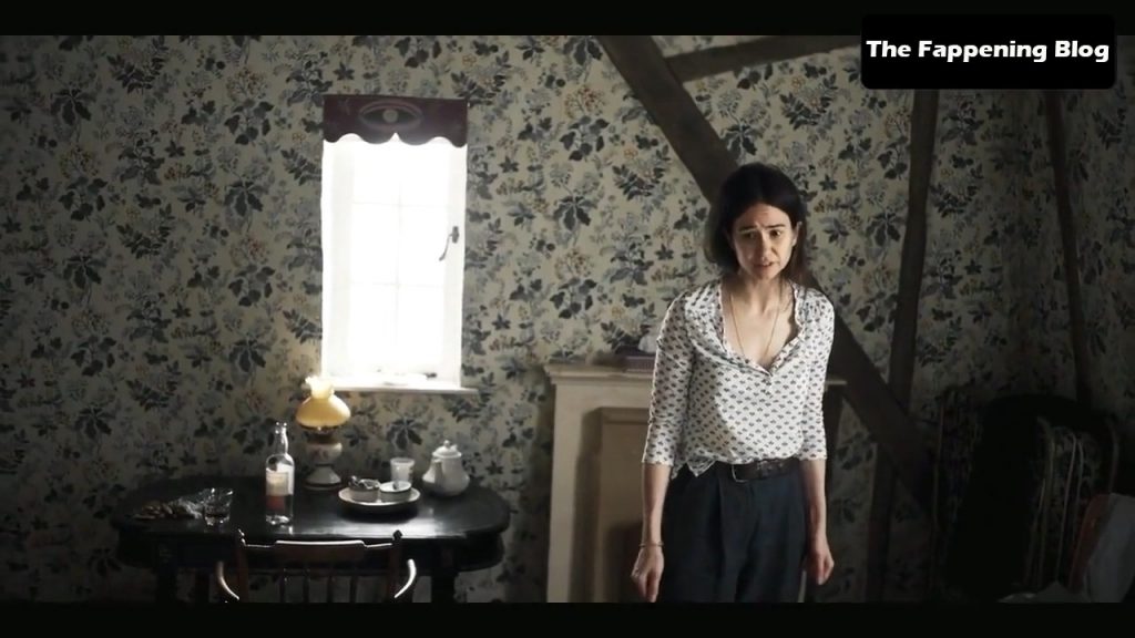En la primera escena, vemos a Katherine Waterston subiendo una escalera con una camisa muy ajustada que muestra unos pezones muy marcados. Luego está parada frente a un hombre mientras se quita la camisa por la cabeza para revelar sus bonitos pechos desnudos.