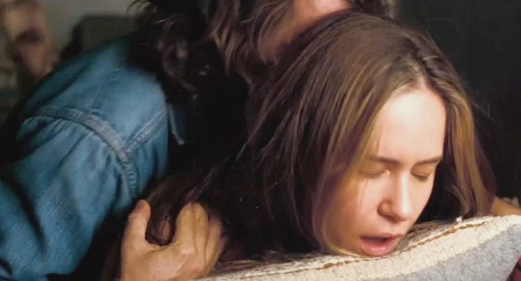 Katherine Waterston tiene sexo brevemente con un hombre acostada sobre su espalda y luego se da la vuelta y tiene un sexo un poco más intenso mientras lo monta y gime hasta que él la detiene.