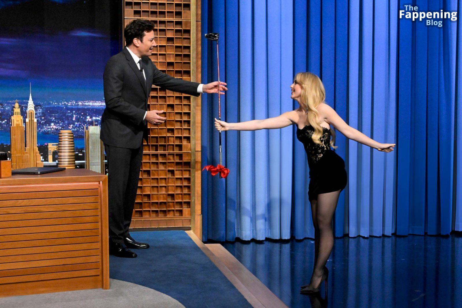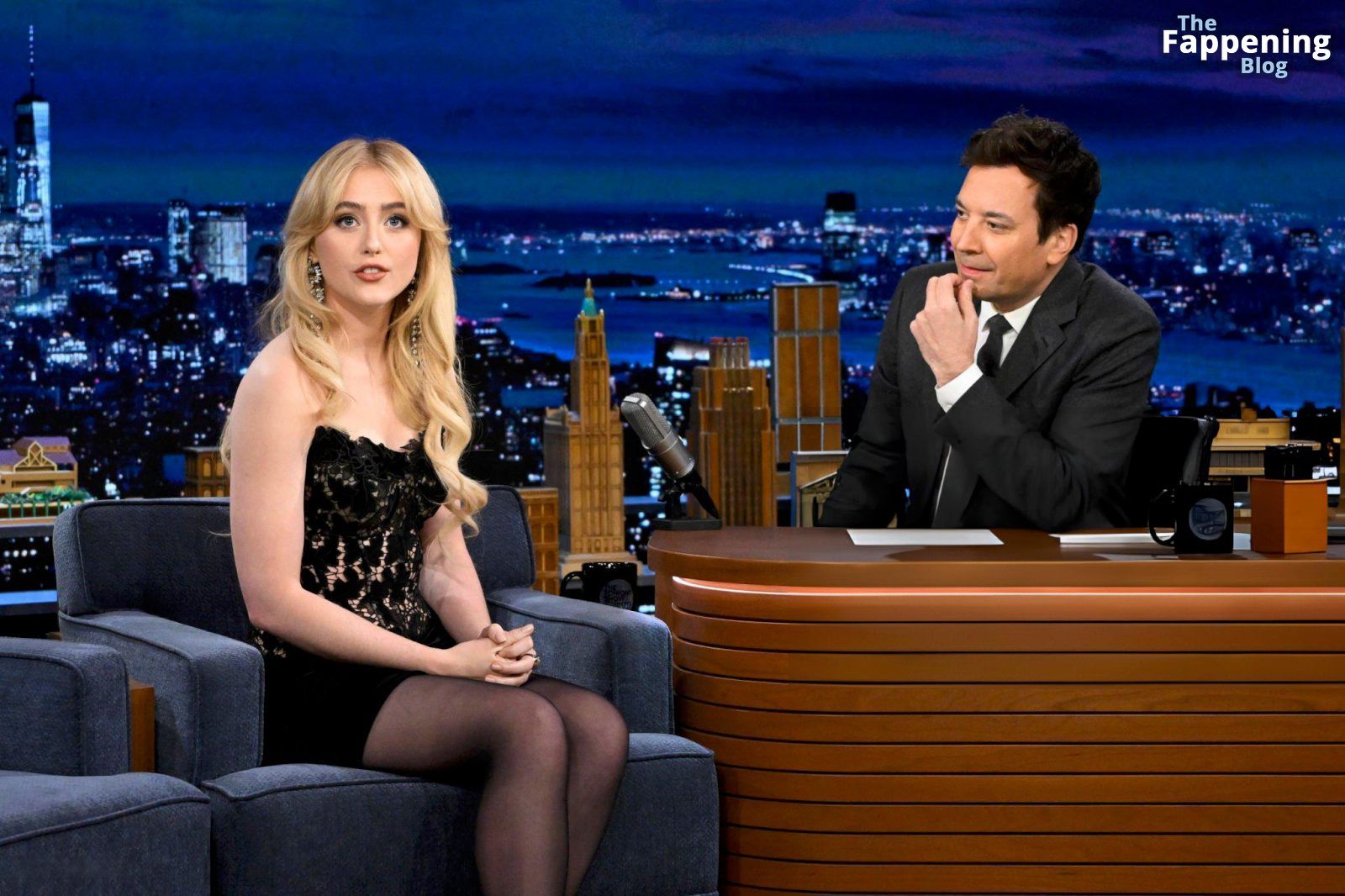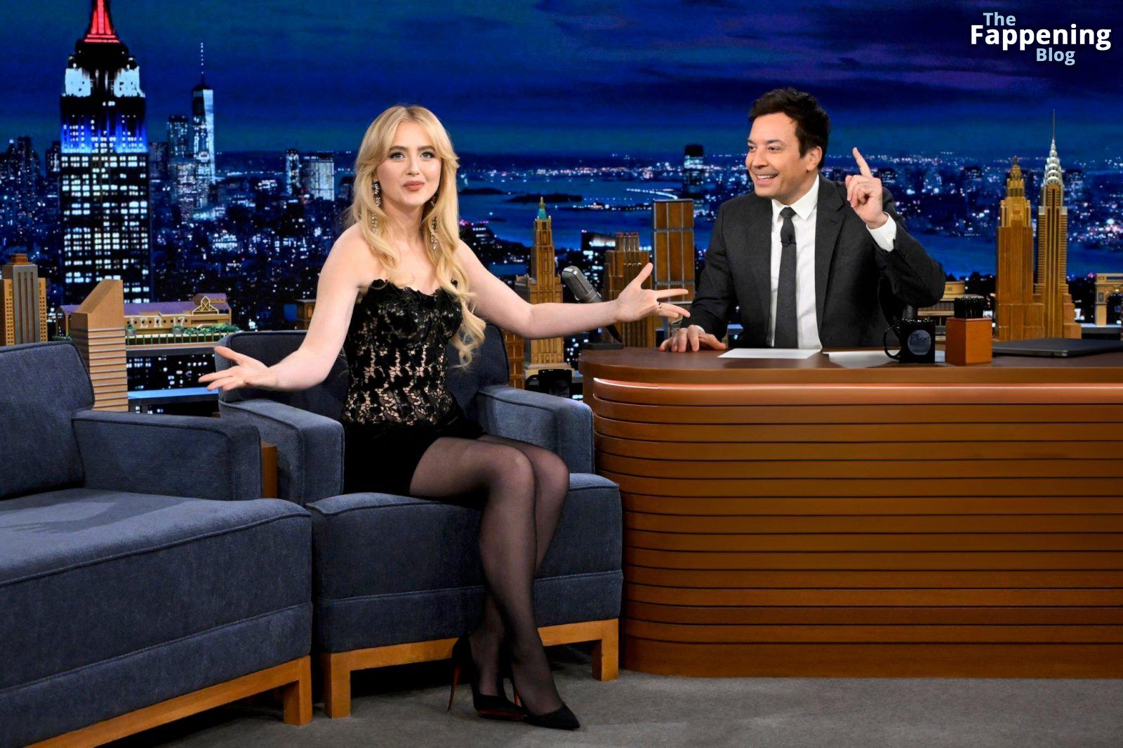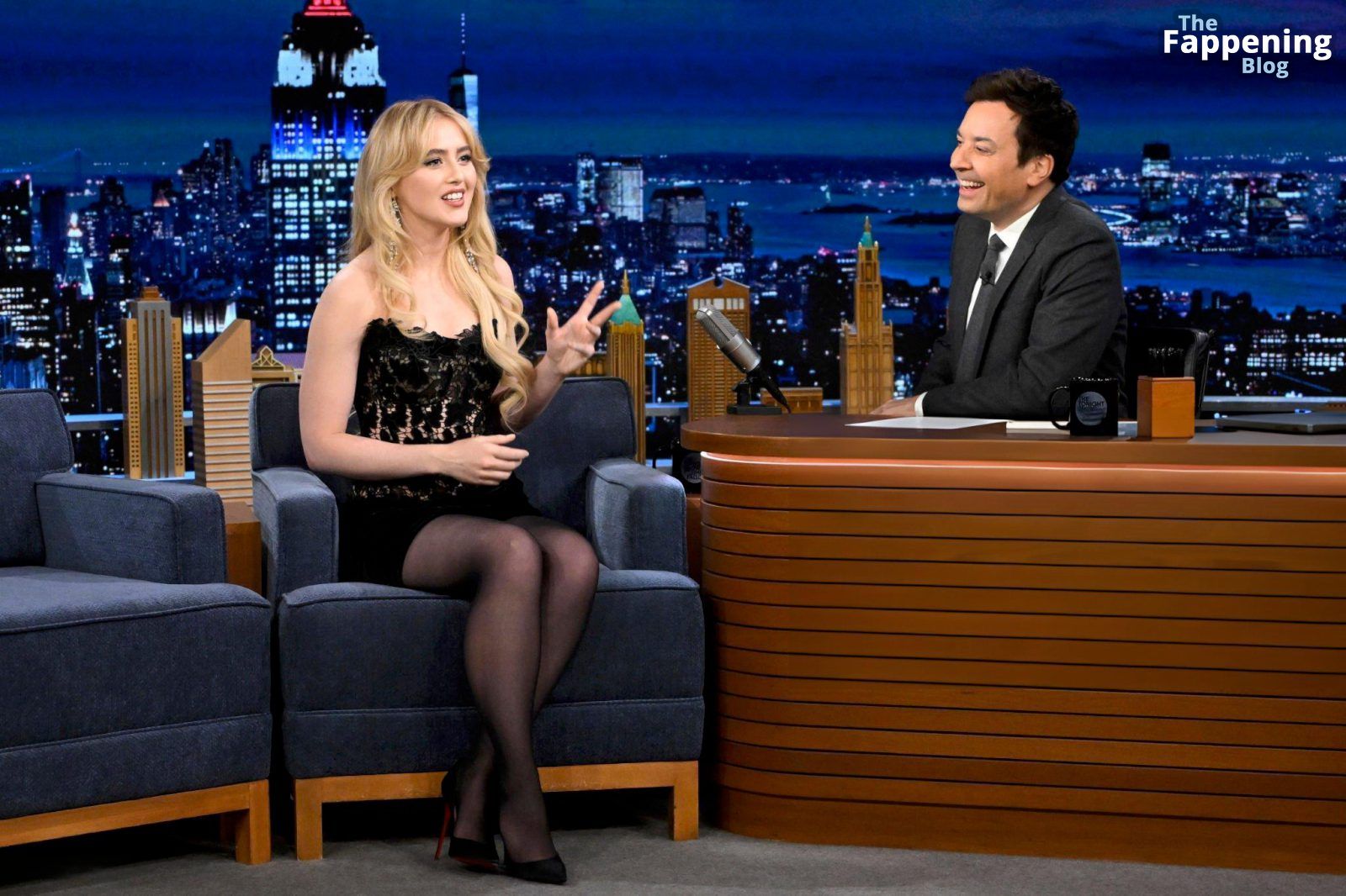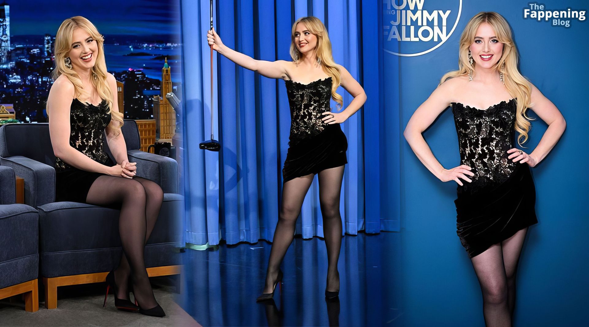 Echa un vistazo al increíble look de Kathryn Newton en “The Tonight Show”: lució un minivestido y medias negras con un toque de glamour total.
