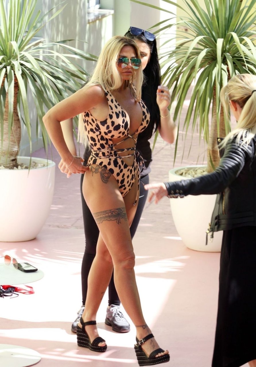 La modelo de glamour Katie Price (Jordan) fue vista canalizando sus instintos animales con un sexy conjunto de bikini de estampado de leopardo durante la sesión de fotos de su nueva colección de verano en Mallorca con la marca de ropa JYY London que se lanzará a finales de abril.