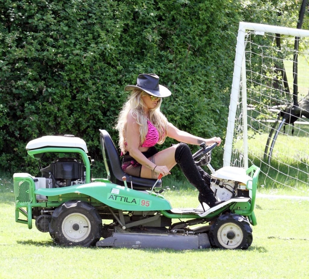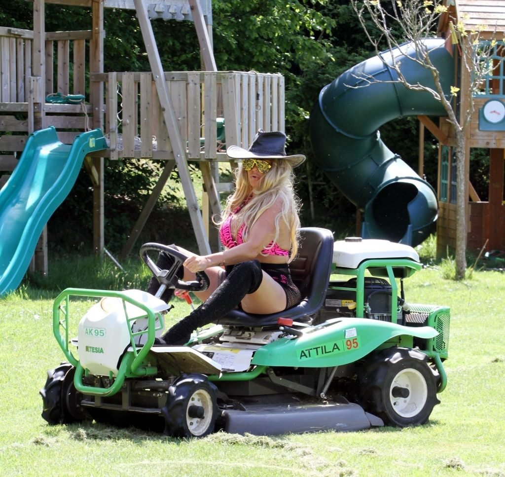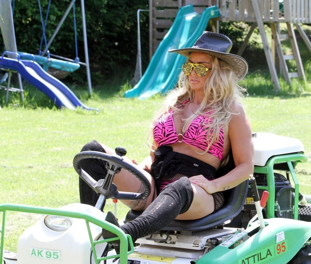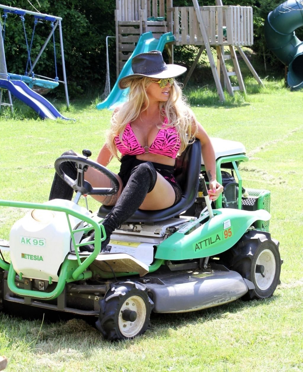 Katie Price (Jordan) fue fotografiada cortando su césped con un bikini de estampado animal, botas altas hasta el muslo y sombrero vaquero en Londres, 24/05/2019.