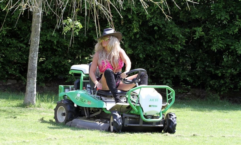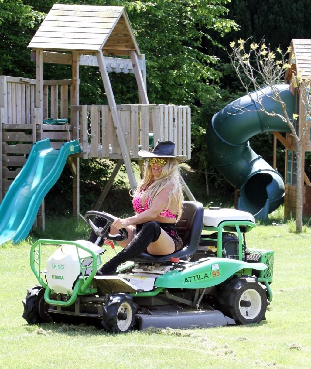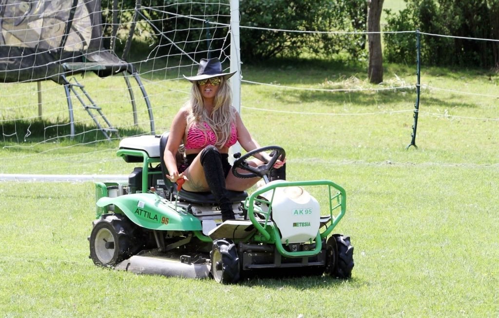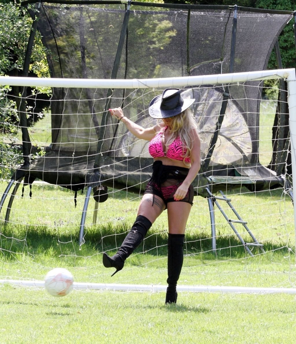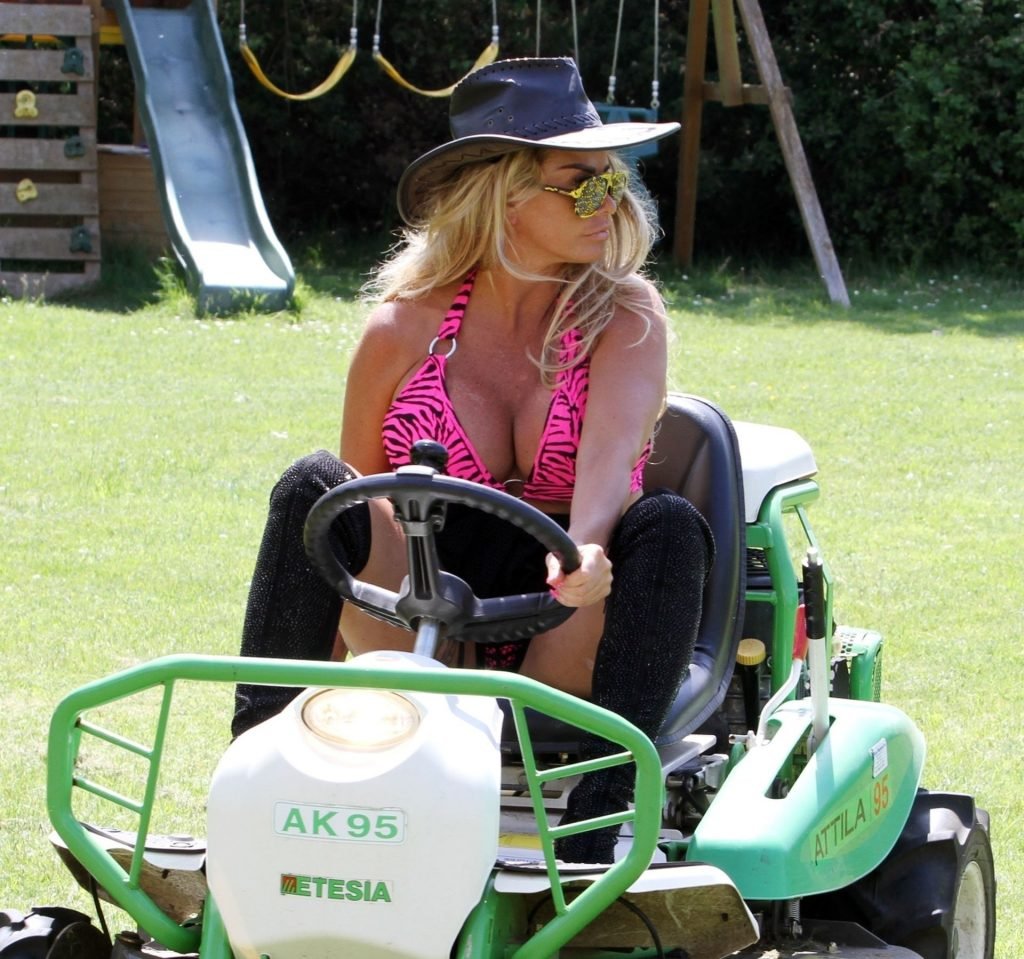Katie Price (Jordan) fue fotografiada cortando su césped con un bikini de estampado animal, botas altas hasta el muslo y sombrero vaquero en Londres, 24/05/2019.
