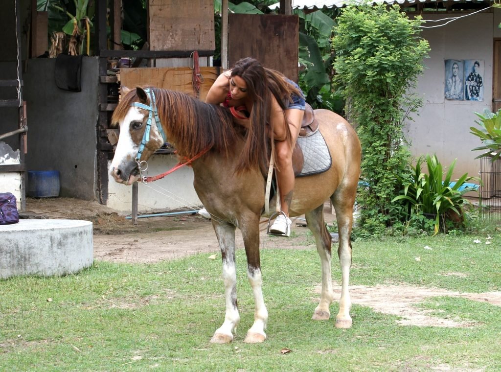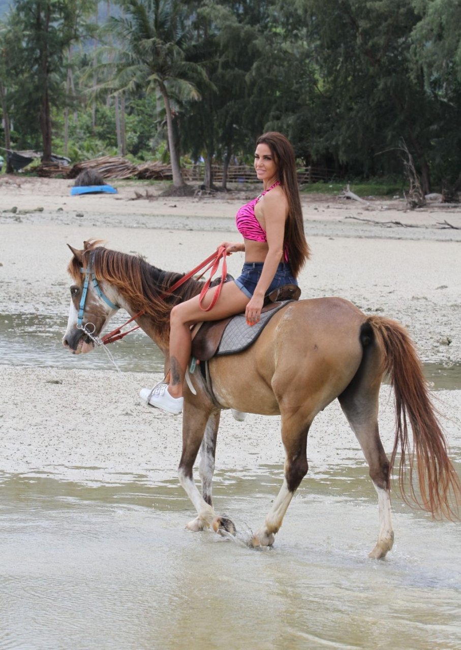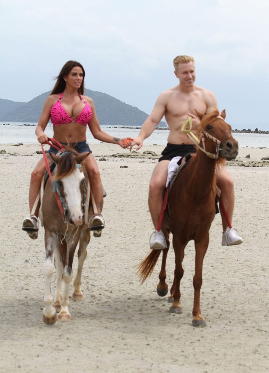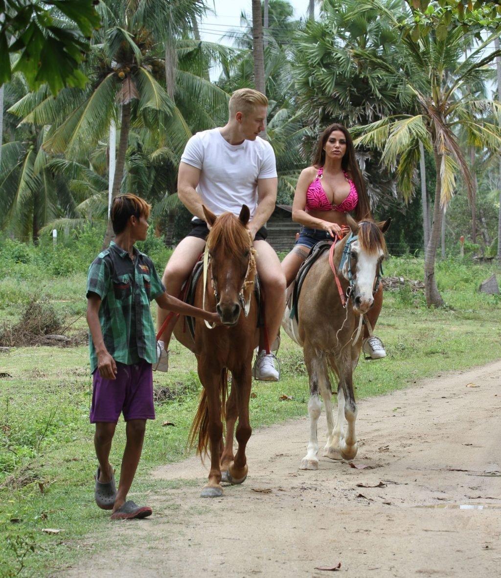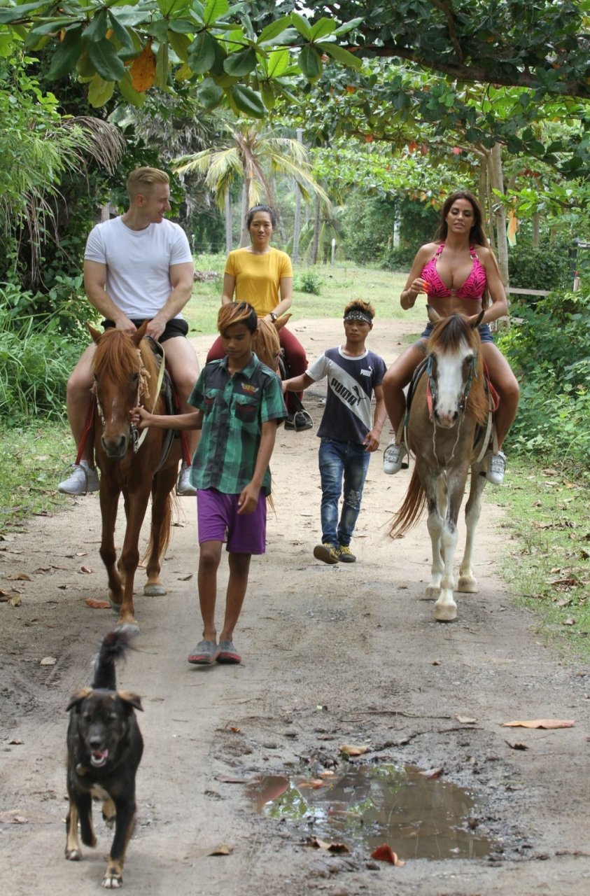 La modelo británica de 40 años Katie Price (o Jordan) con su novio Kris Boyson van a montar a caballo en las playas de Koh Samui, 22/07/2018. Katie montó a caballo y mostró un espectáculo impresionante exponiendo un escote serio con un sujetador rosa ajustado y estampado. Kris montó sin camisa mientras la pareja llevaba cuidadosamente sus caballos de regreso a los establos.