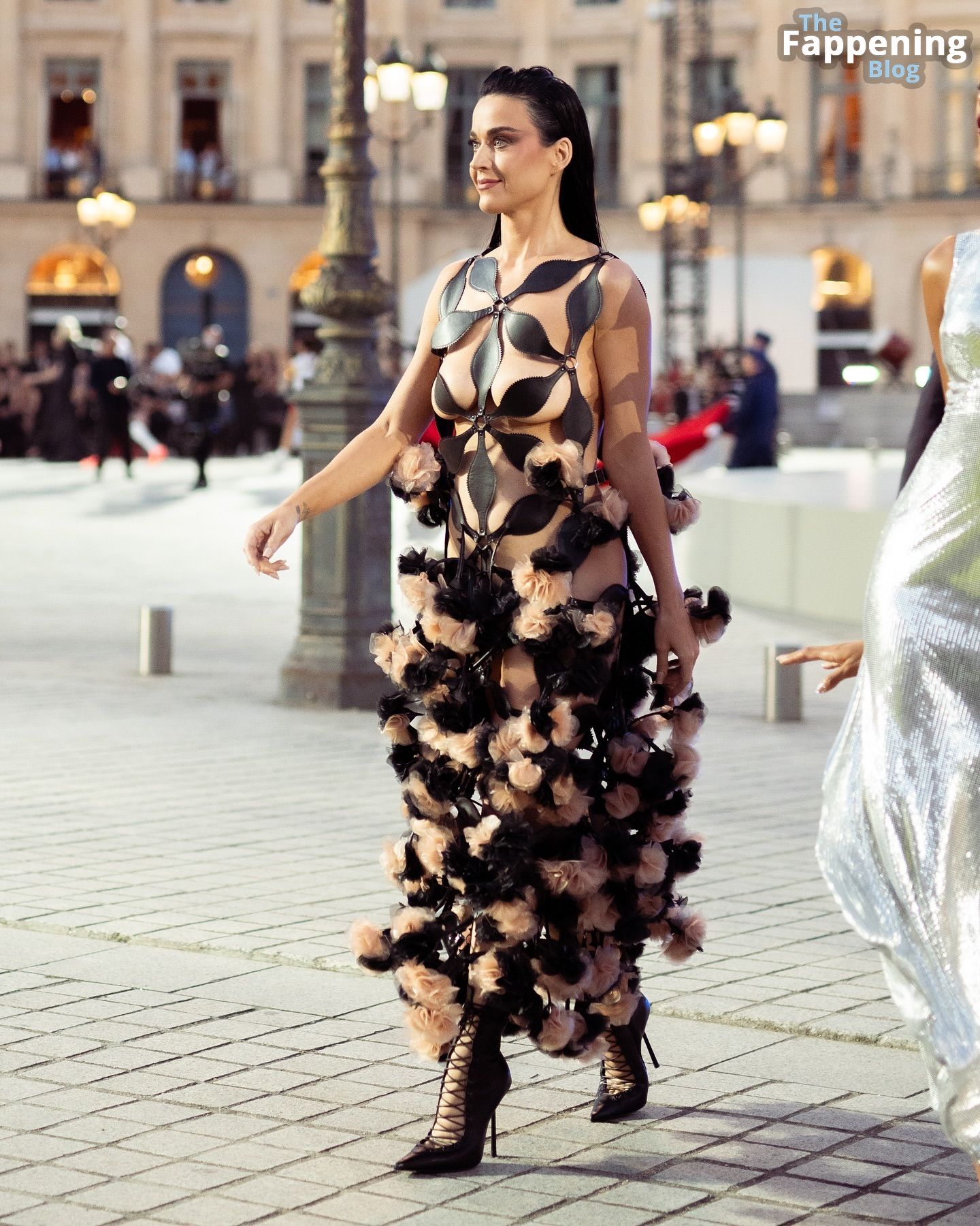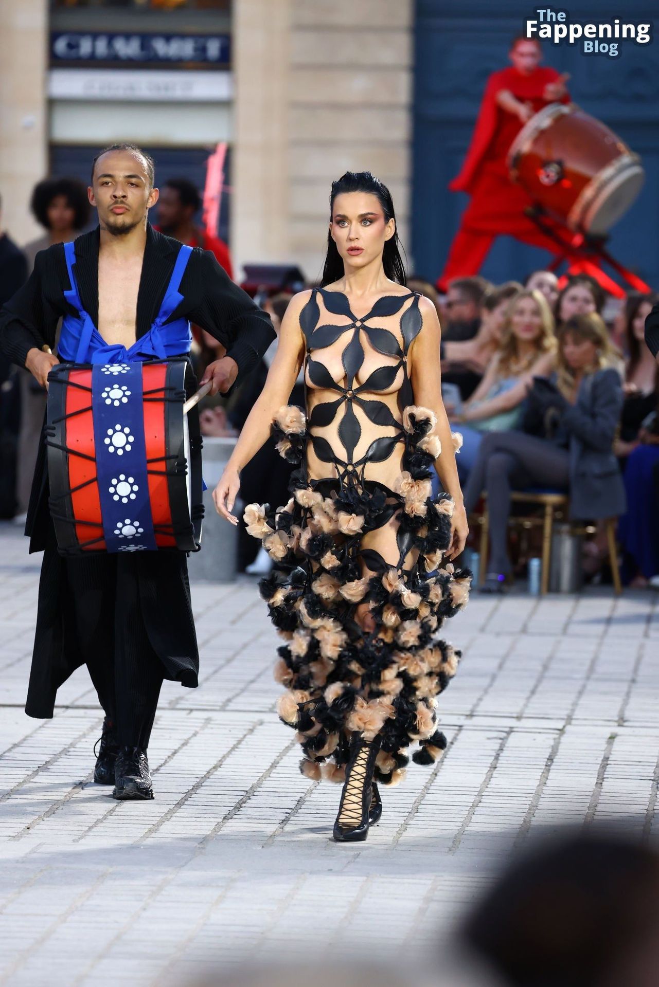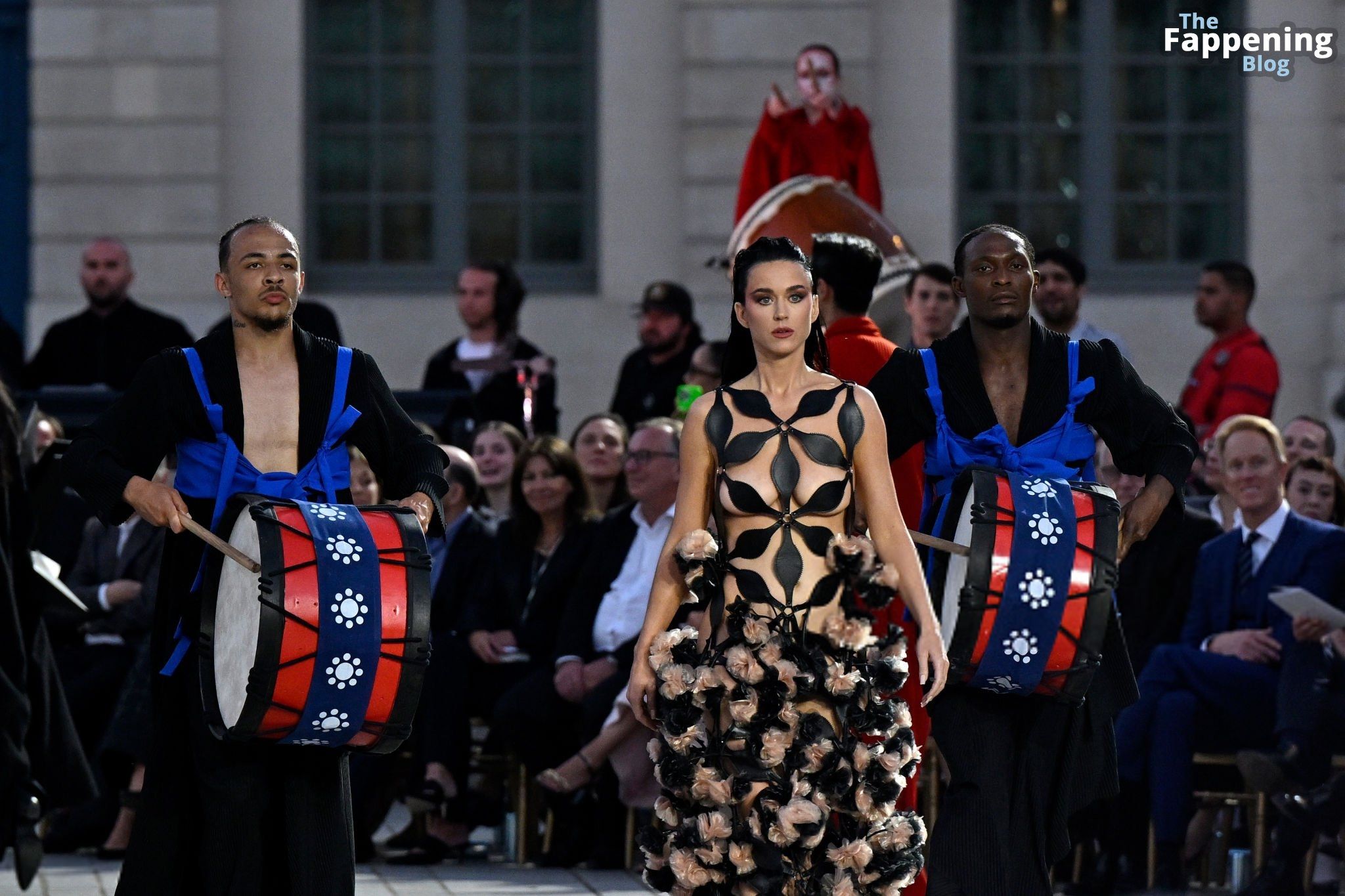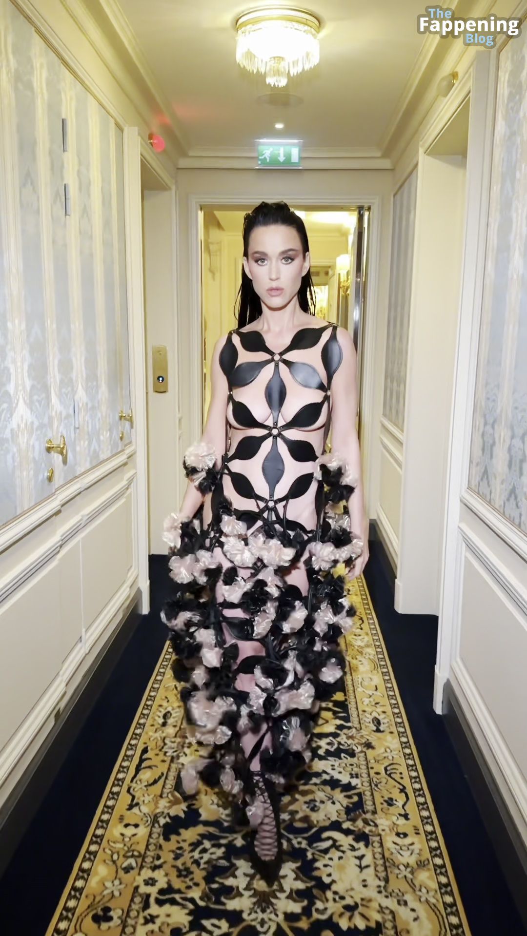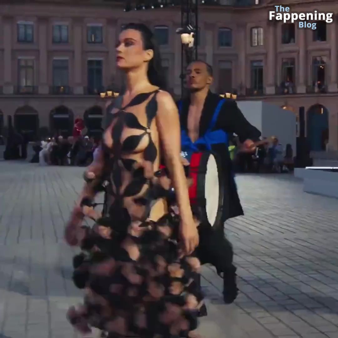 Katy Perry casi revela el secreto con un vestido nude de cortes geométricos, haciendo una aparición sorpresa en la pasarela de Vogue World París.