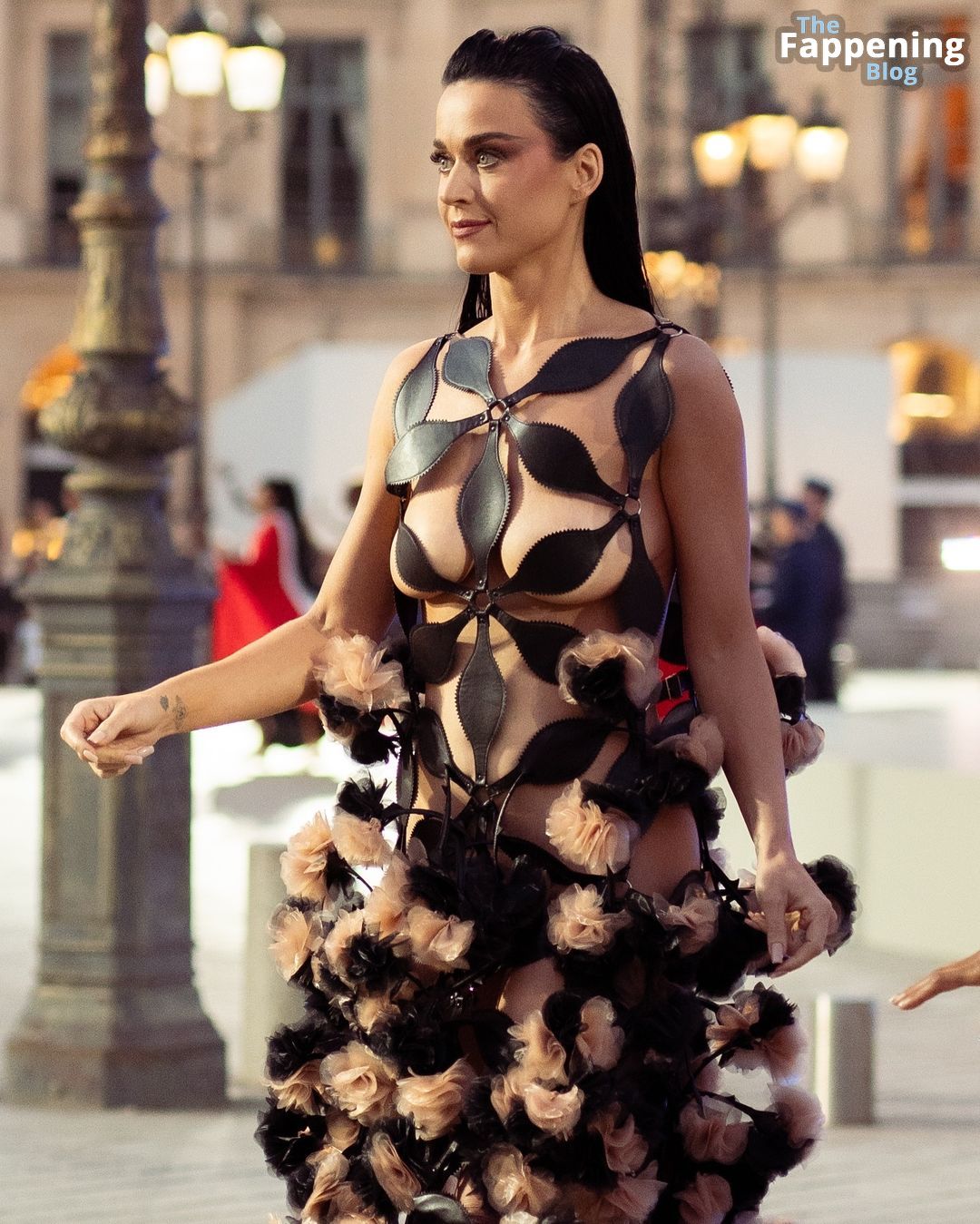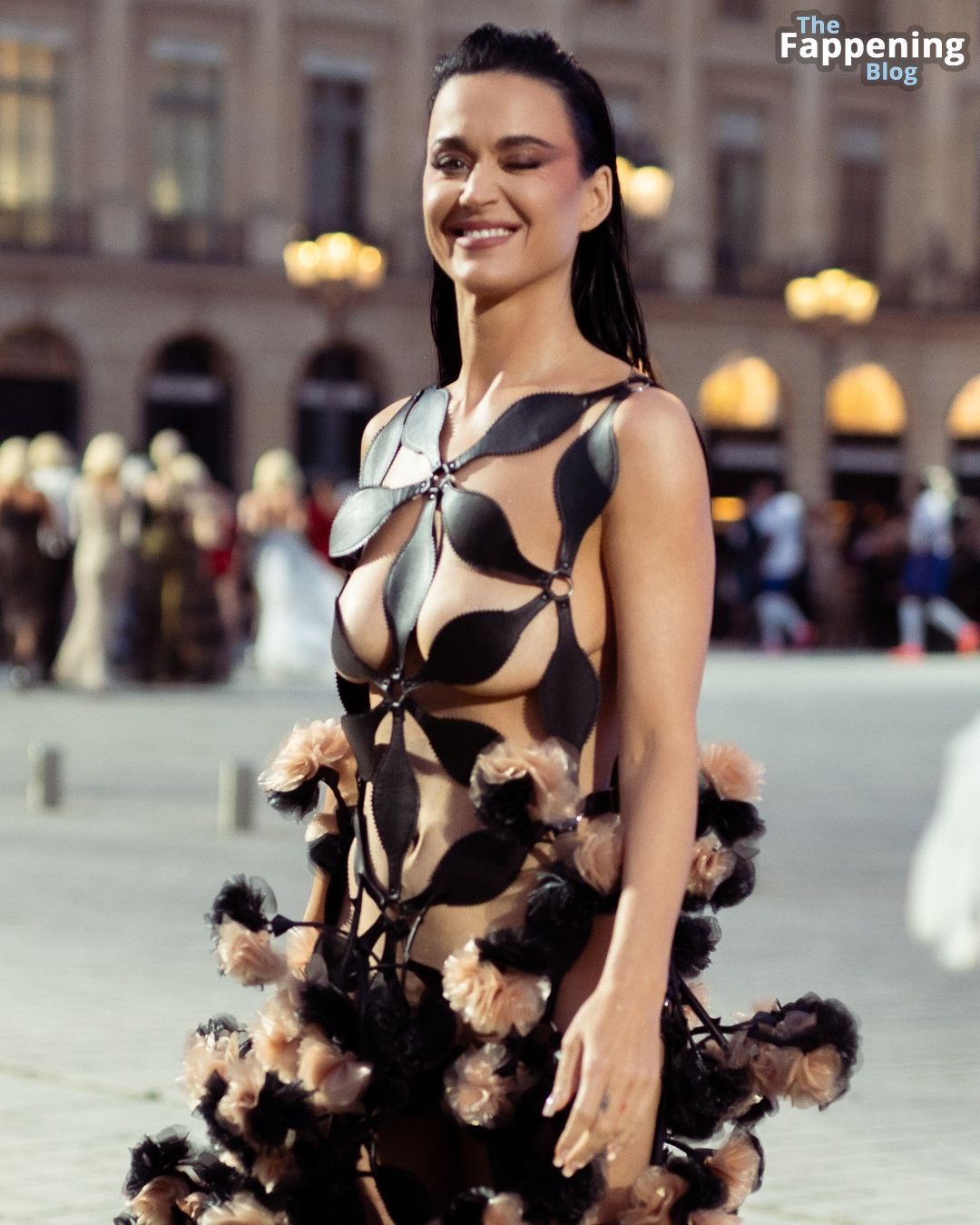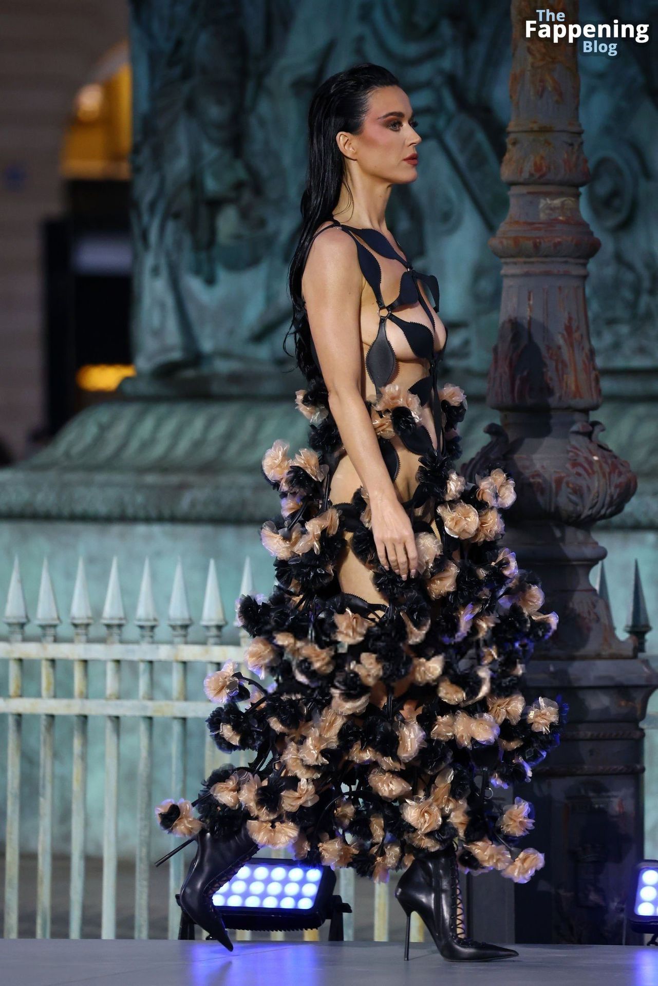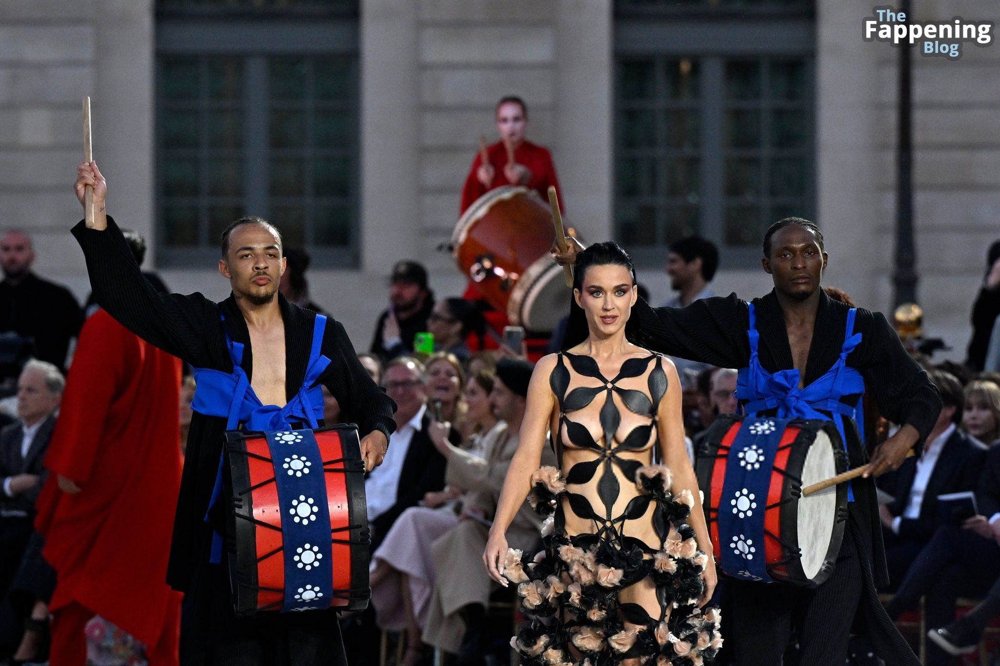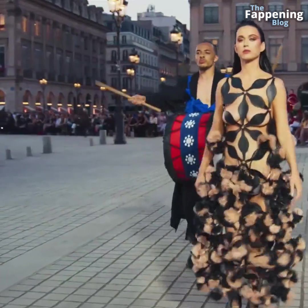 Katy Perry casi revela el secreto con un vestido nude de cortes geométricos, haciendo una aparición sorpresa en la pasarela de Vogue World París.