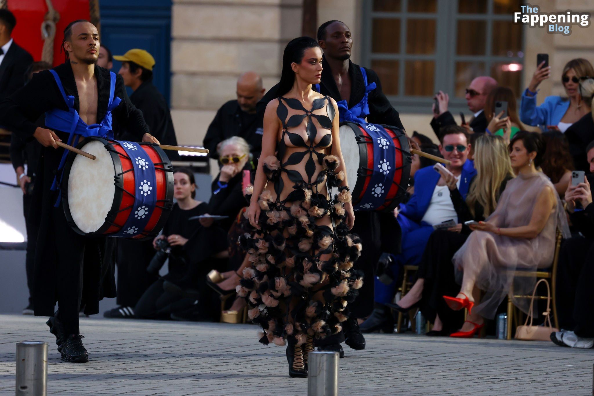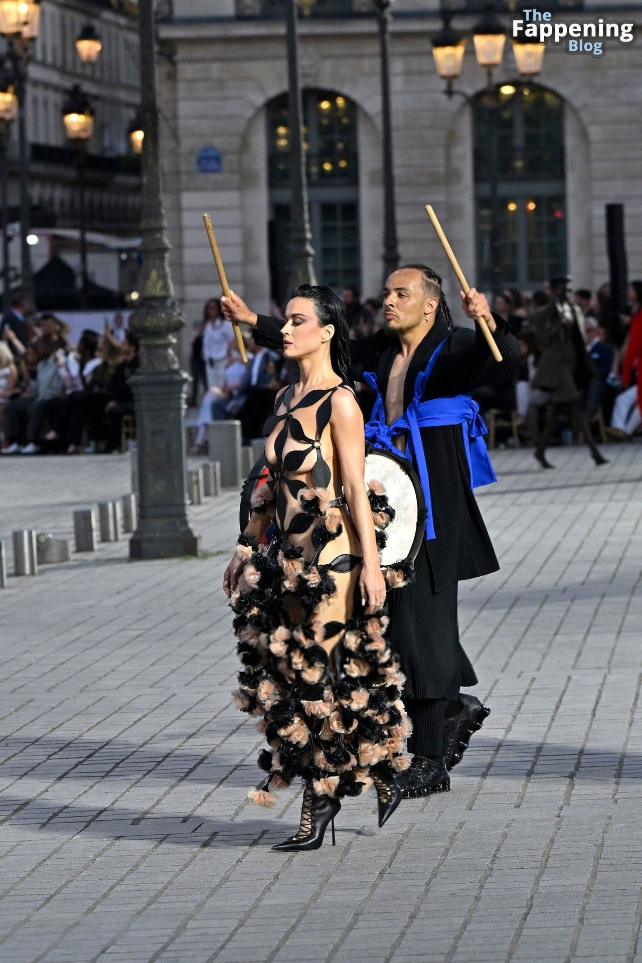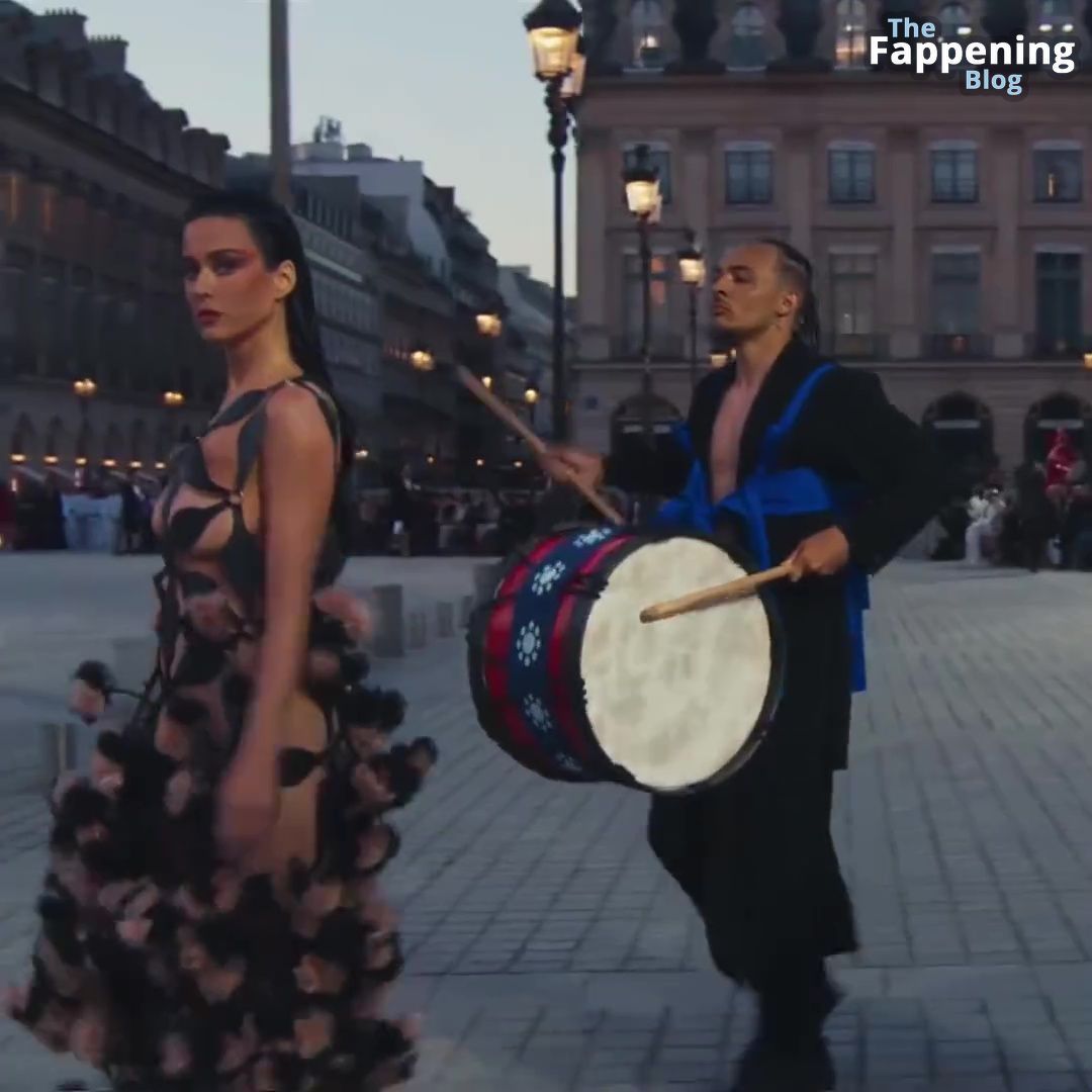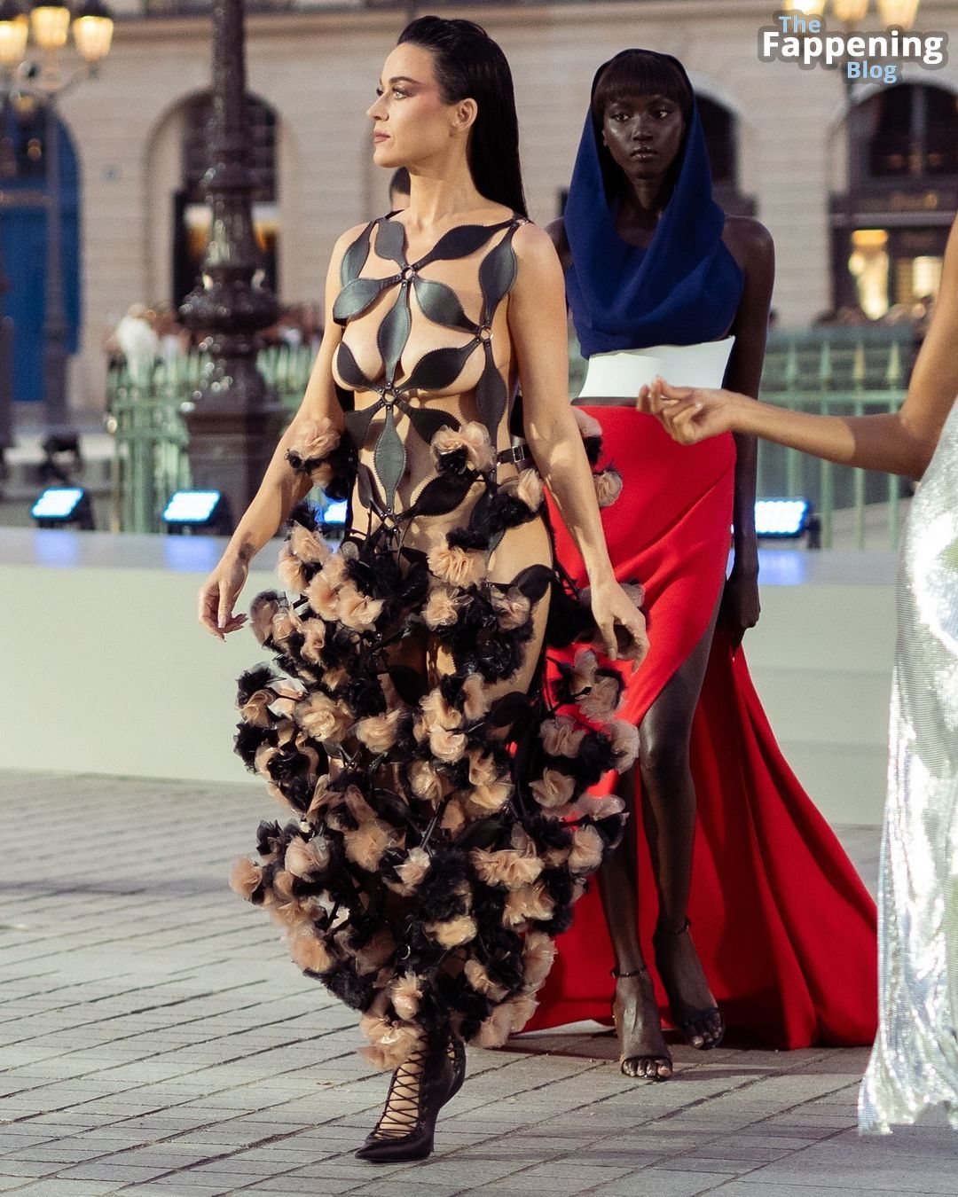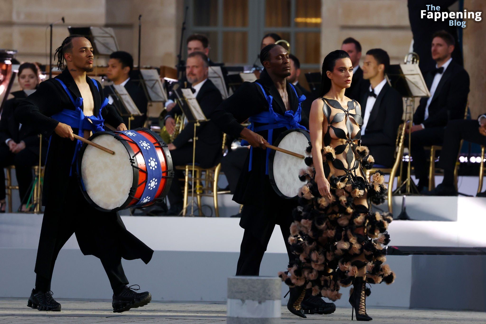 Katy Perry casi revela el secreto con un vestido nude de cortes geométricos, haciendo una aparición sorpresa en la pasarela de Vogue World París.