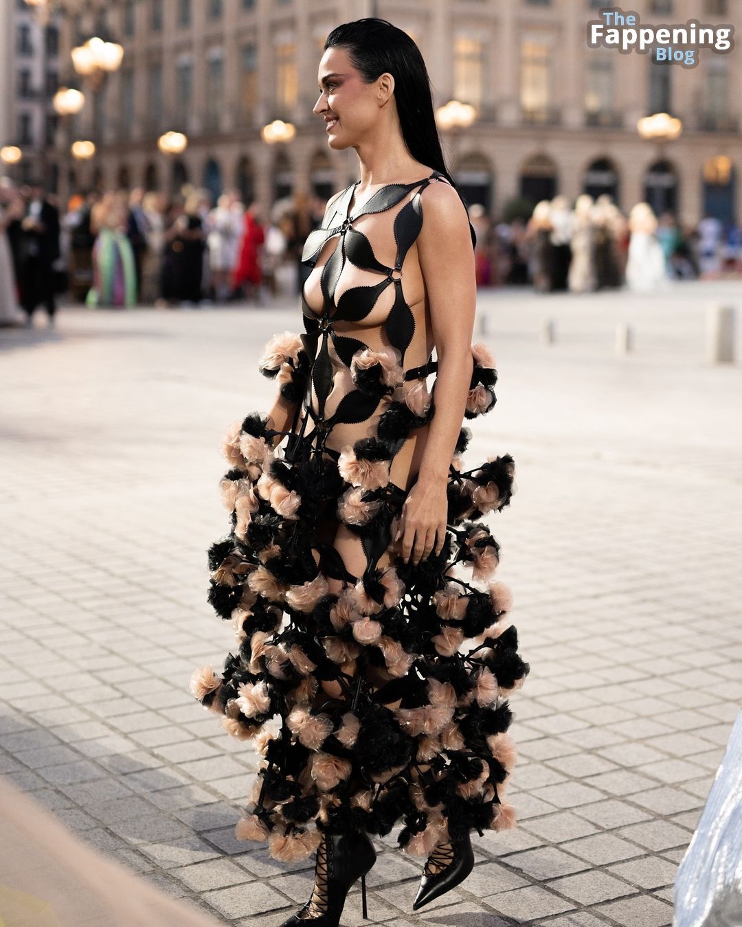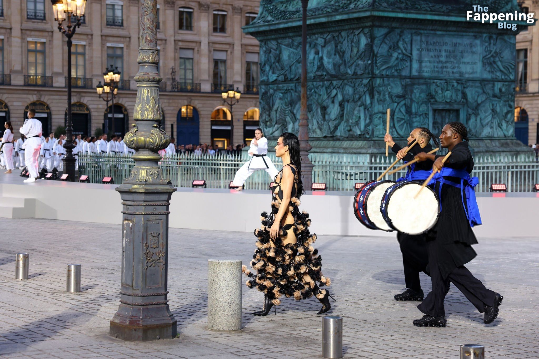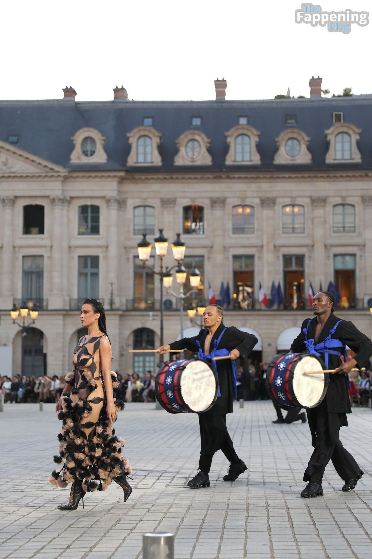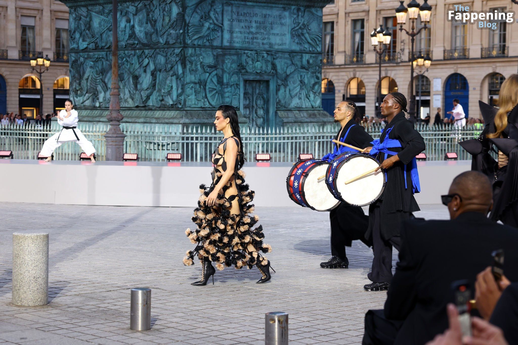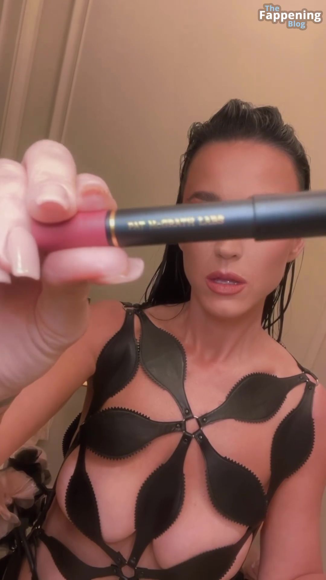 Katy Perry casi revela el secreto con un vestido nude de cortes geométricos, haciendo una aparición sorpresa en la pasarela de Vogue World París.