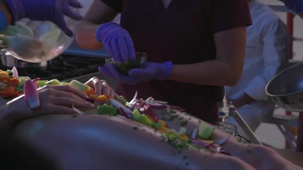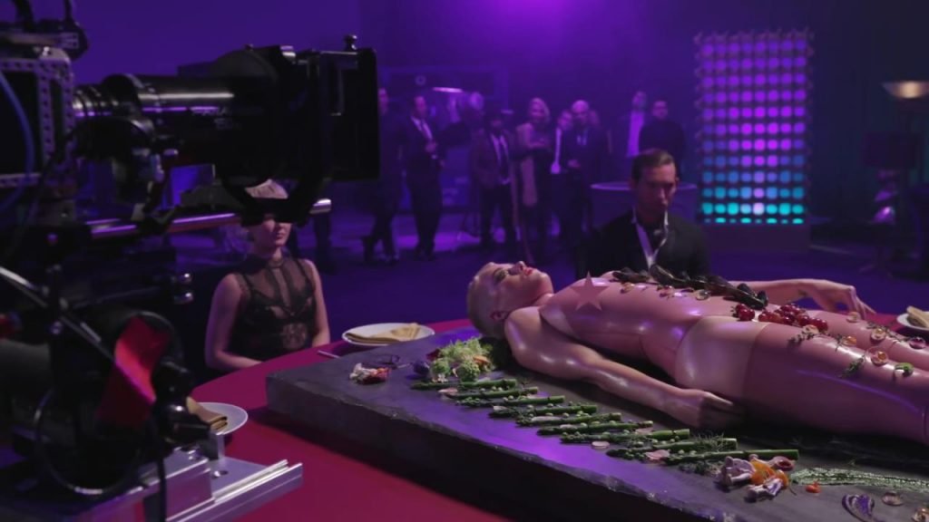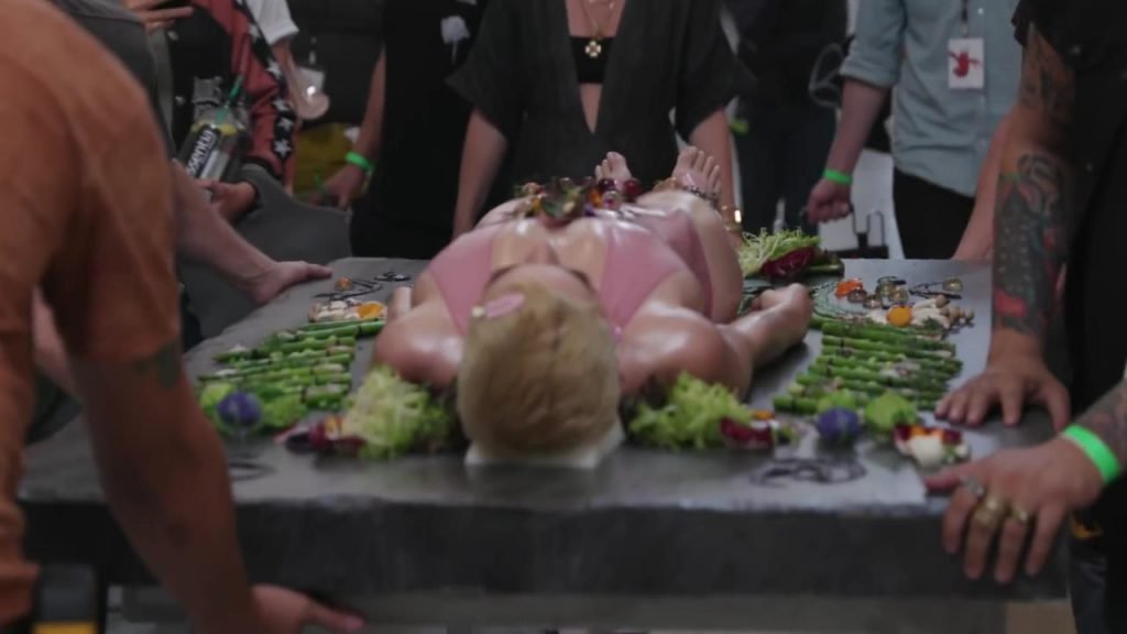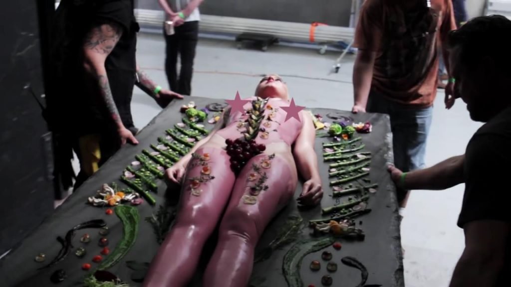 Ella se llama feminista, luego se acuesta en la mesa, casi desnuda, dejando que la gente coma de ella...