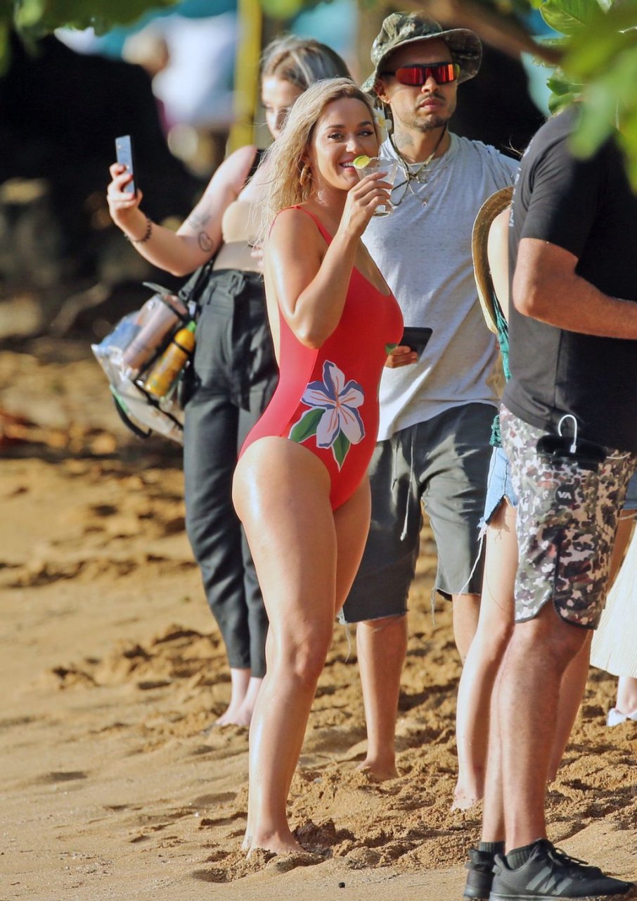 La cantante Katy Perry (34) fue fotografiada con un traje de baño rojo mientras grababa un nuevo video musical en la playa de Hawái, 07/02/2019.