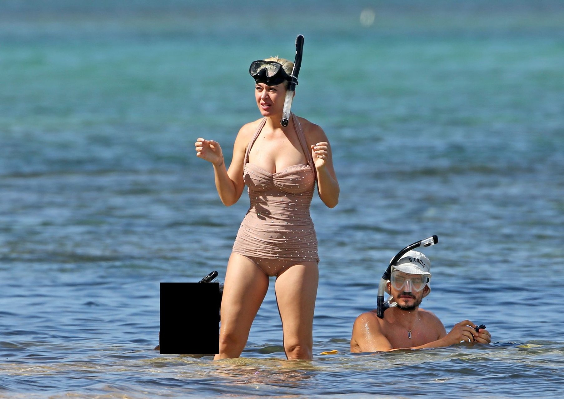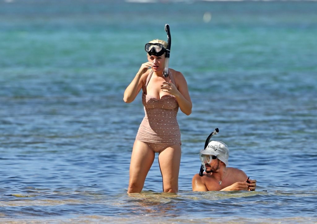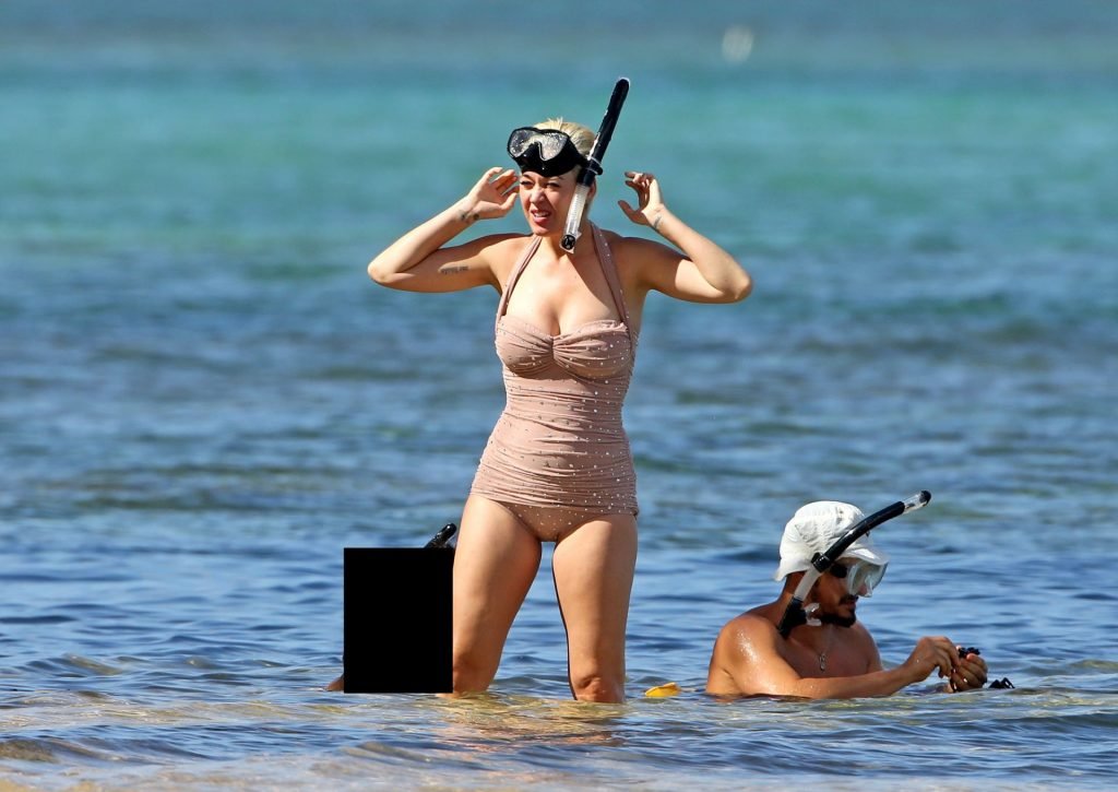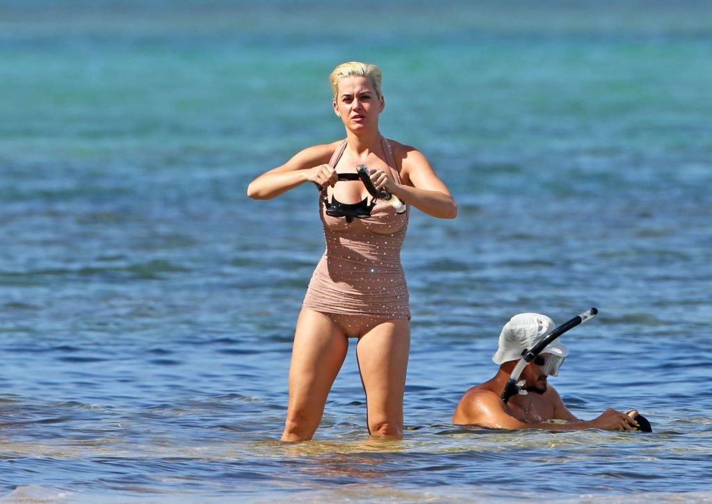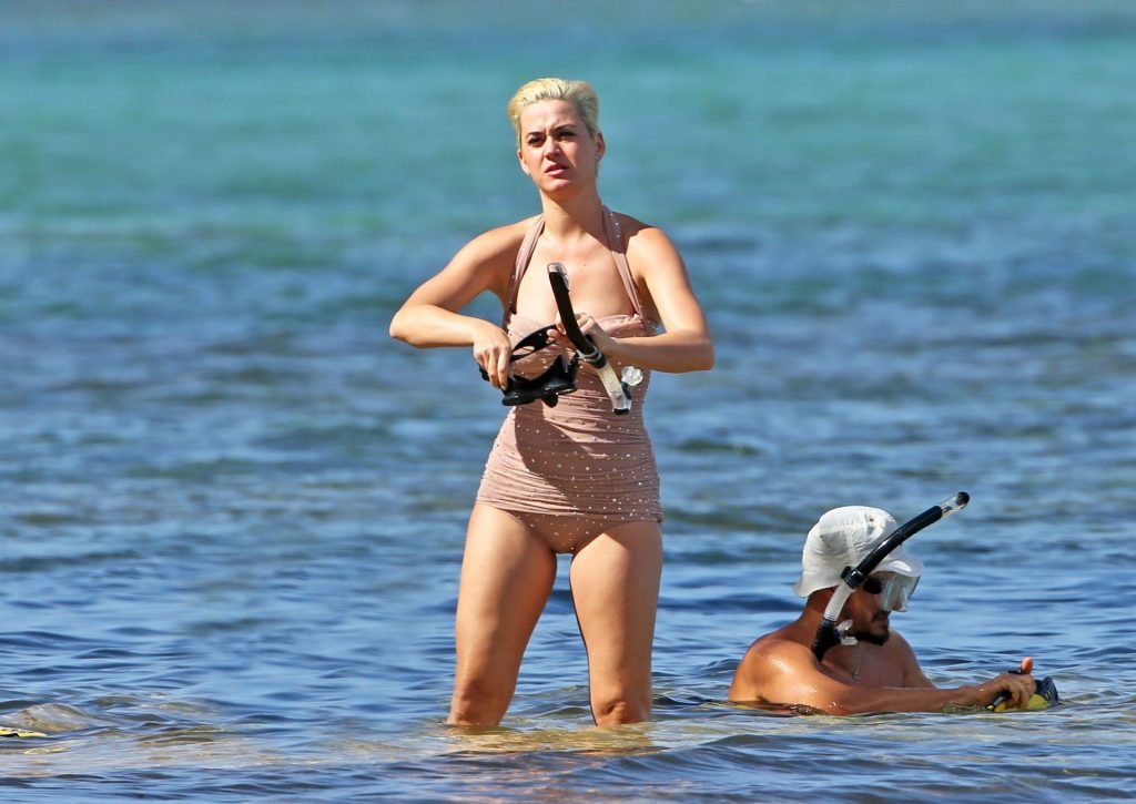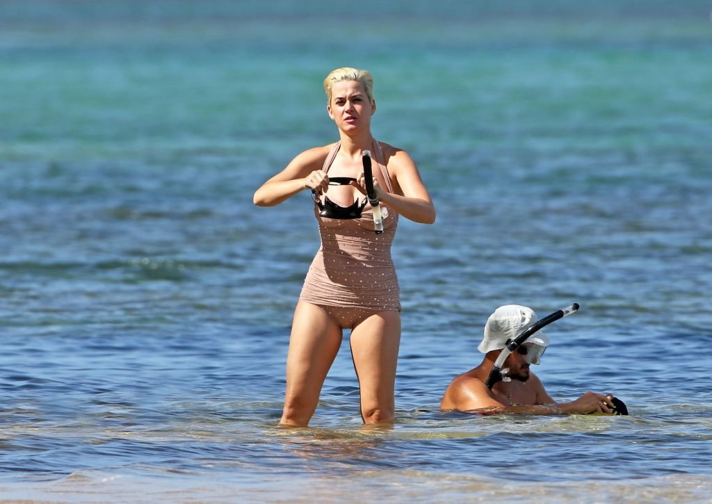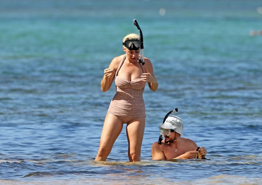 Katy Perry (34) y Orlando Bloom hacen esnórquel en Hawái durante las vacaciones de Navidad, 24/12/2018. Katy lucía genial con un traje de baño de una pieza color rosa pálido con pedrería mientras Orlando nadaba alrededor de sus pies en el cálido océano.