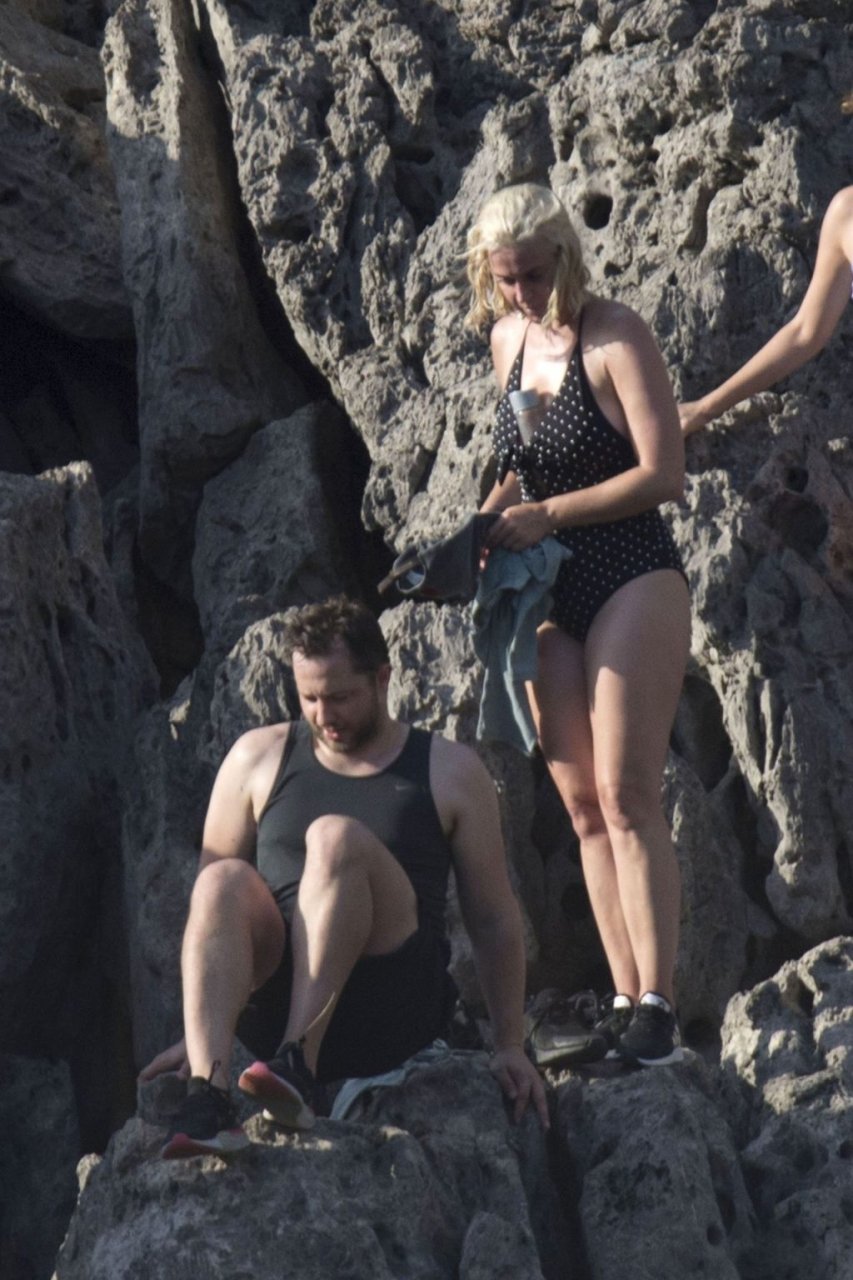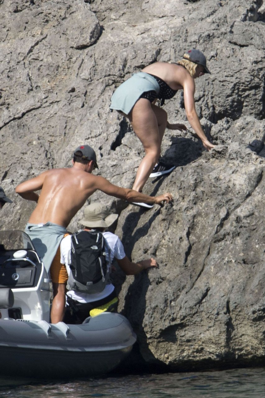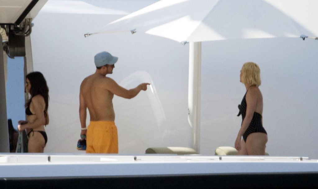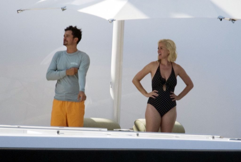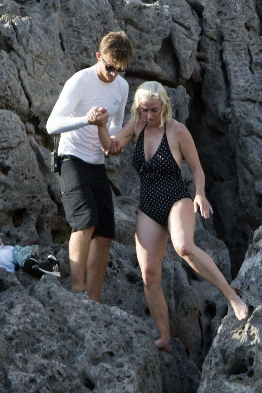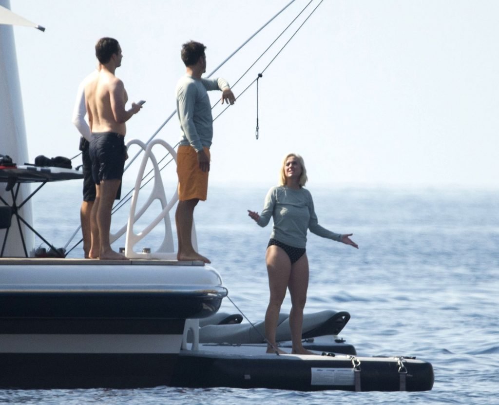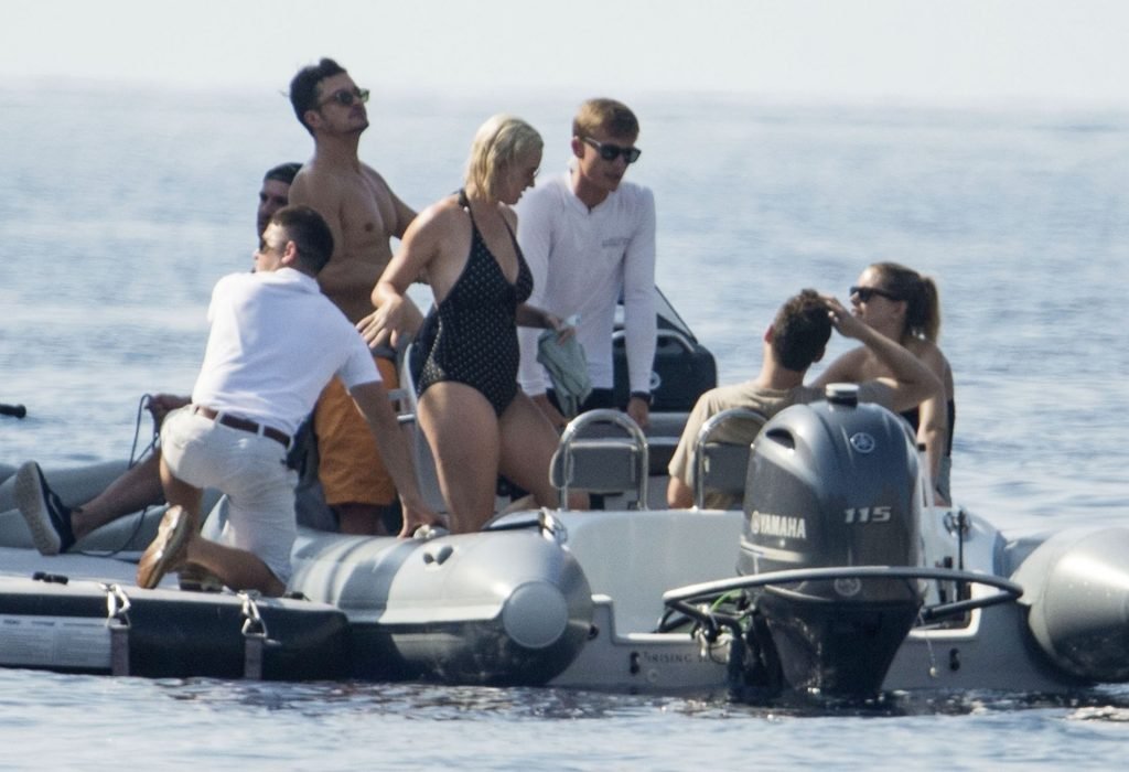 La feliz pareja fue vista escalando un acantilado juntos antes de saltar al mar, Katy mostró una cara valiente al lanzarse desde el acantilado mientras sus amigos la animaban. Luego, el grupo regresó a su megayate de lujo donde se relajaron juntos acompañados por algunos amigos que incluían a la ex de Roman Abramovich, Dasha Zhukova, el periodista estadounidense Derek Blasberg y la pareja poderosa Michael Kives y Lydia Gray Kives.
