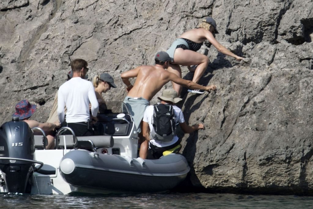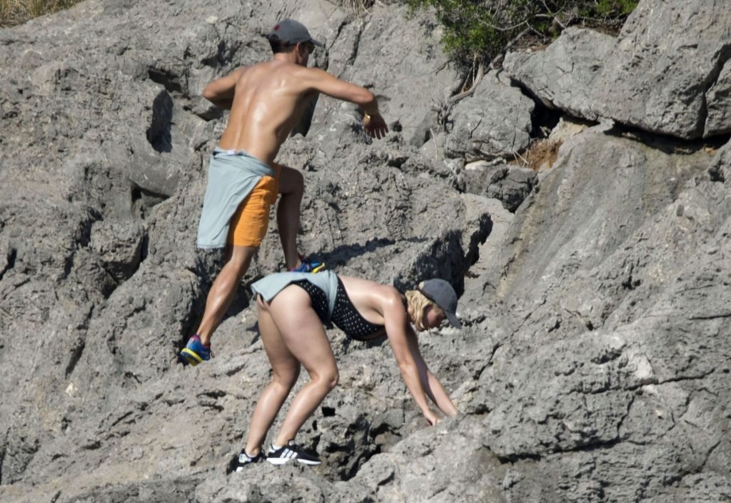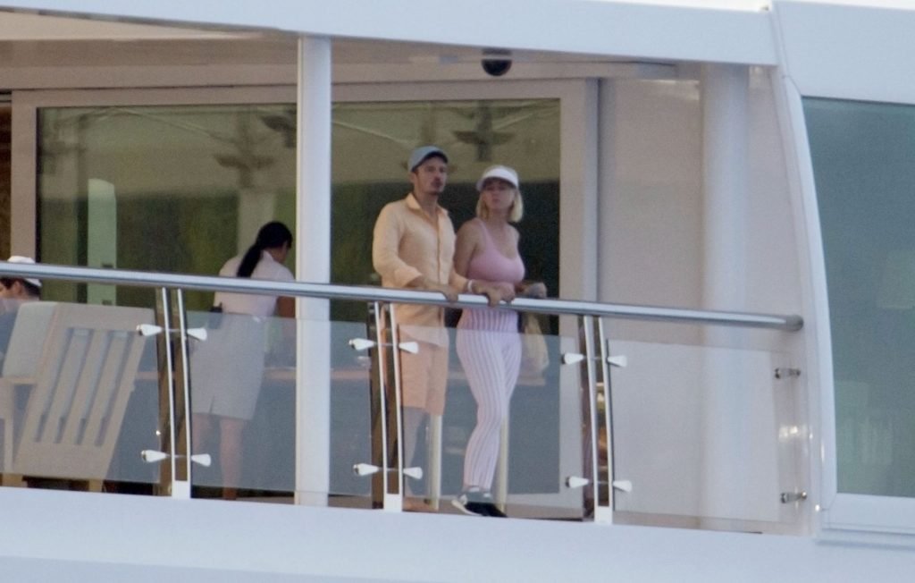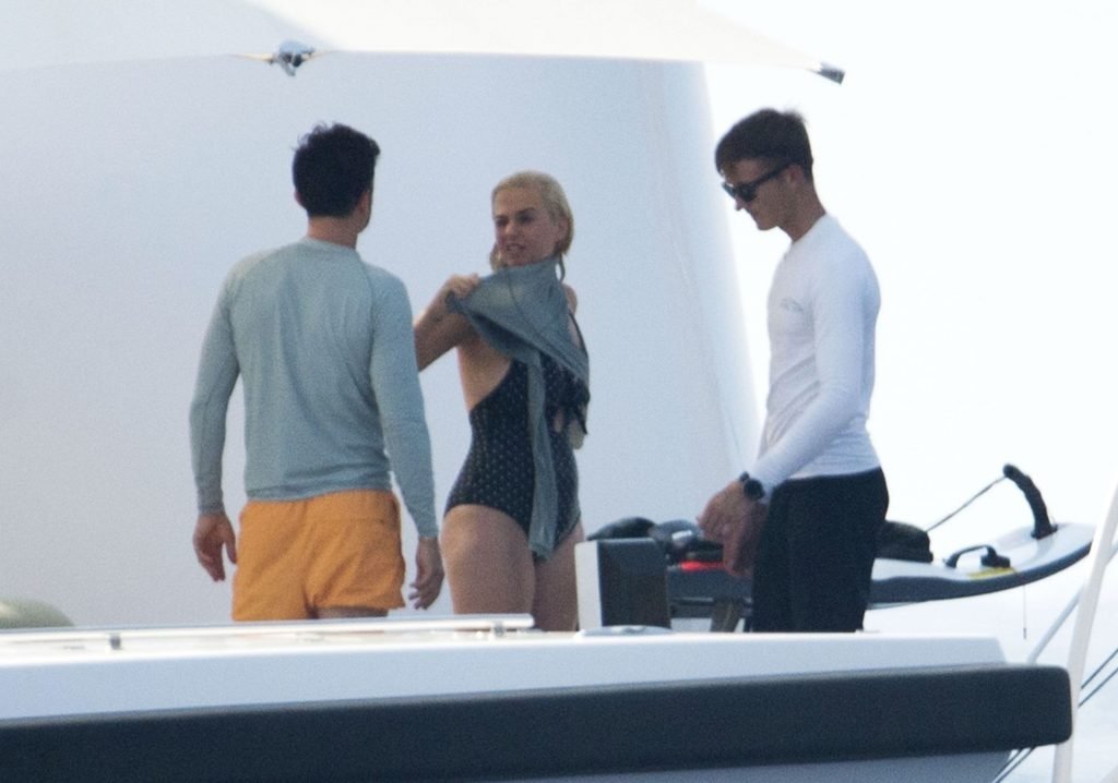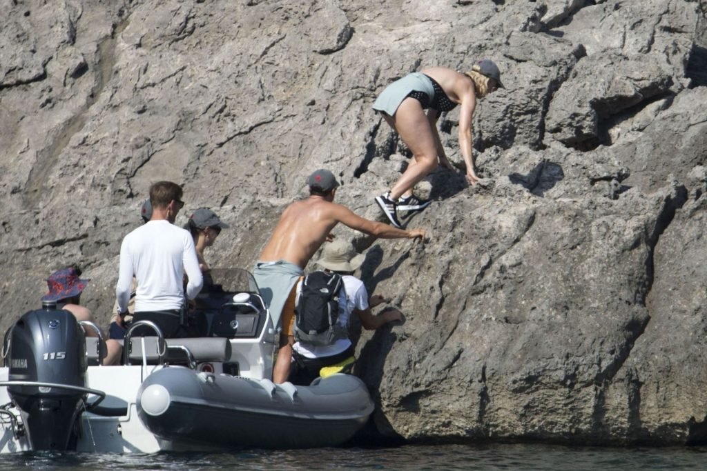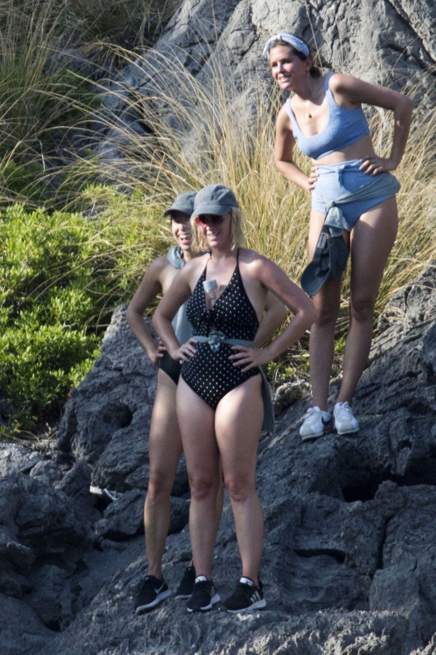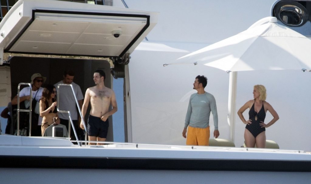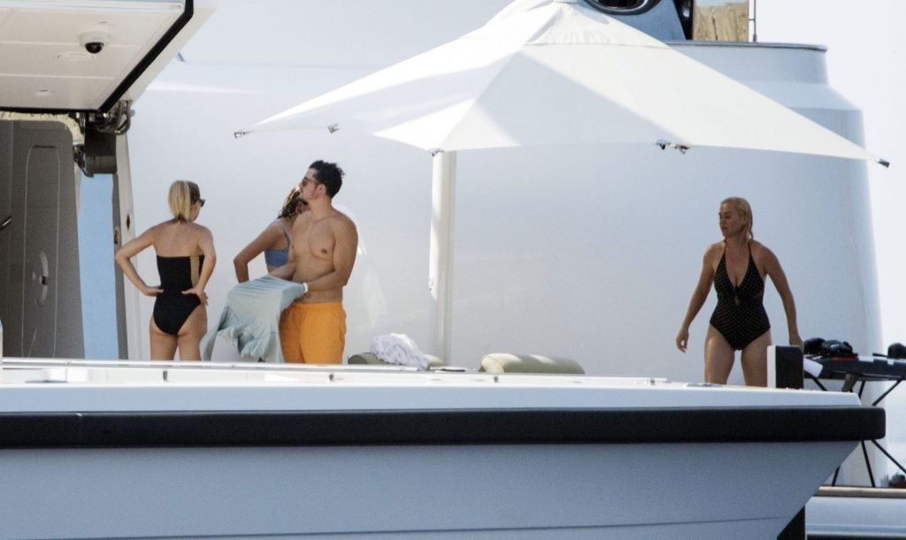 La feliz pareja fue vista escalando un acantilado juntos antes de saltar al mar, Katy mostró una cara valiente al lanzarse desde el acantilado mientras sus amigos la animaban. Luego, el grupo regresó a su megayate de lujo donde se relajaron juntos acompañados por algunos amigos que incluían a la ex de Roman Abramovich, Dasha Zhukova, el periodista estadounidense Derek Blasberg y la pareja poderosa Michael Kives y Lydia Gray Kives.