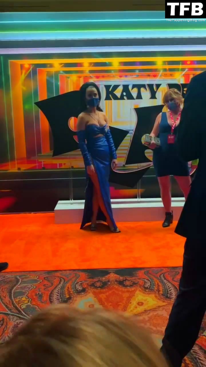 Singer Katy Perry provoca a los fans con sus pechos, posando con un vestido azul en la alfombra antes de su concierto en Las Vegas, 31/12/2021.