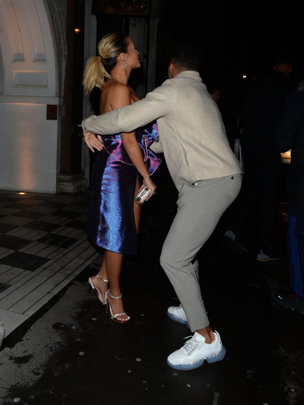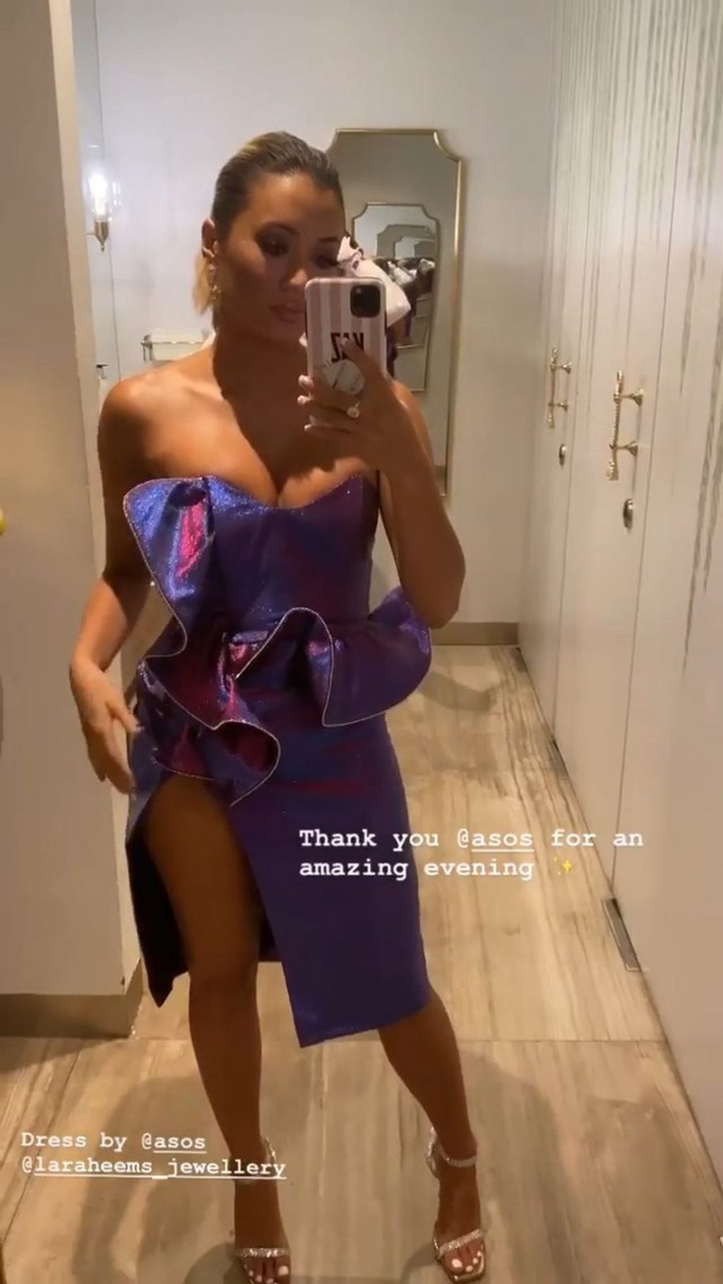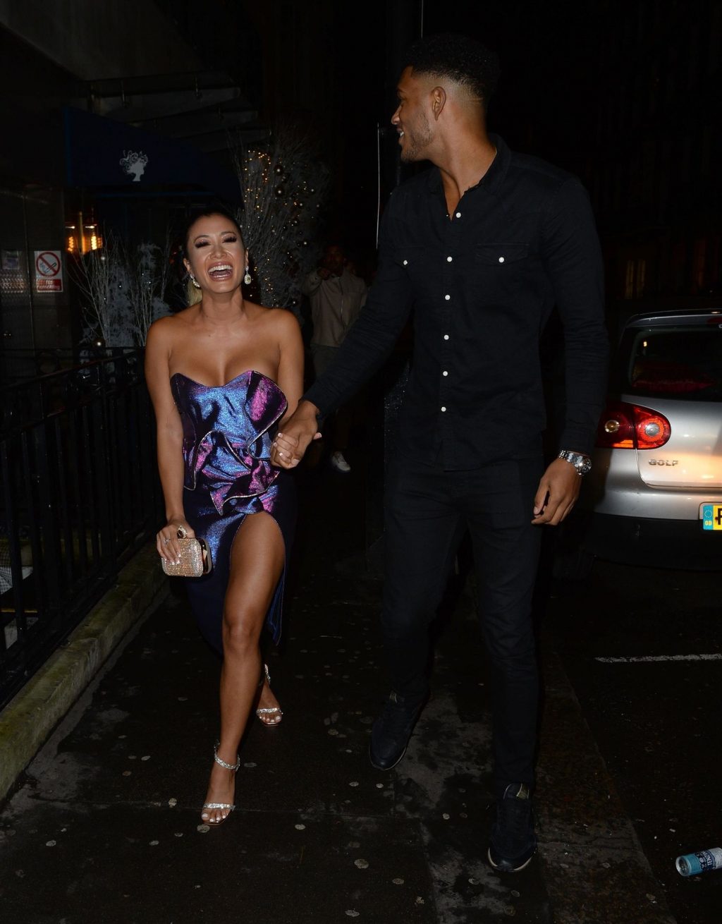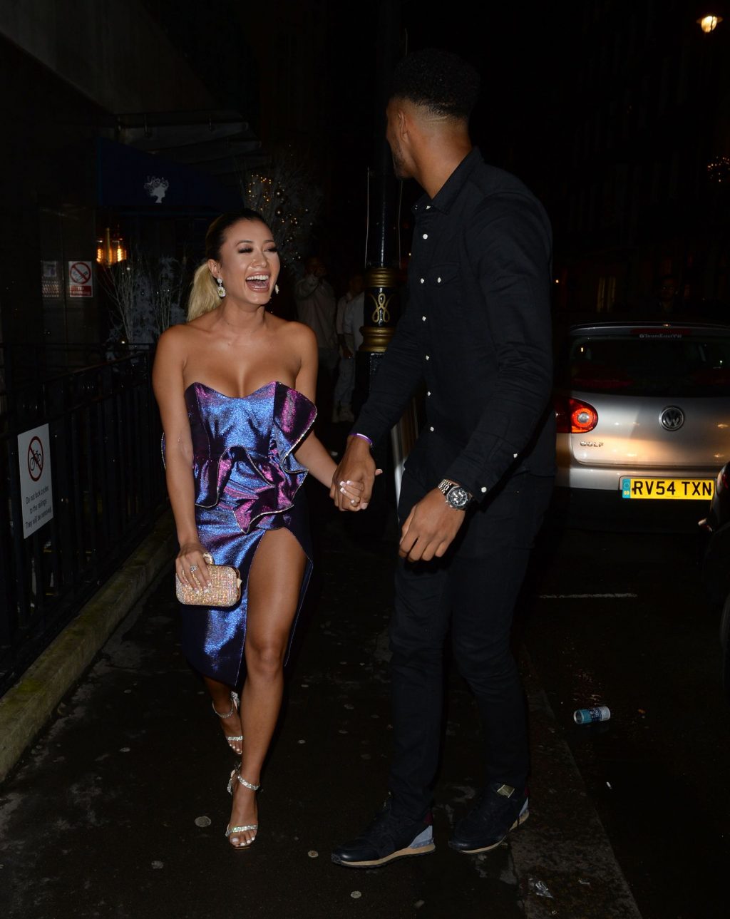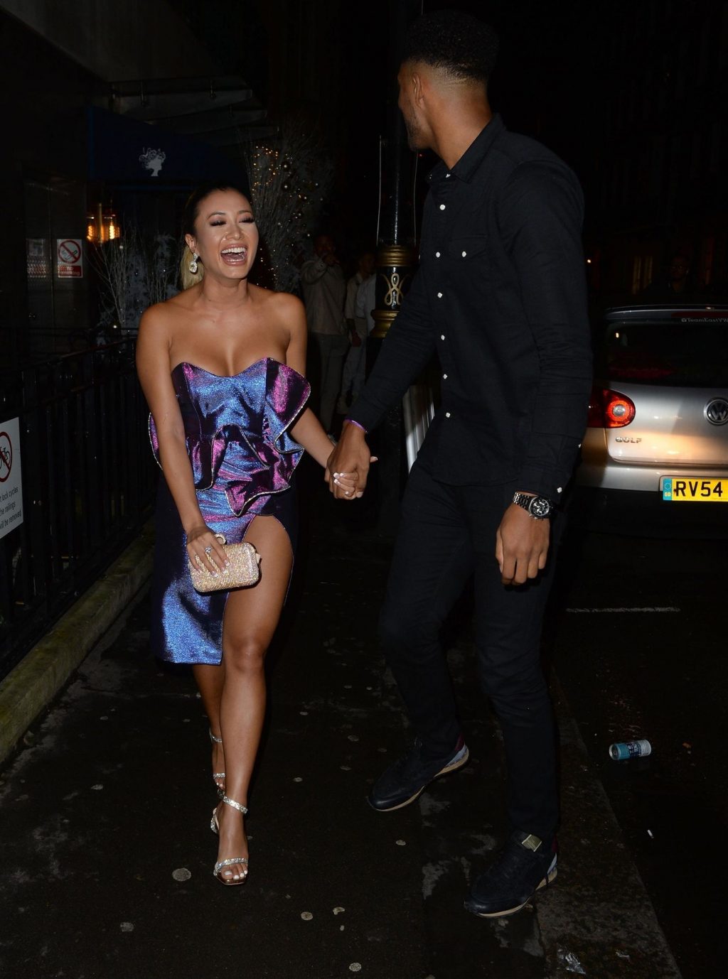 Leggy y con busto, la estrella de “Love Island” Kazimir “Kaz” Crossley fue vista con un vestido púrpura junto a Theo Campbell en la fiesta en Bagatelle en Londres, 27/11/2019.