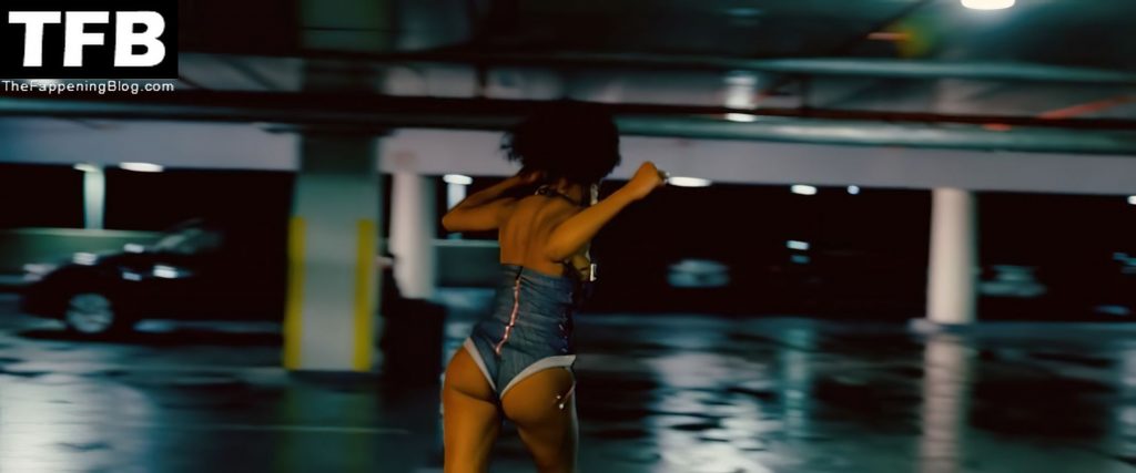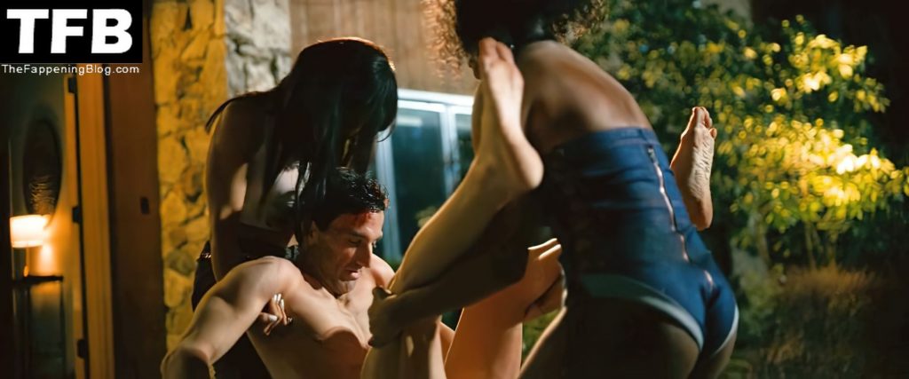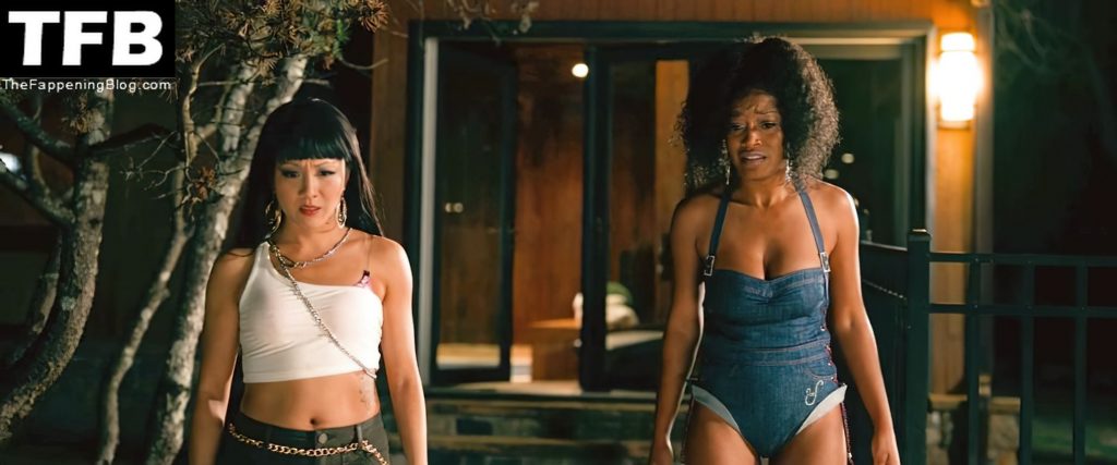 Keke Palmer, famosa por “Berlin Station” y “Scream Queens”, lleva un body de mezclilla estilo jean azul con una parte trasera tipo tanga mientras nos muestra varias veces su trasero y escote, invitando a Constance Wu al patio trasero donde hay un hombre desnudo inconsciente en el suelo junto a la piscina antes de inclinarse para agarrarlo y llevarlo a un auto, colocándolo en la parte trasera mientras Lili Reinhart observa; luego comienzan a sacarlo del auto en otro edificio mientras Keke observa, se asusta y finalmente sale corriendo.