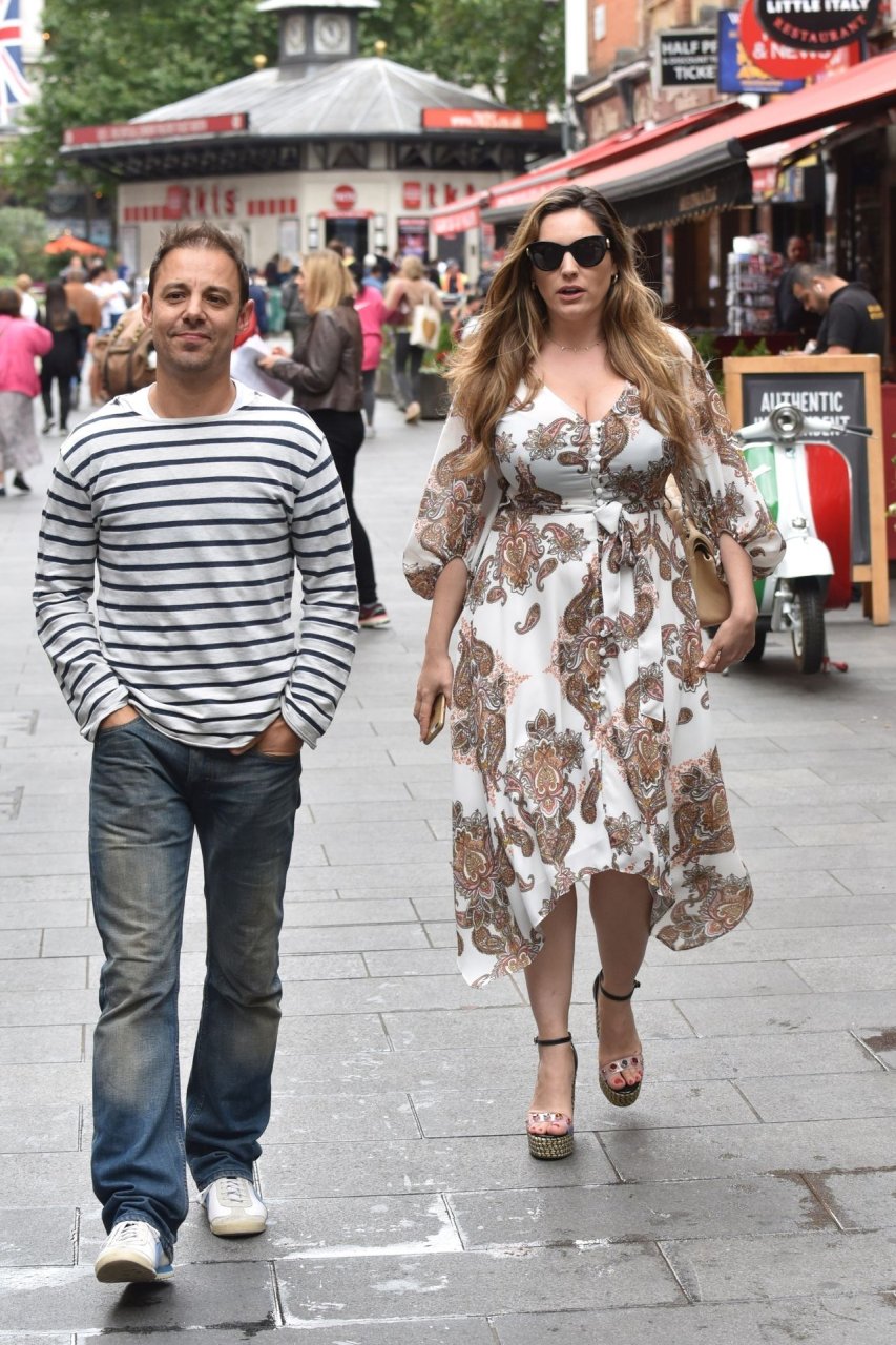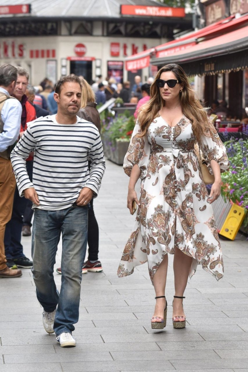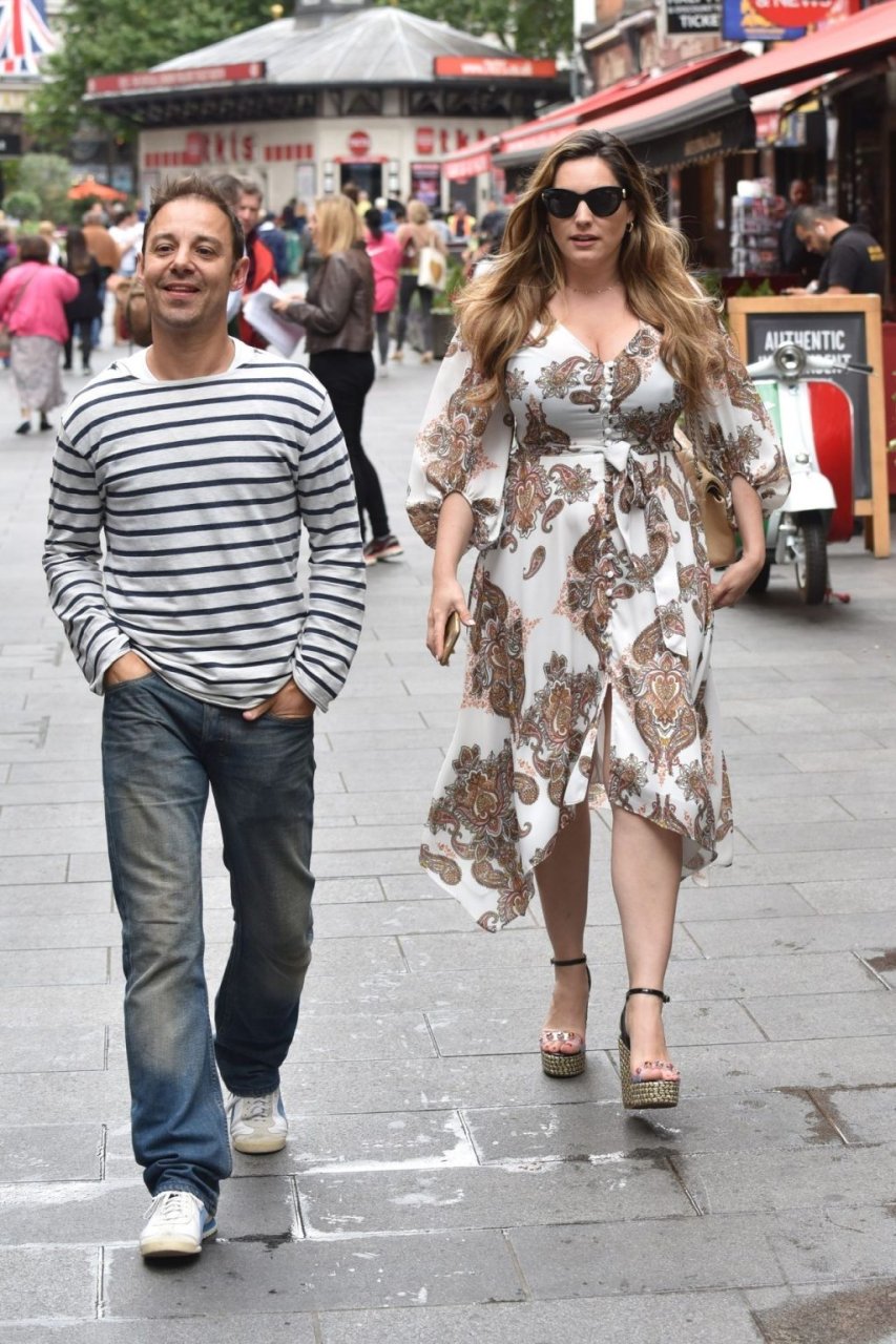 Presentadora de televisión, actriz, estrella de The Fappening Kelly Brook fue vista saliendo del estudio de Heart Radio vistiendo un vestido de verano estilo cachemira en Londres, 15/07/2019.