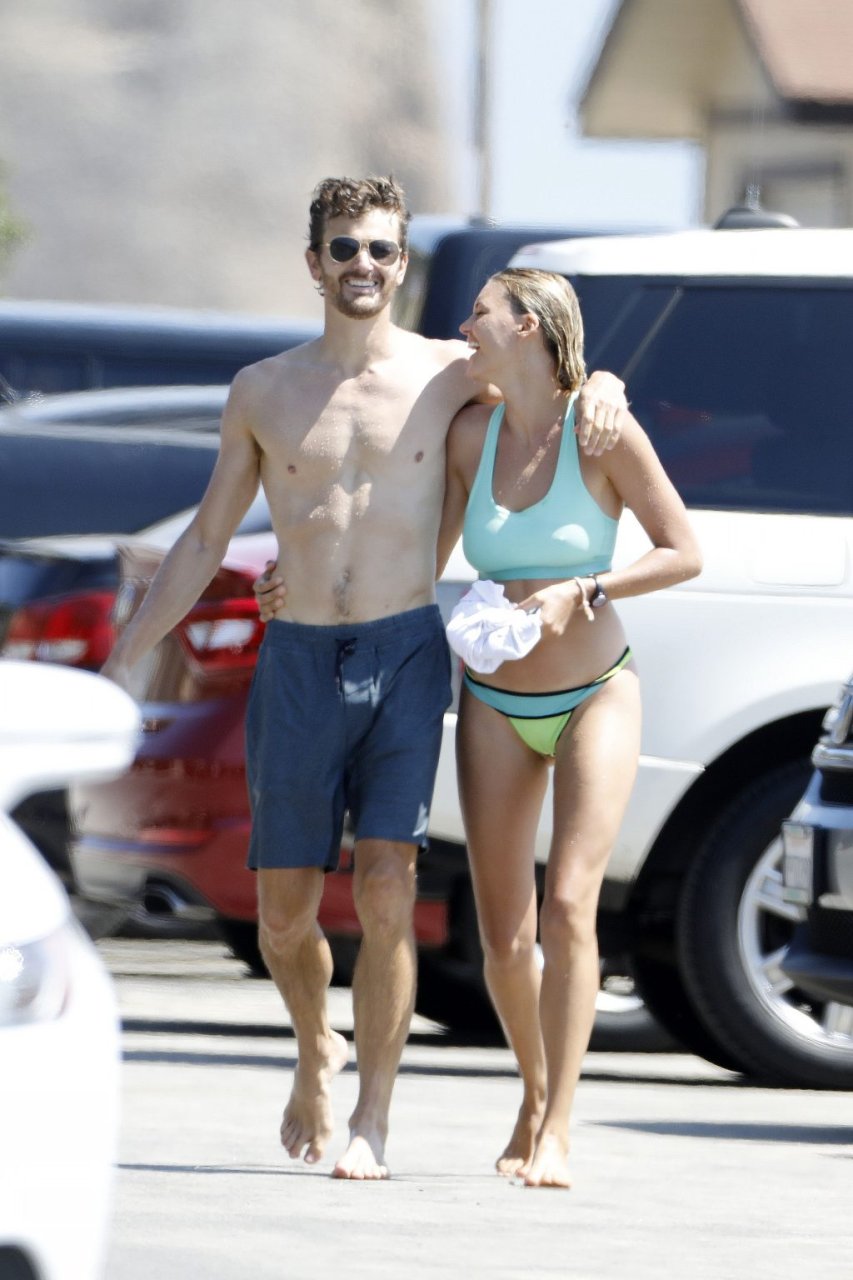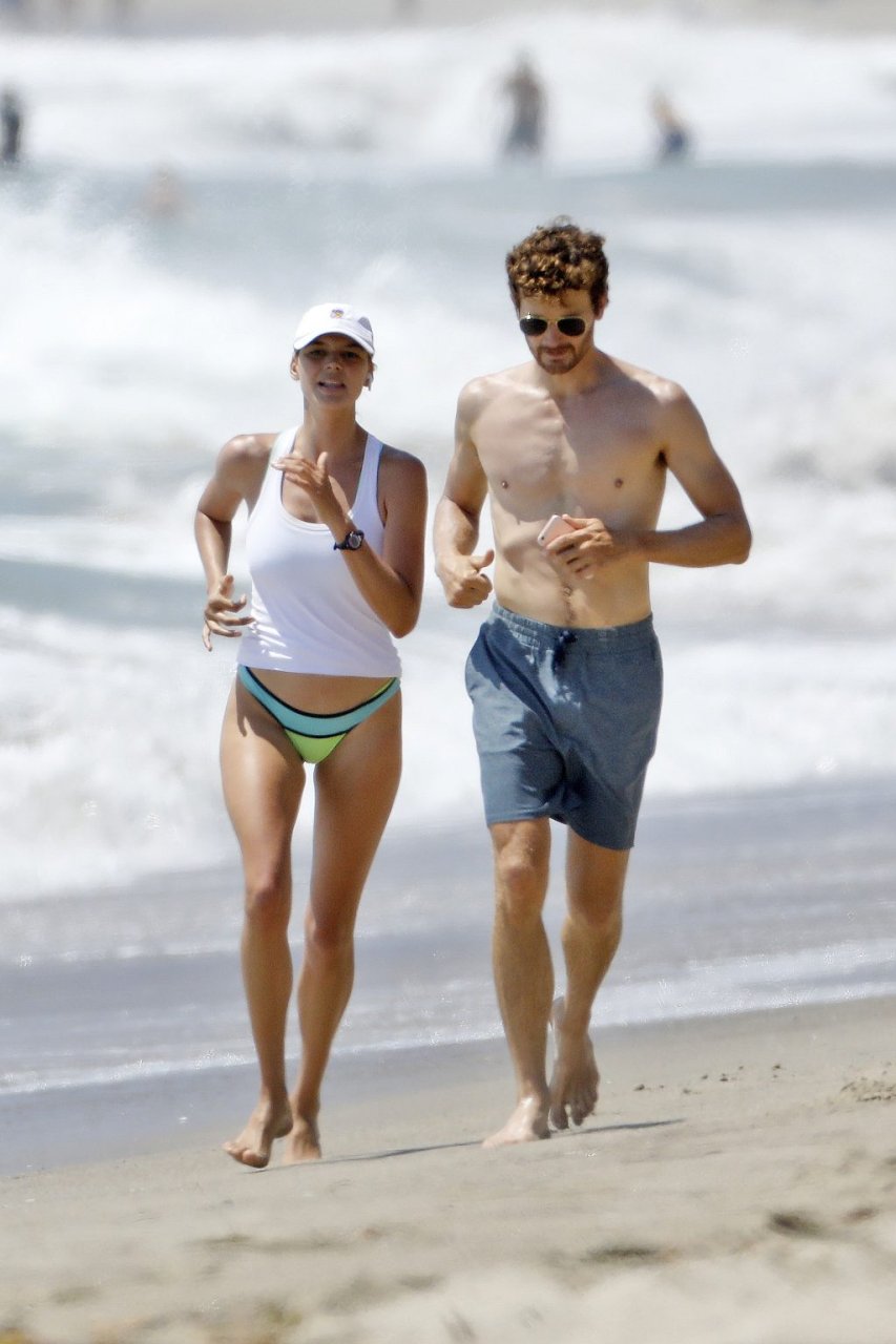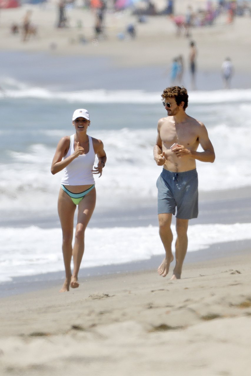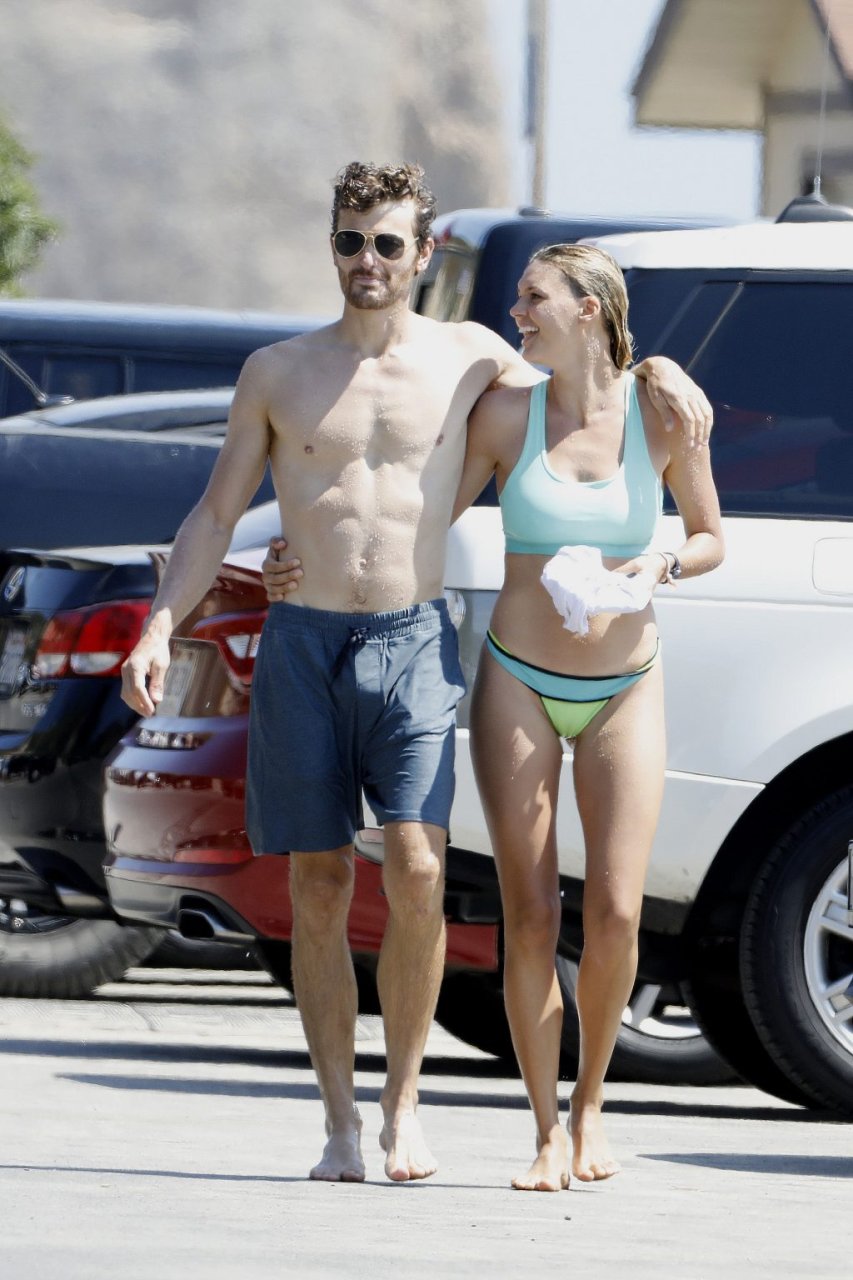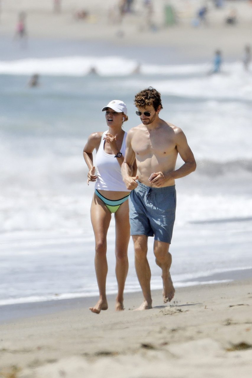 La actriz y modelo estadounidense Kelly Rohrbach (28) lleva a su novio Steuart Walton a correr y se da una ducha sexy en bikini en la playa de Malibu, California, 01/08/2018.