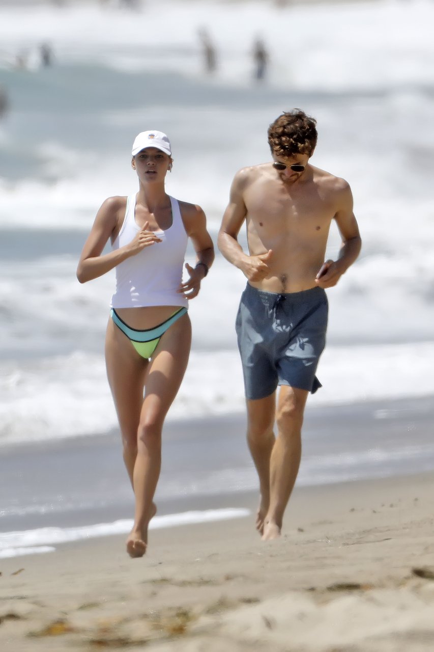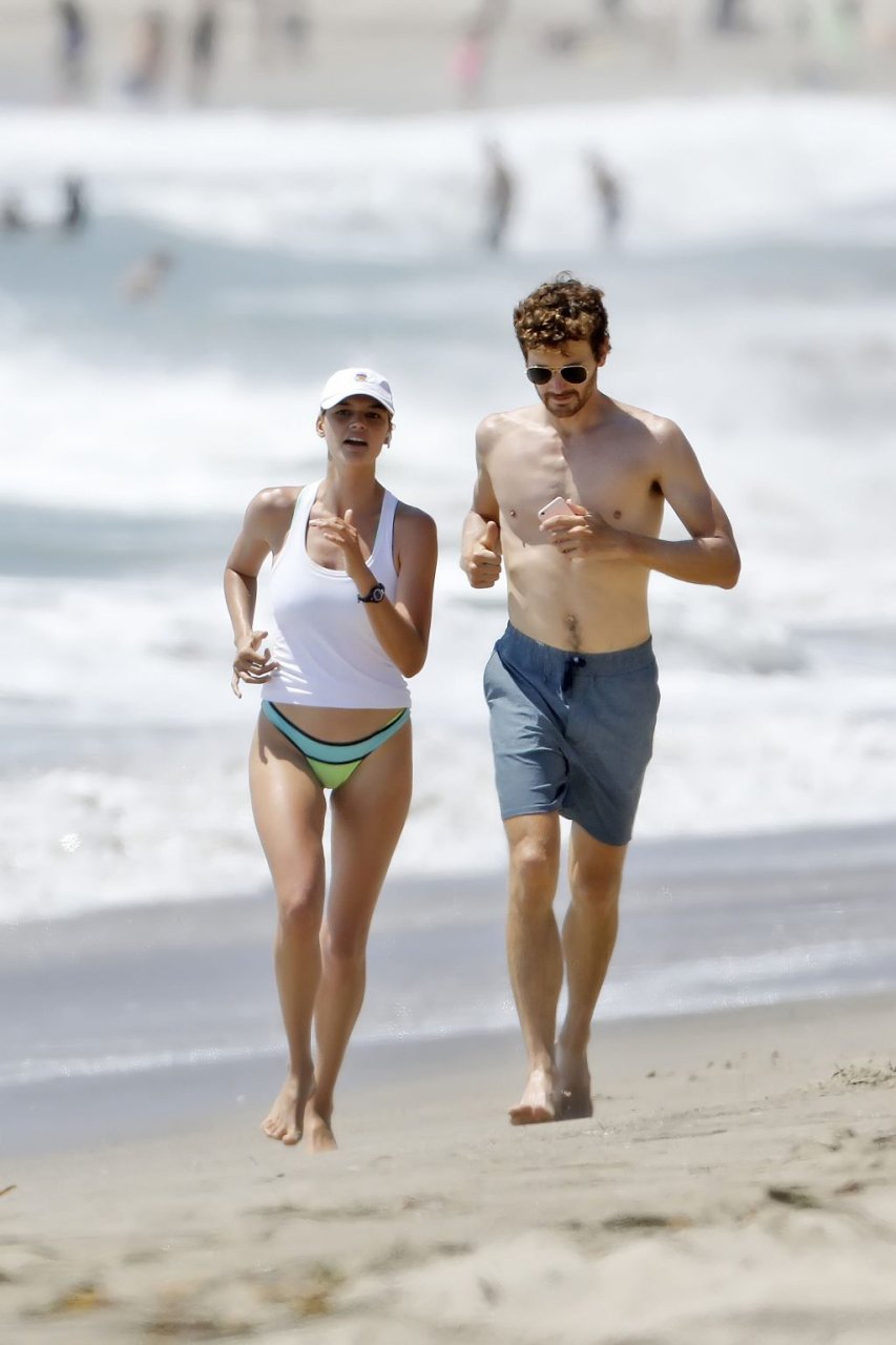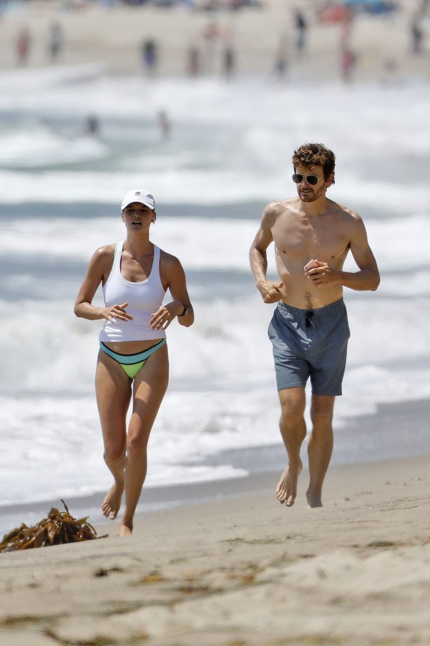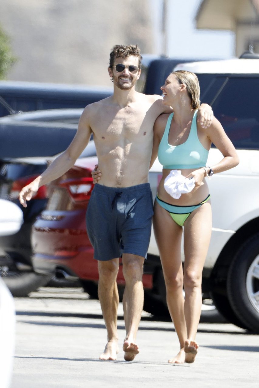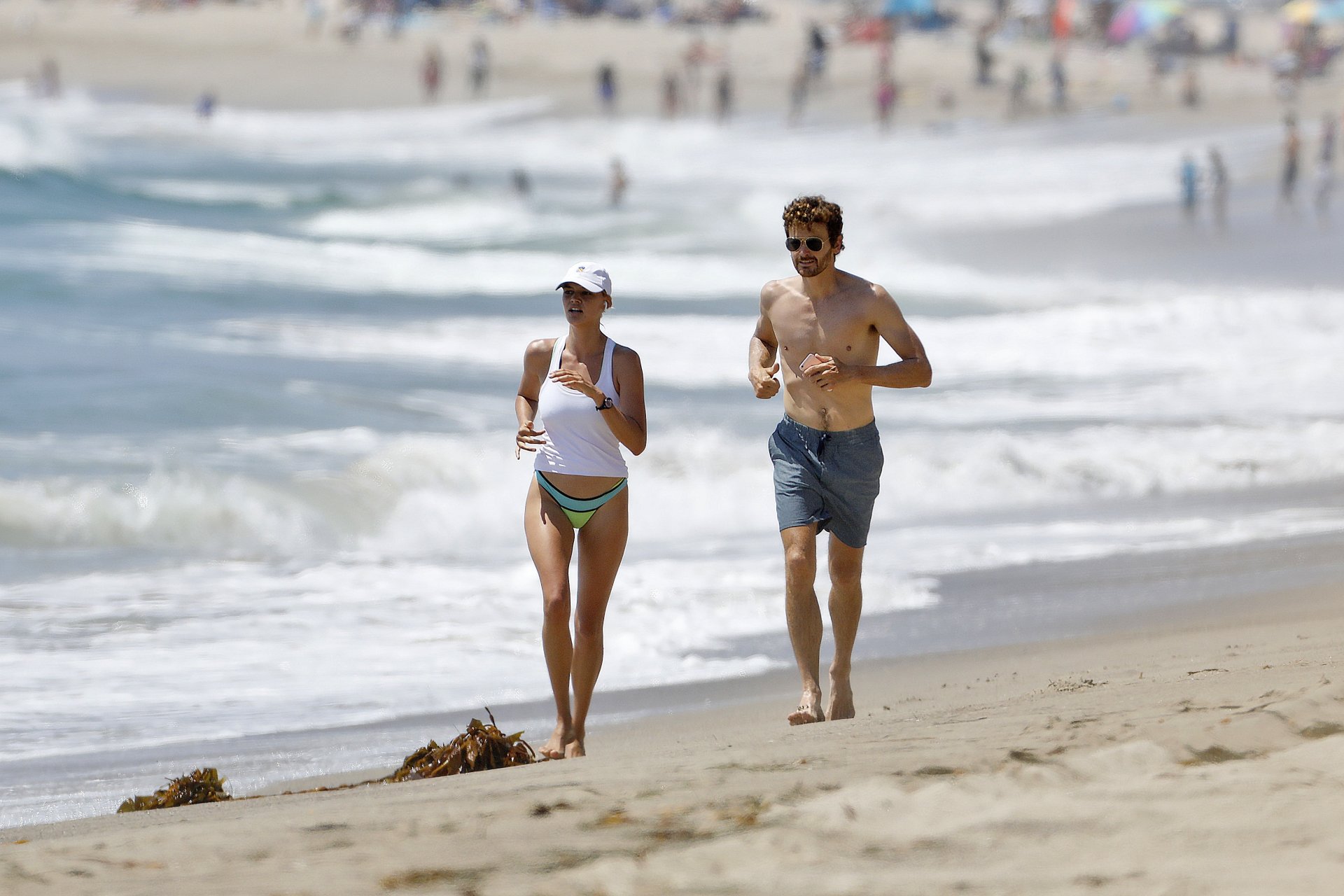 La actriz y modelo estadounidense Kelly Rohrbach (28) lleva a su novio Steuart Walton a correr y se da una ducha sexy en bikini en la playa de Malibu, California, 01/08/2018.