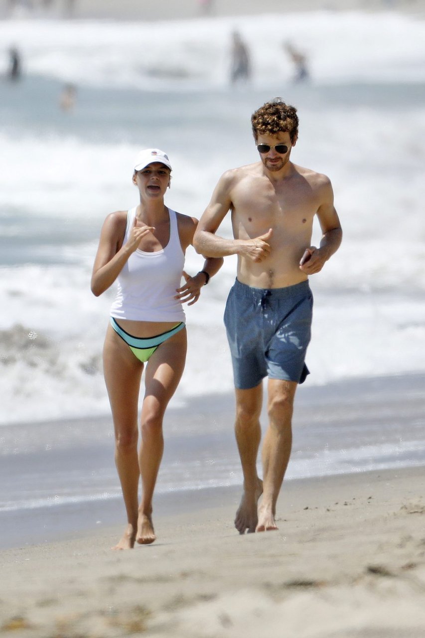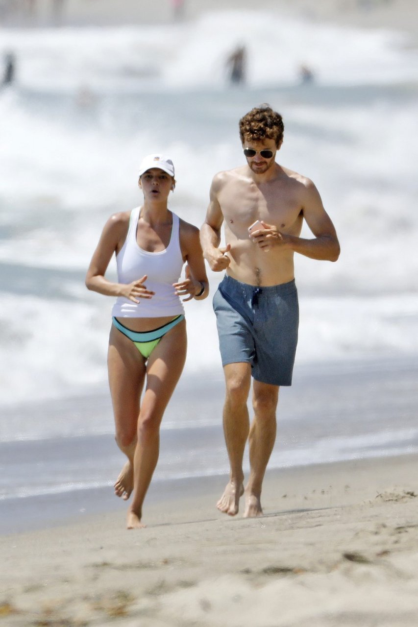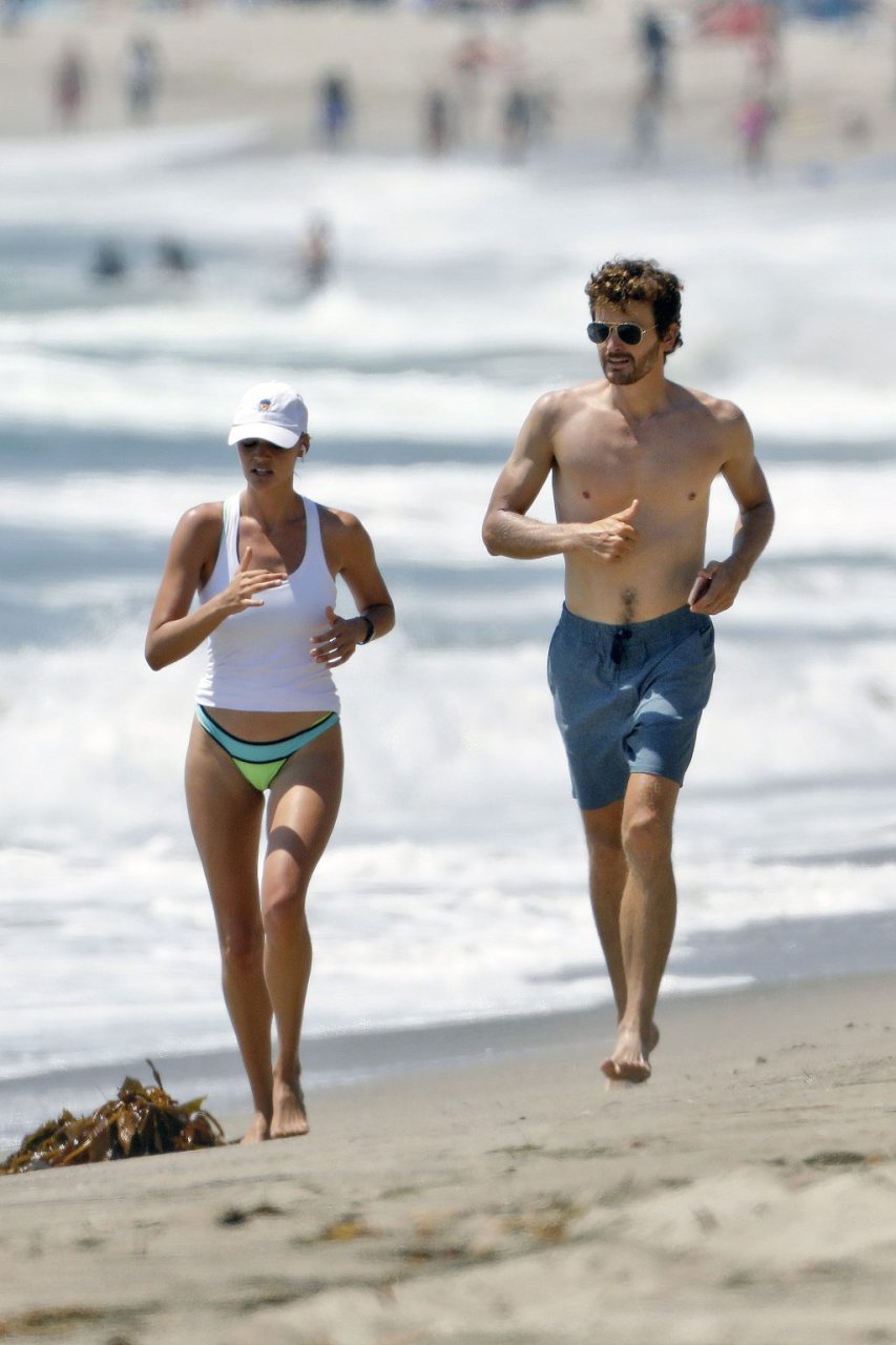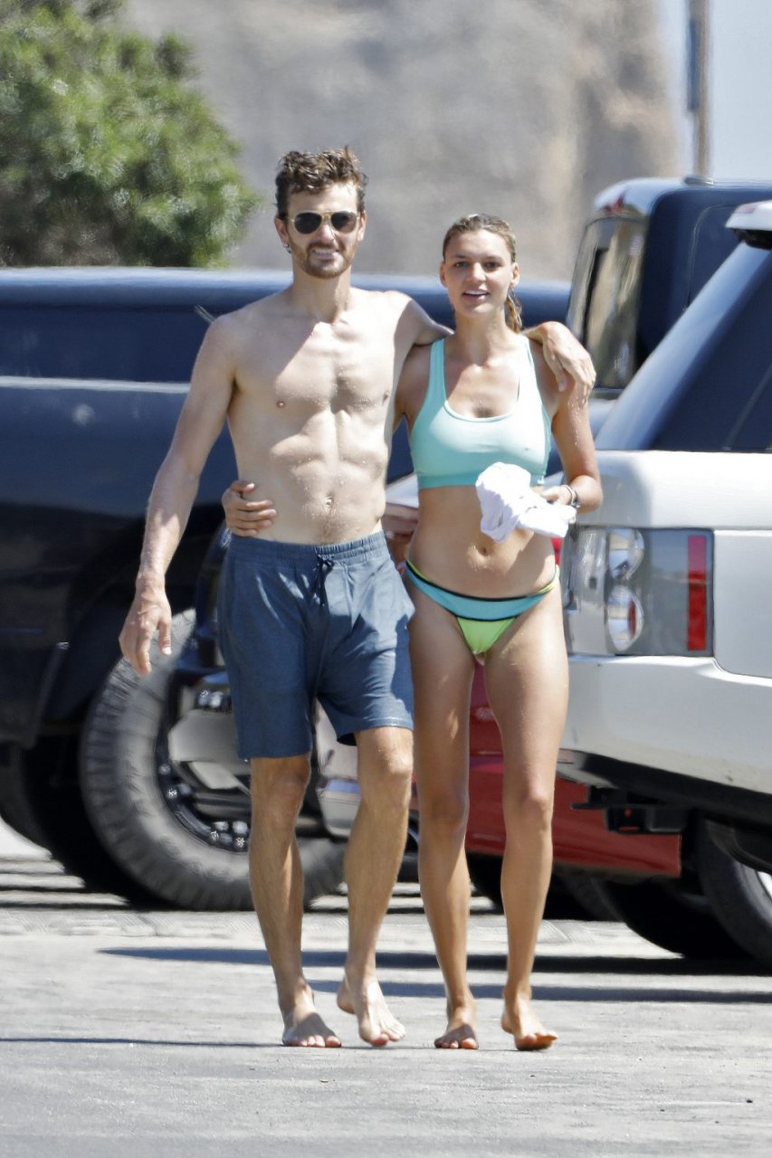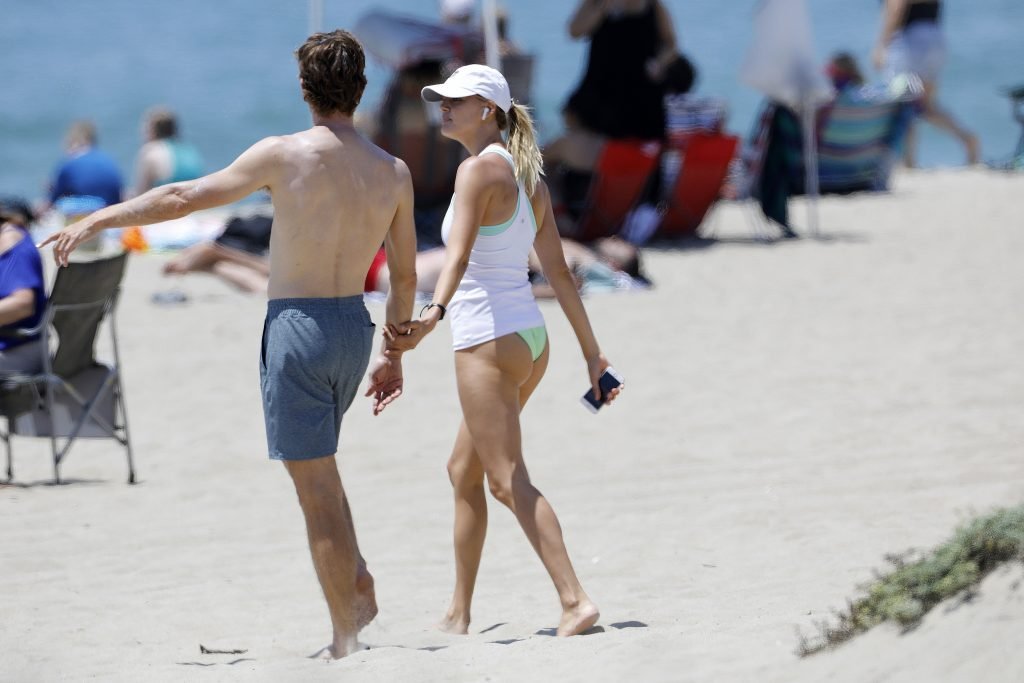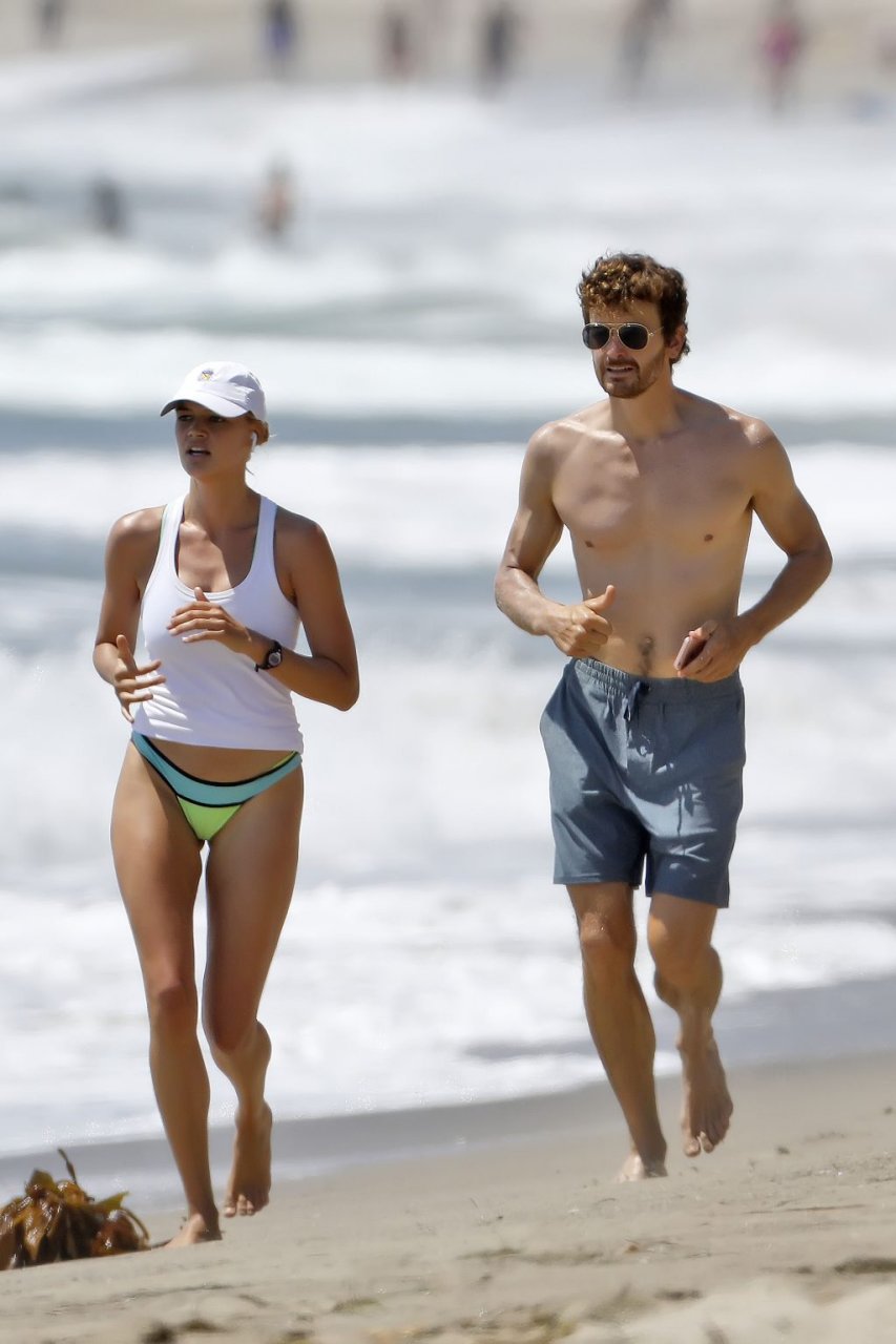 La actriz y modelo estadounidense Kelly Rohrbach (28) lleva a su novio Steuart Walton a correr y se da una ducha sexy en bikini en la playa de Malibu, California, 01/08/2018.