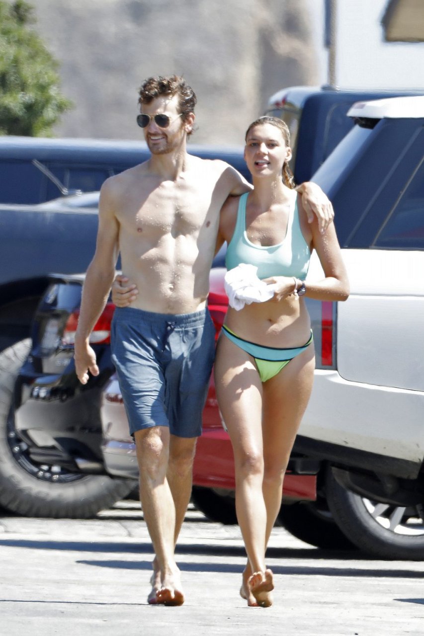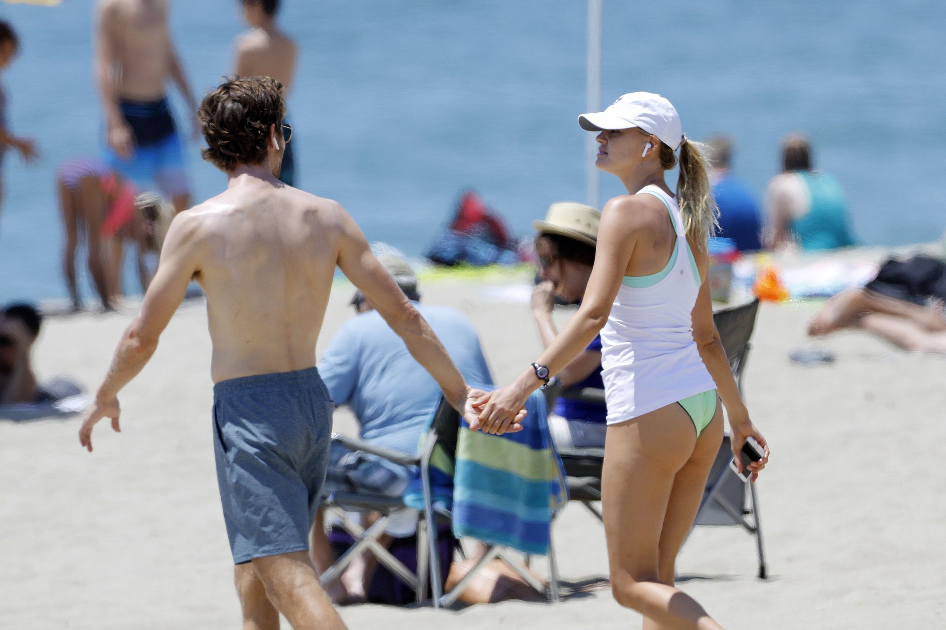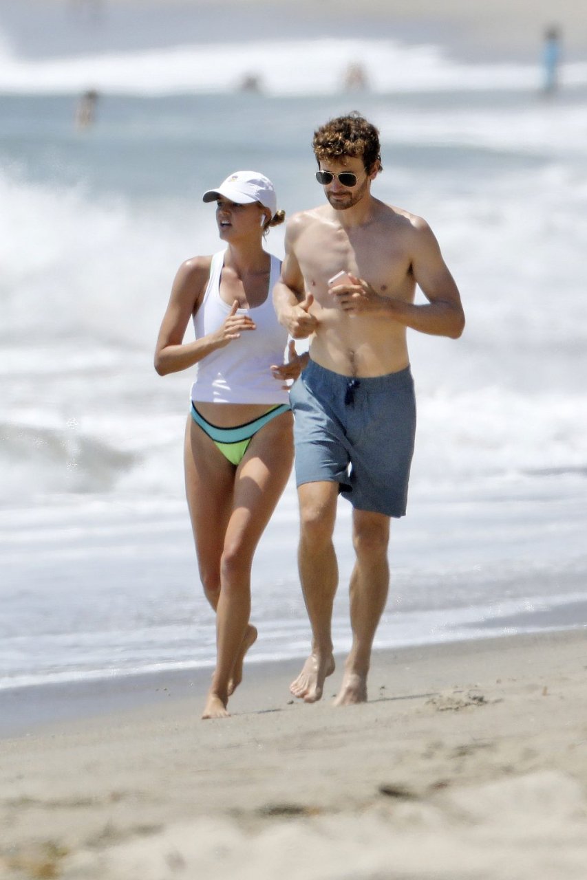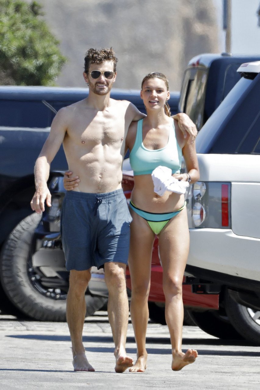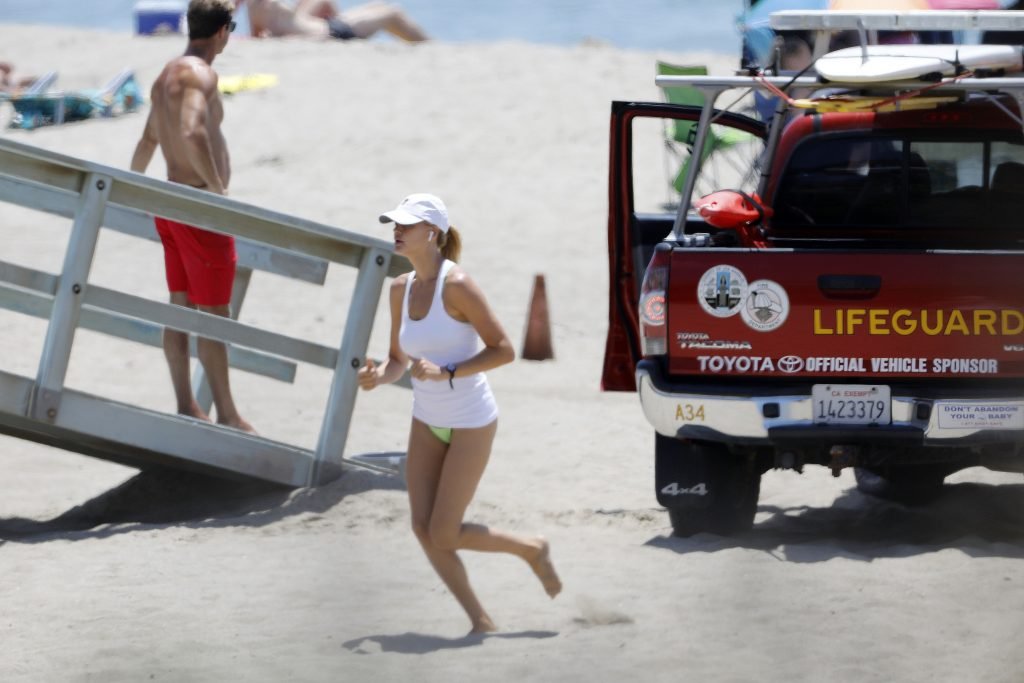La actriz y modelo estadounidense Kelly Rohrbach (28) lleva a su novio Steuart Walton a correr y se da una ducha sexy en bikini en la playa de Malibu, California, 01/08/2018.