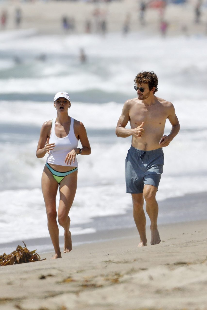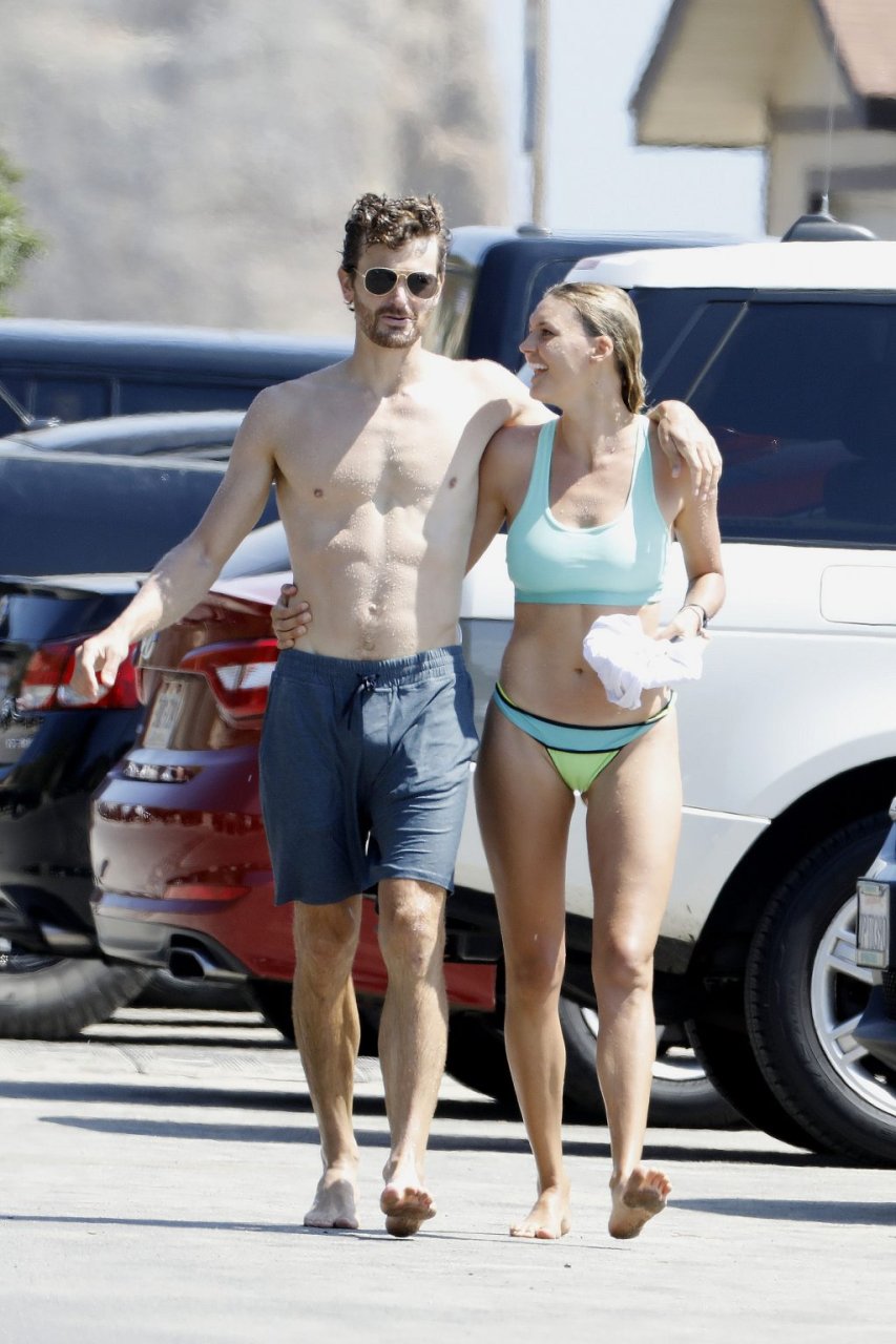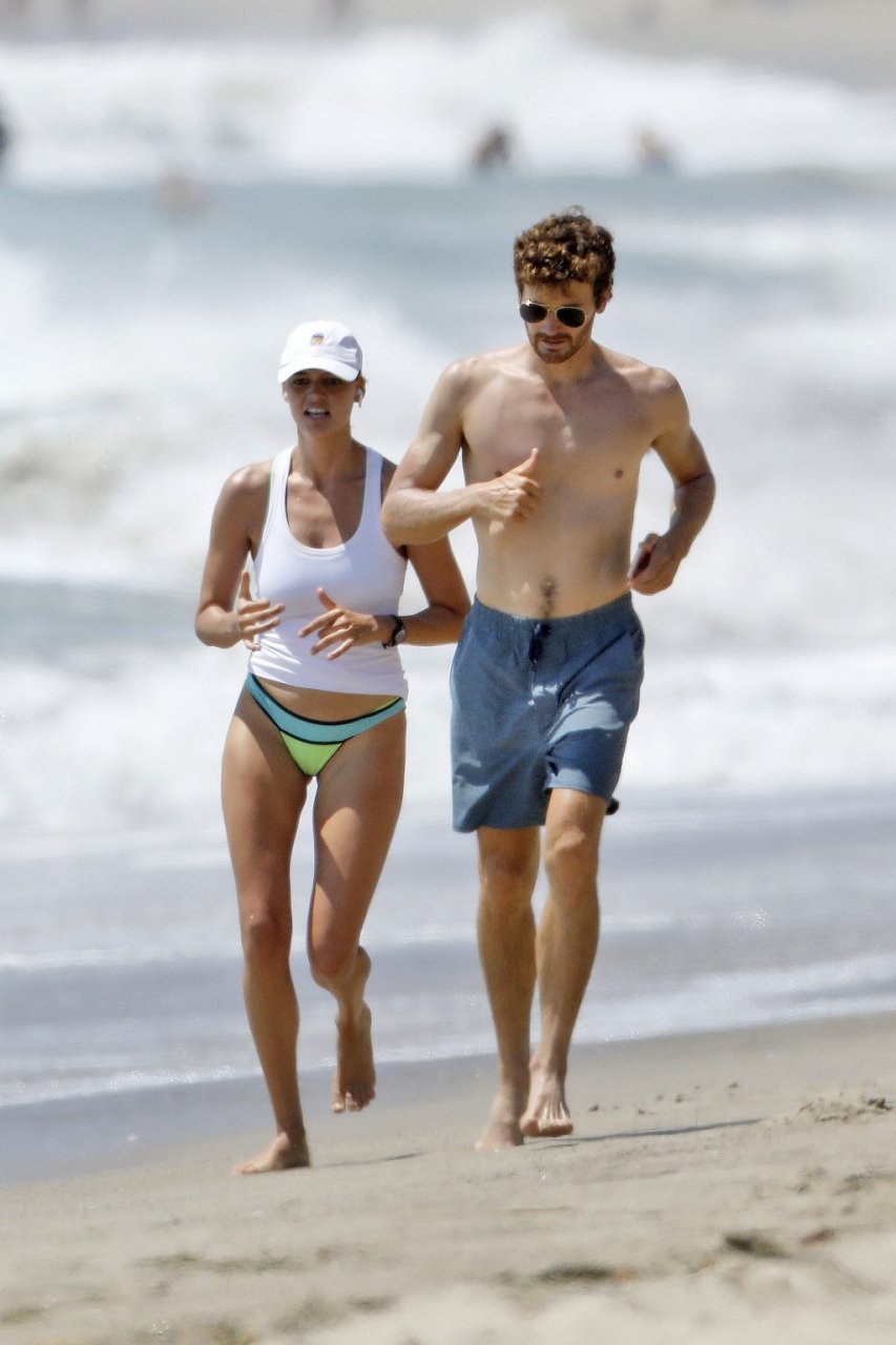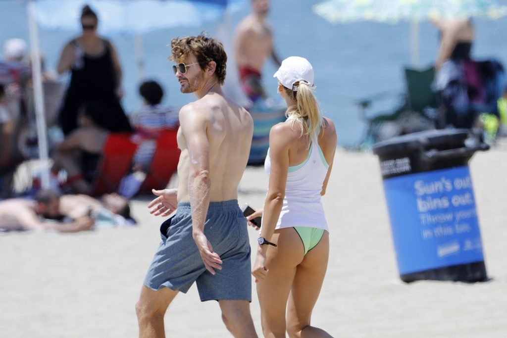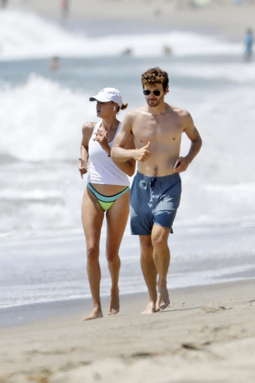 La actriz y modelo estadounidense Kelly Rohrbach (28) lleva a su novio Steuart Walton a correr y se da una ducha sexy en bikini en la playa de Malibu, California, 01/08/2018.